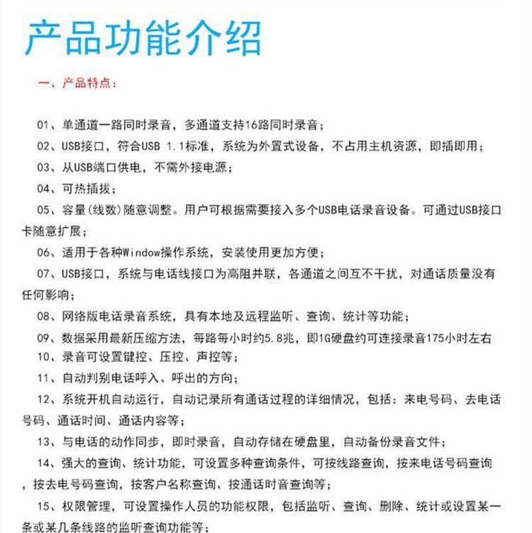 Изысканное изготовление, отсутствие необходимости в мощности, удобной эксплуатации, четкой записи, супер -стабильной; поддерживающее управление программным обеспечением; поддерживающая ручная запись, автоматическая запись;Точное распознавание вызовов, автоматически различать числа FSK и DTMF и появляется на экране компьютераЭлектрическая информация о клиентах;Последовательно8 -часовой телефон -это всего лишь 200 -метровый жесткий диск;Групповой функция набора;Телефон новый и управляемый.