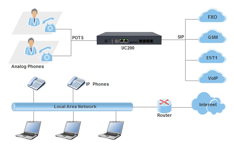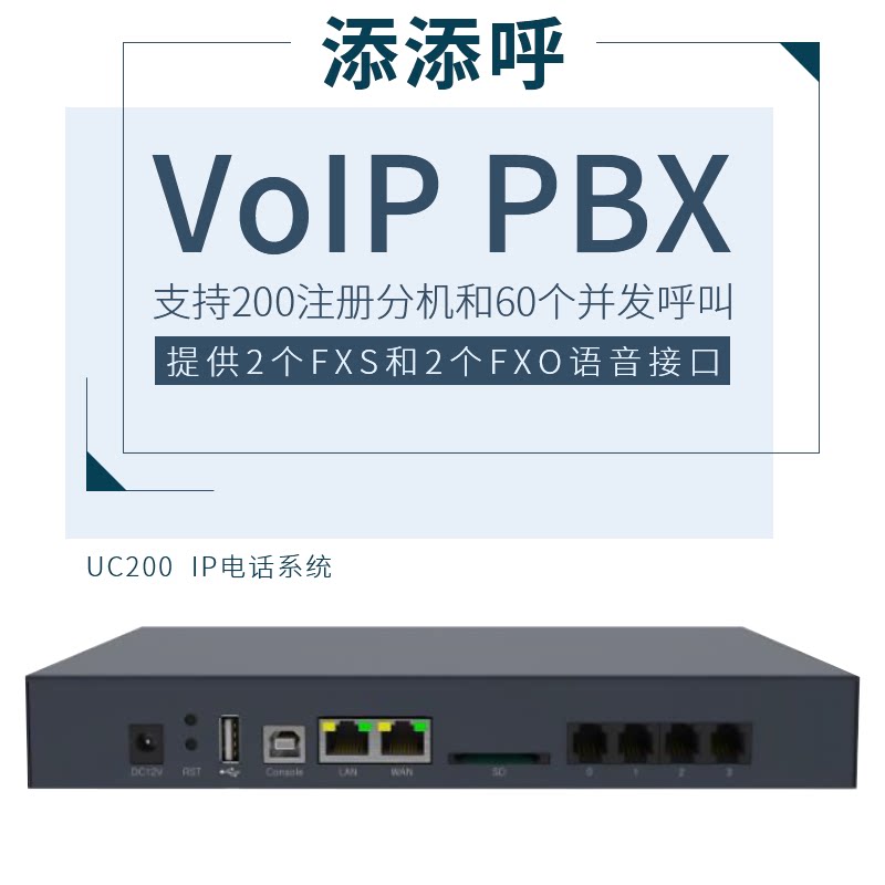 UC200 используется, чтобы помочь малым и средним предприятиям создать удобную и эффективную систему IP -телефона.Он предоставляет 2 FXS и 2 голосовых интерфейса FXO, поддерживает 200 зарегистрированных расширений и 30 вызовов. Он может добиться удаленной офисной работы с помощью расширения VoIP или для подключения к другим IPPBX или традиционным PBX для достижения диверсифицированных пользователей.