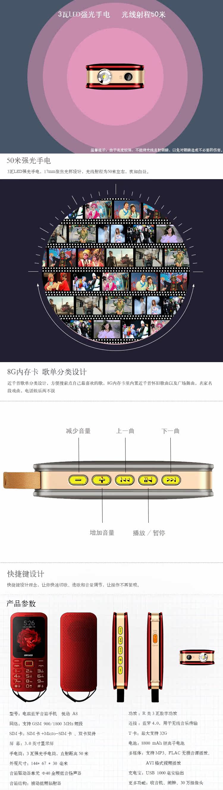 Аккумулятор емкостью 8800 мАч, бесплатная карта памяти 8G, встроенная память почти 1000 музыкальных песен, танцев и опер, 3,0-дюймовый экран, сабвуфер и динамик, поддержка функции Power Bank,Мощный фонарик, внешнее радио, динамик Bluetooth, эскиз, перекрестные помехи, функция воспроизведения фильмов и видео.