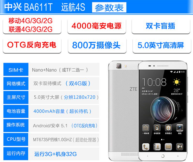 ZTE/ZTE BA611T YUANHANG 4S БОЛЬШОЙ АТКУСКОЙ АТКУСПОНТ 4000 MAH TELECOM 4G поддерживает смартфон OTG