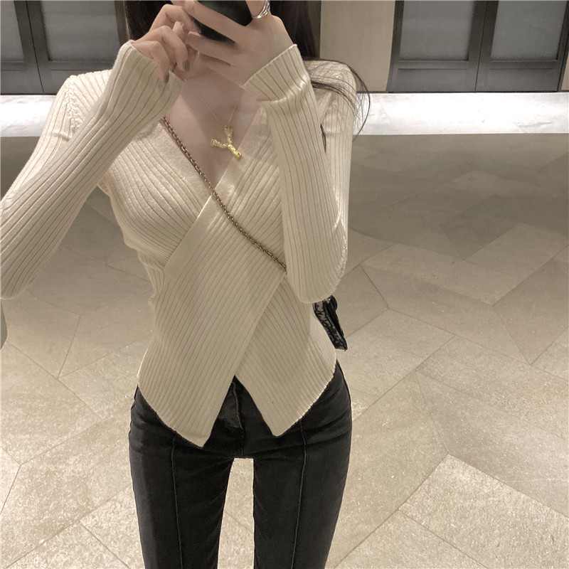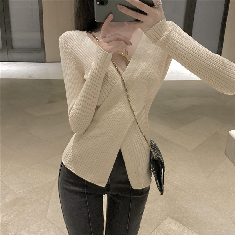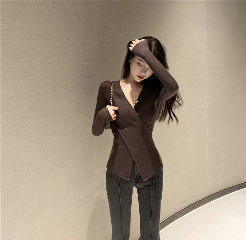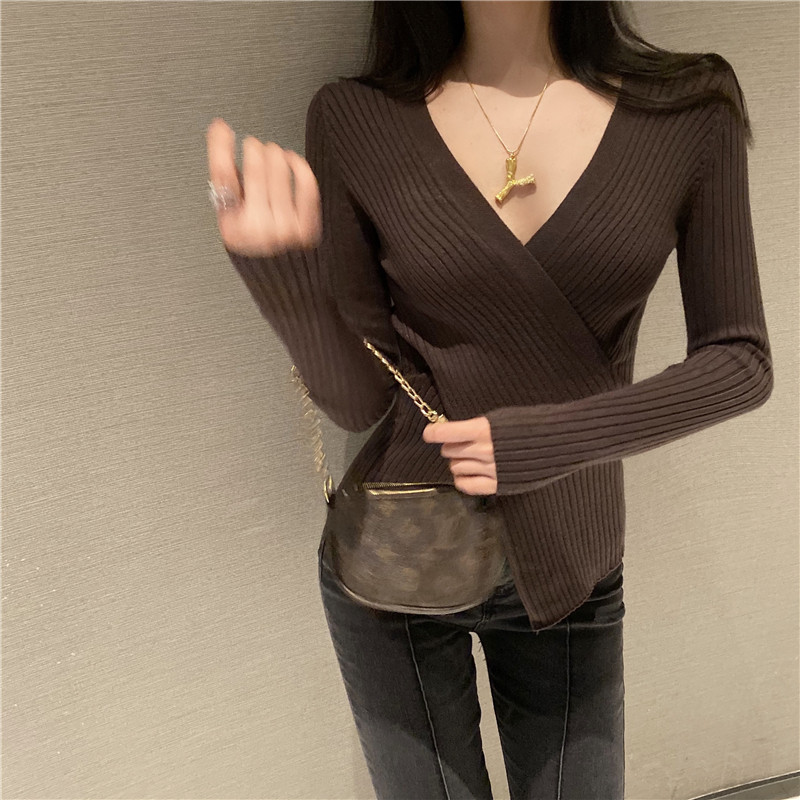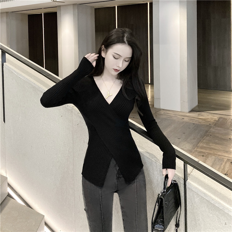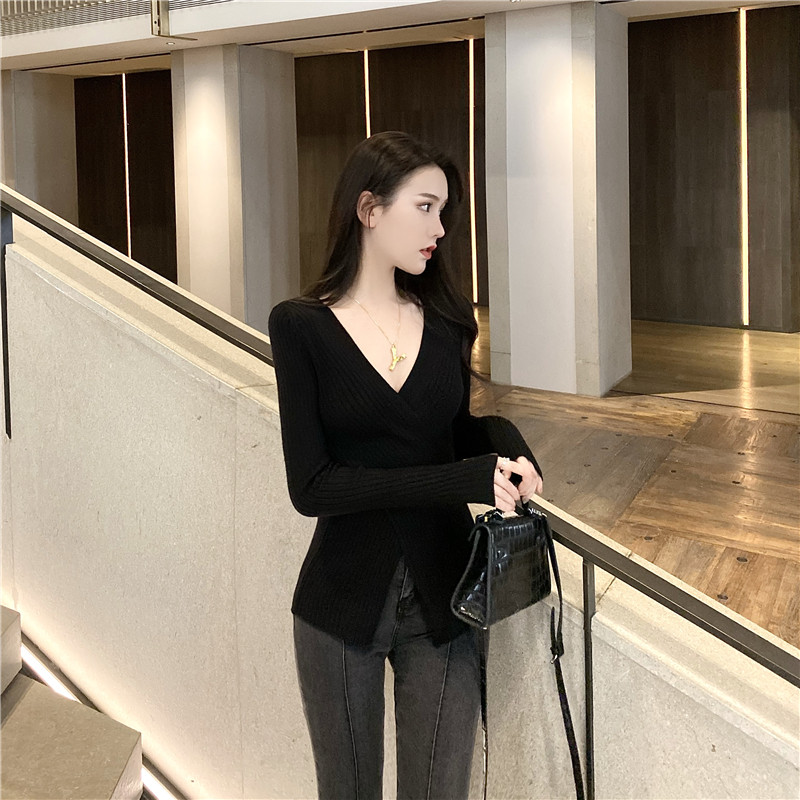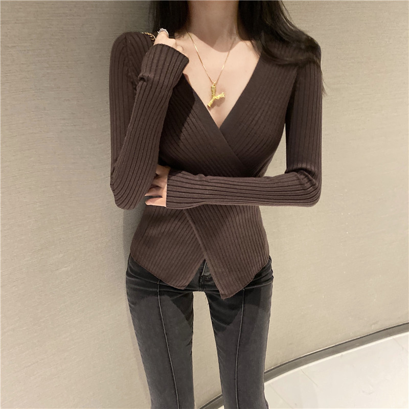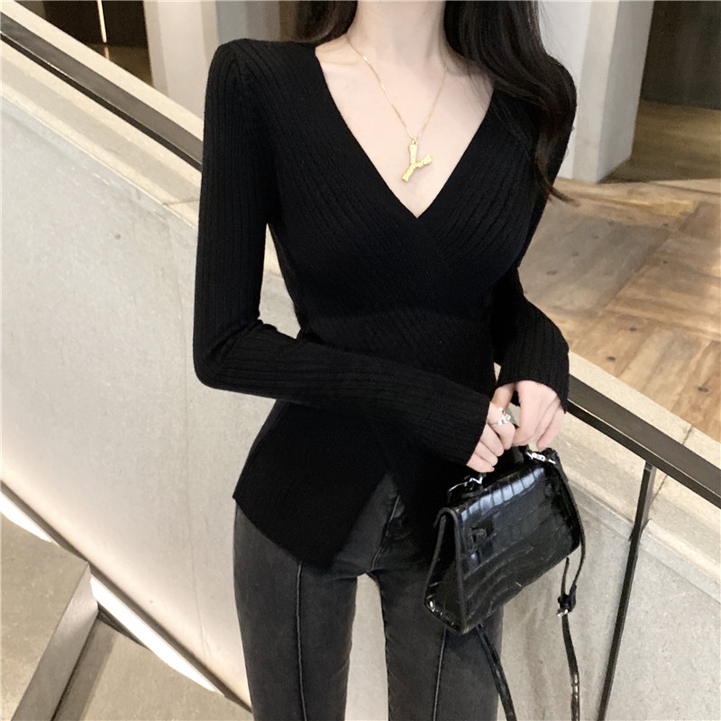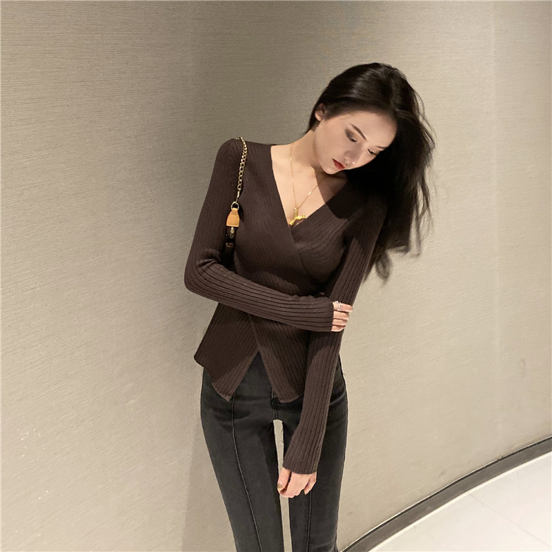 Осенний лонгслив, трикотажный базовый приятный телу свитер, 2020 года, в западном стиле, V-образный вырез