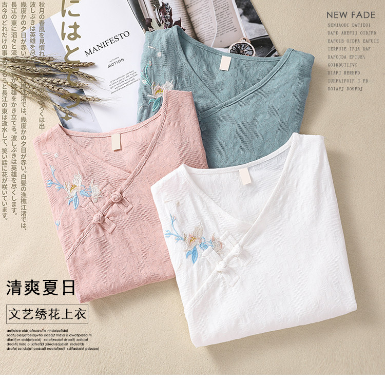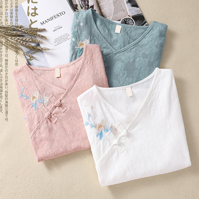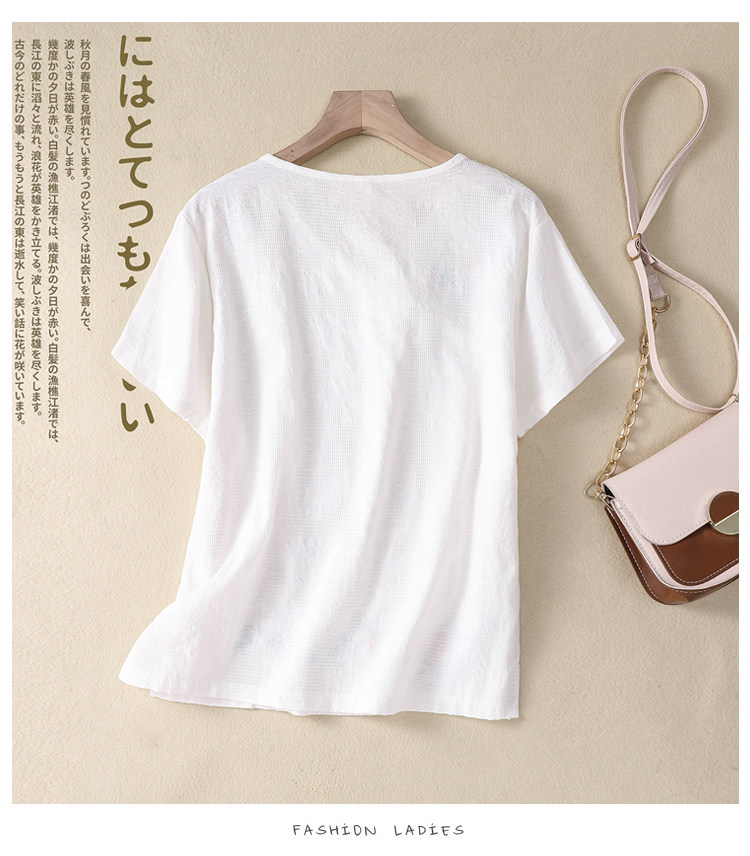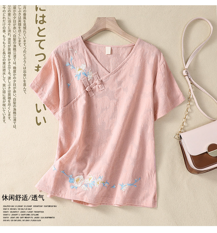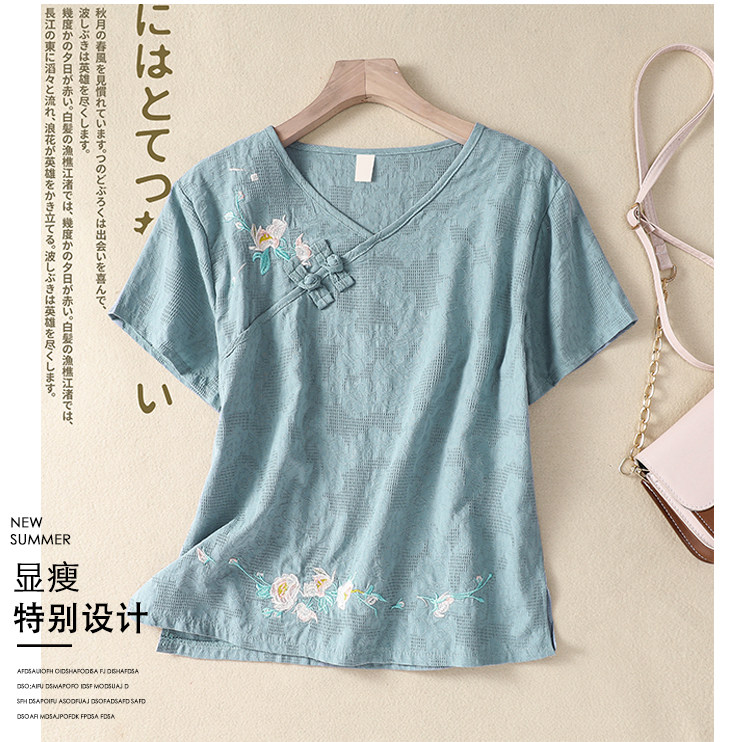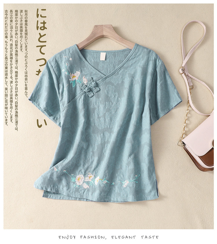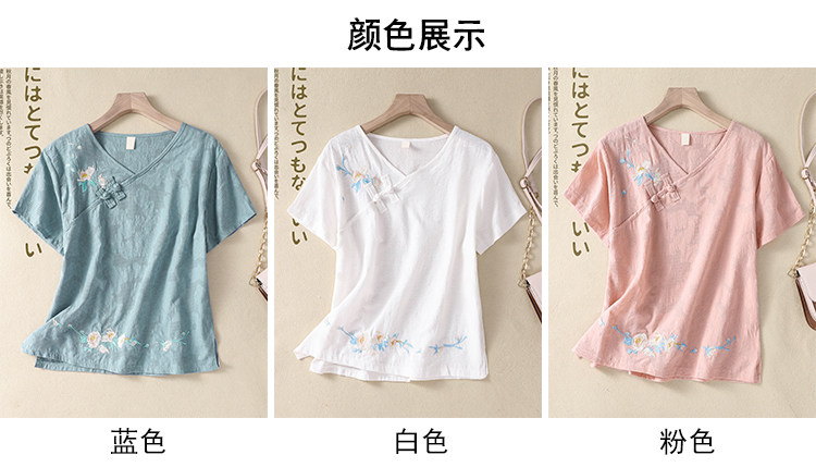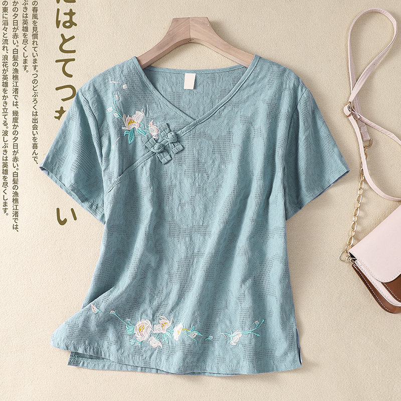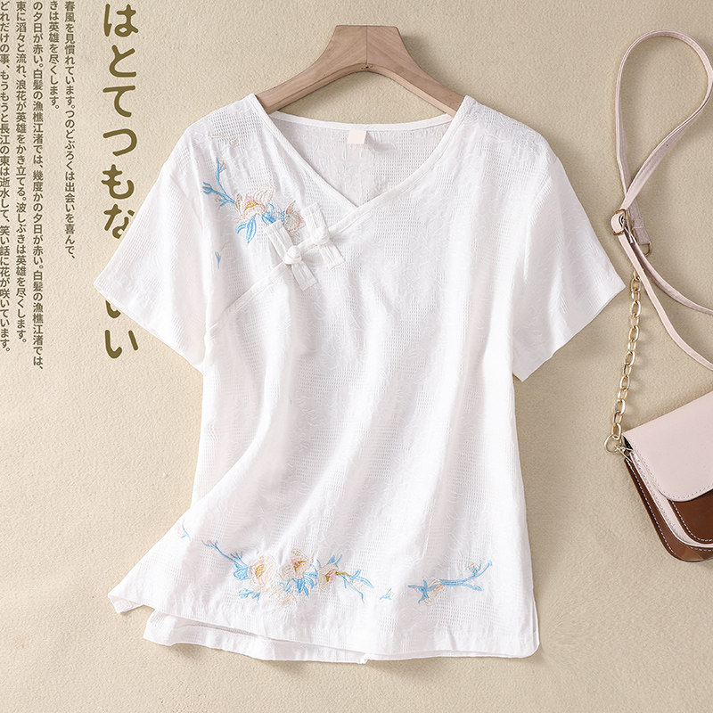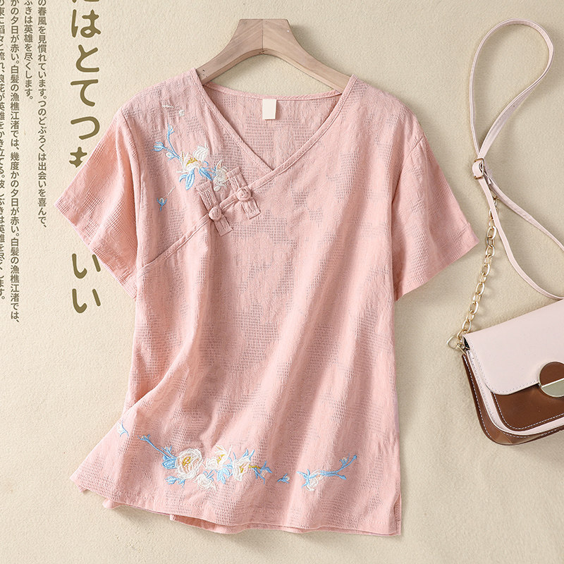(Трансграничная торговля), футболка с коротким рукавом, Италия, с вышивкой, V-образный вырез, из хлопка и льна