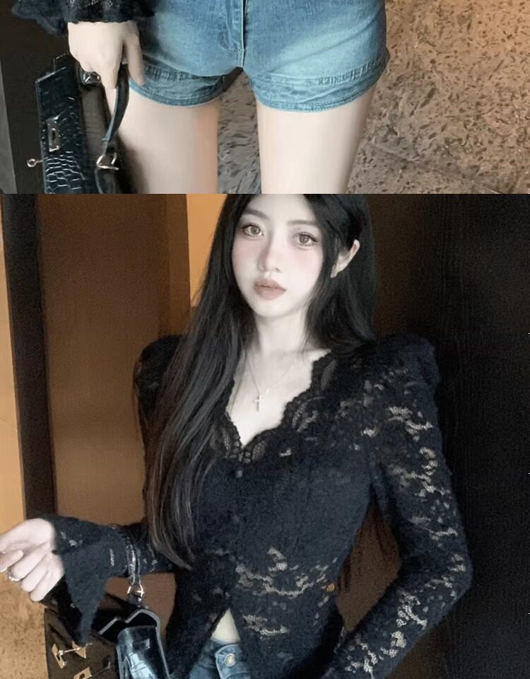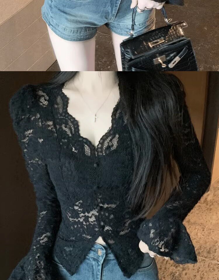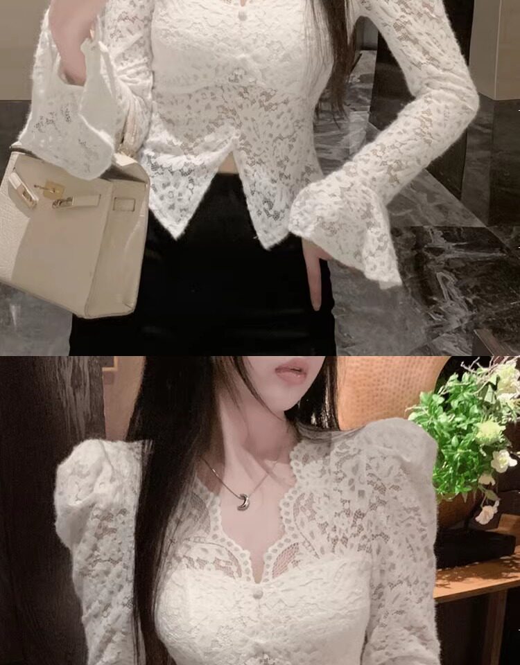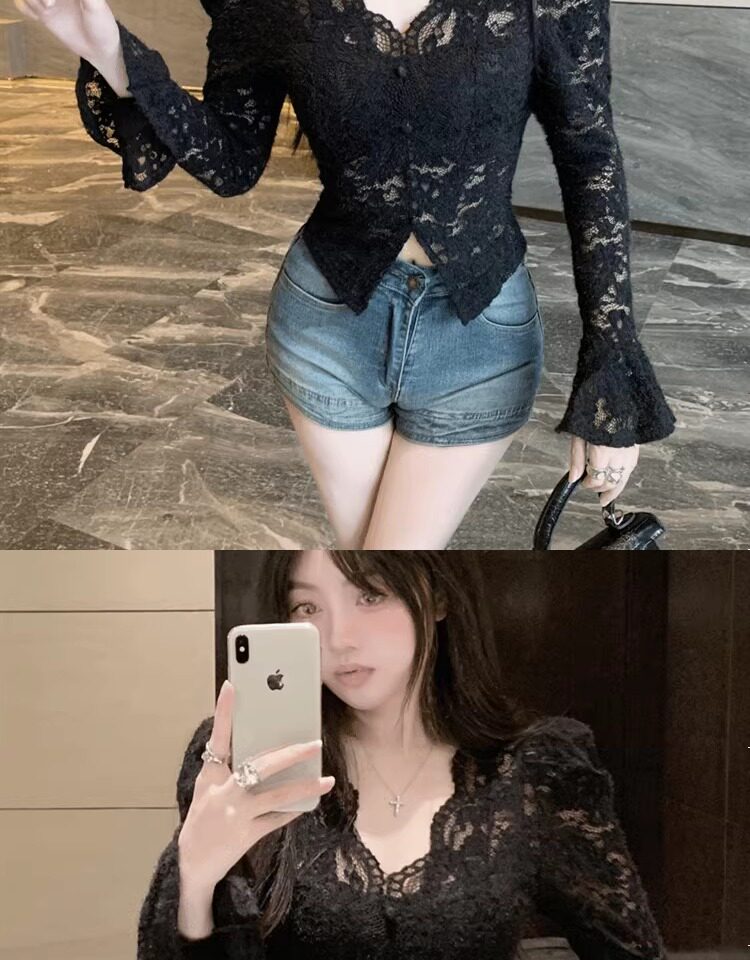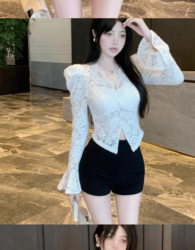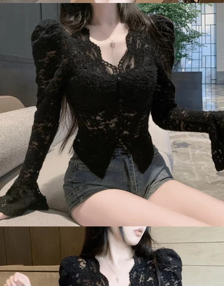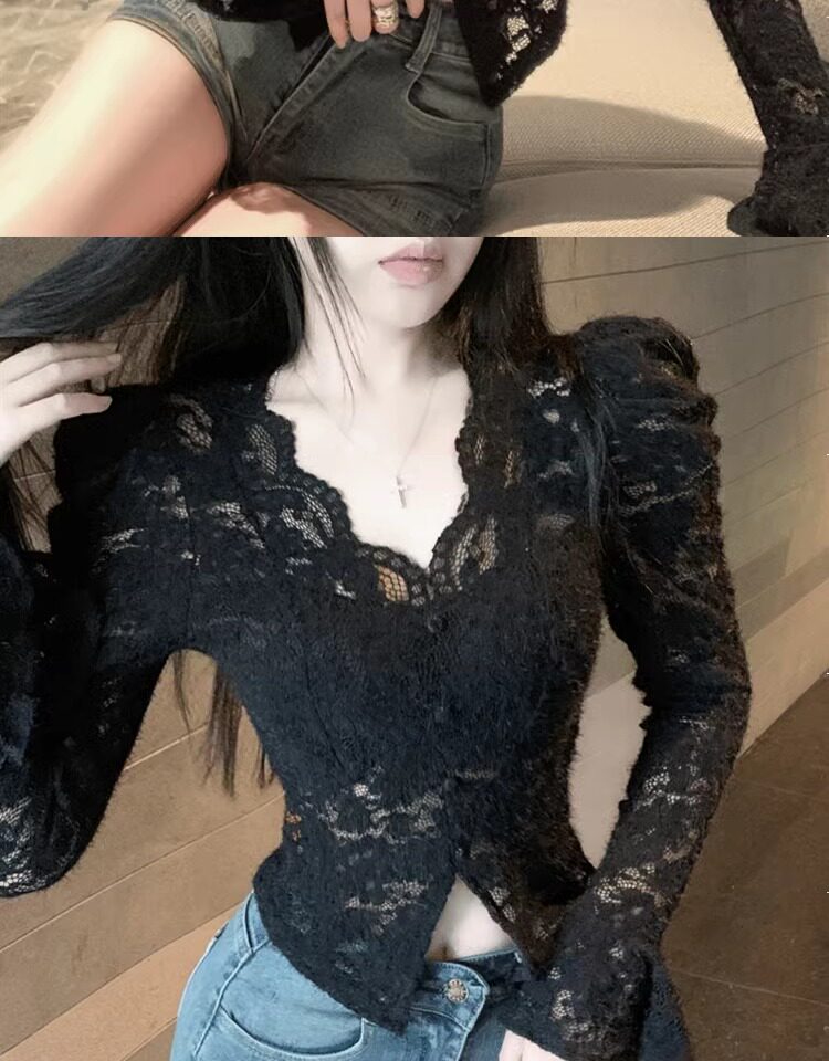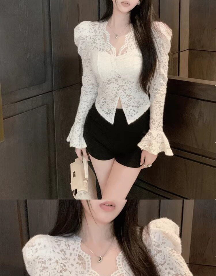 Кружевной шелковый приятный телу демисезонный сексуальный короткий корсет, V-образный вырез, рукава фонарики