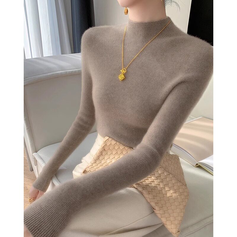 Зеленое цветное трикотажное приятное телу демисезонное термобелье, кашемировый шерстяной свитер, в западном стиле, изысканный стиль, высокий воротник
