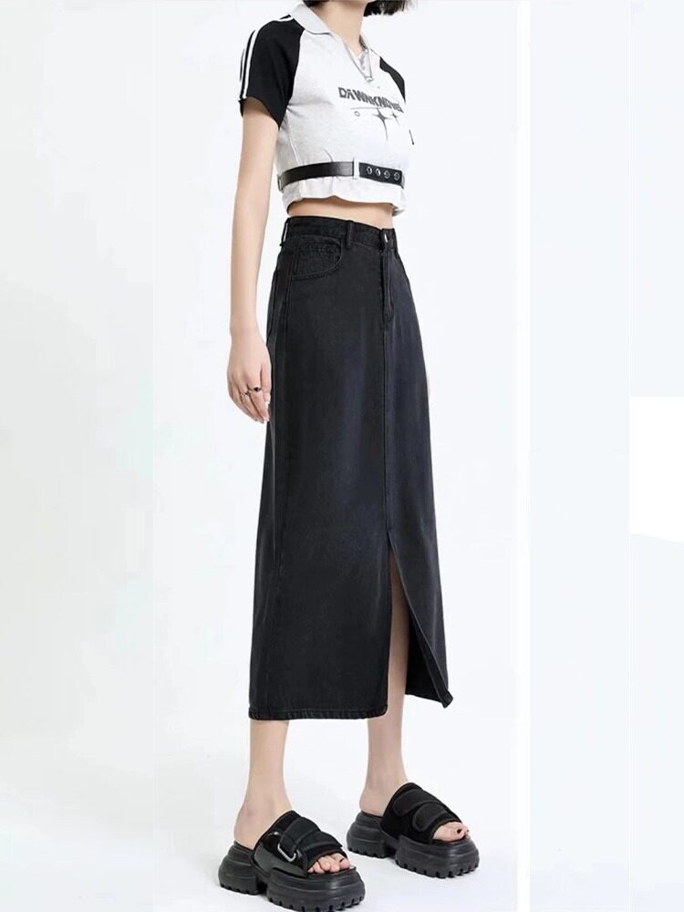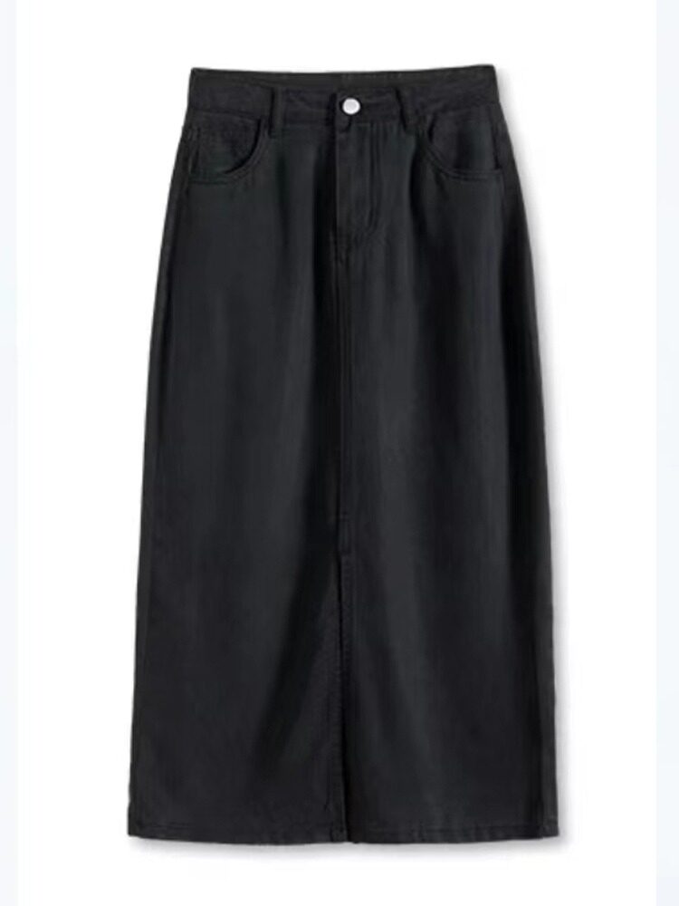 Черная летняя джинсовая юбка, высокая талия, длина миди, с акцентом на бедрах