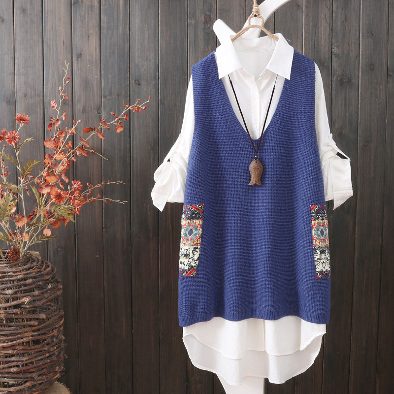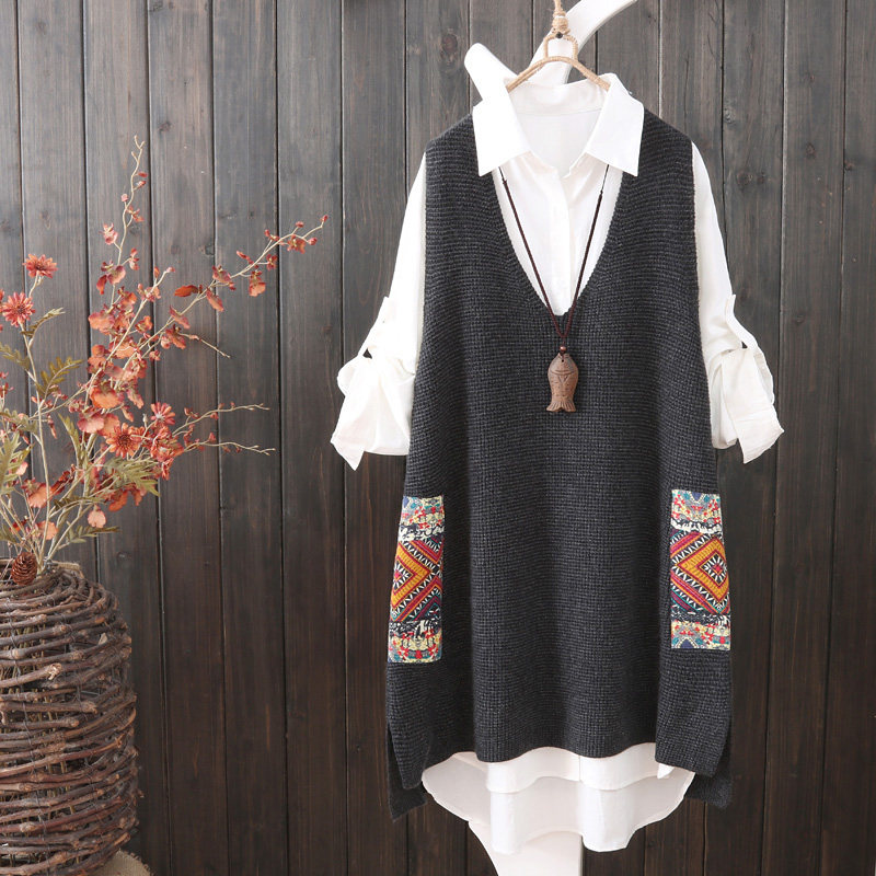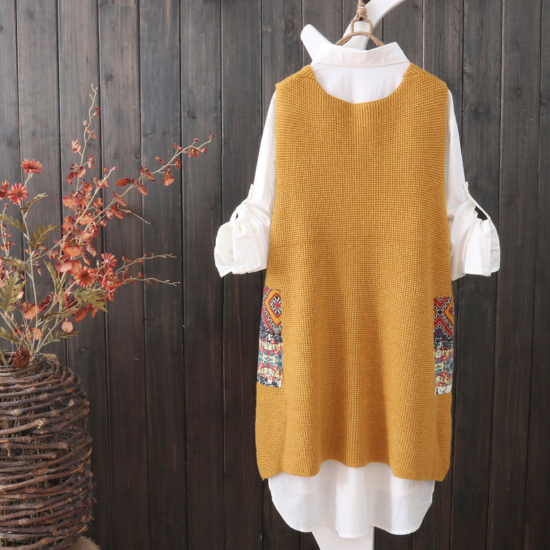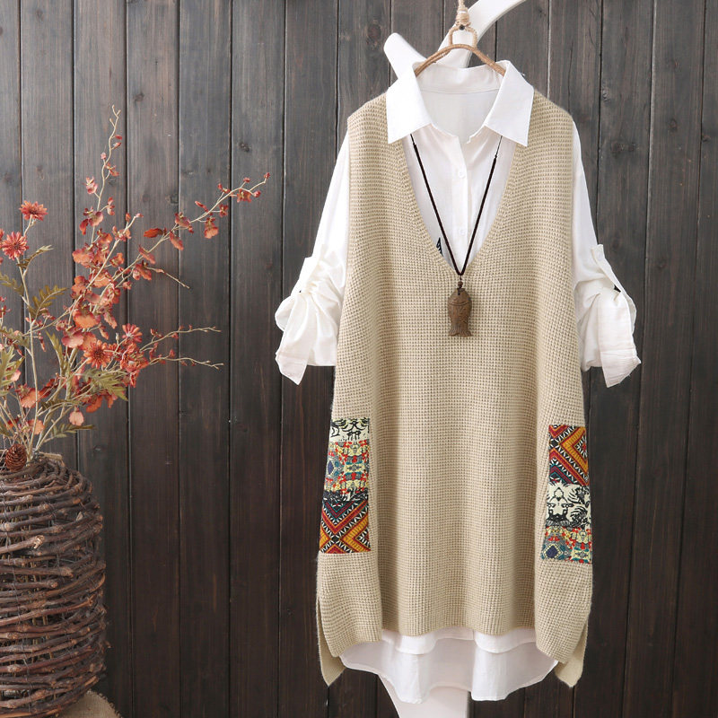 Осенний оригинальный трикотажный жилет, майка топ, этнический комплект для отдыха, длина миди, V-образный вырез, этнический стиль