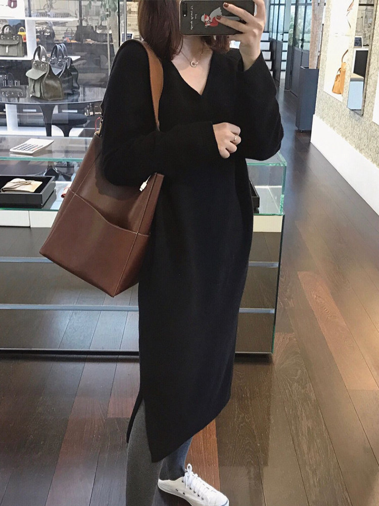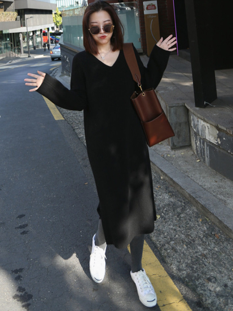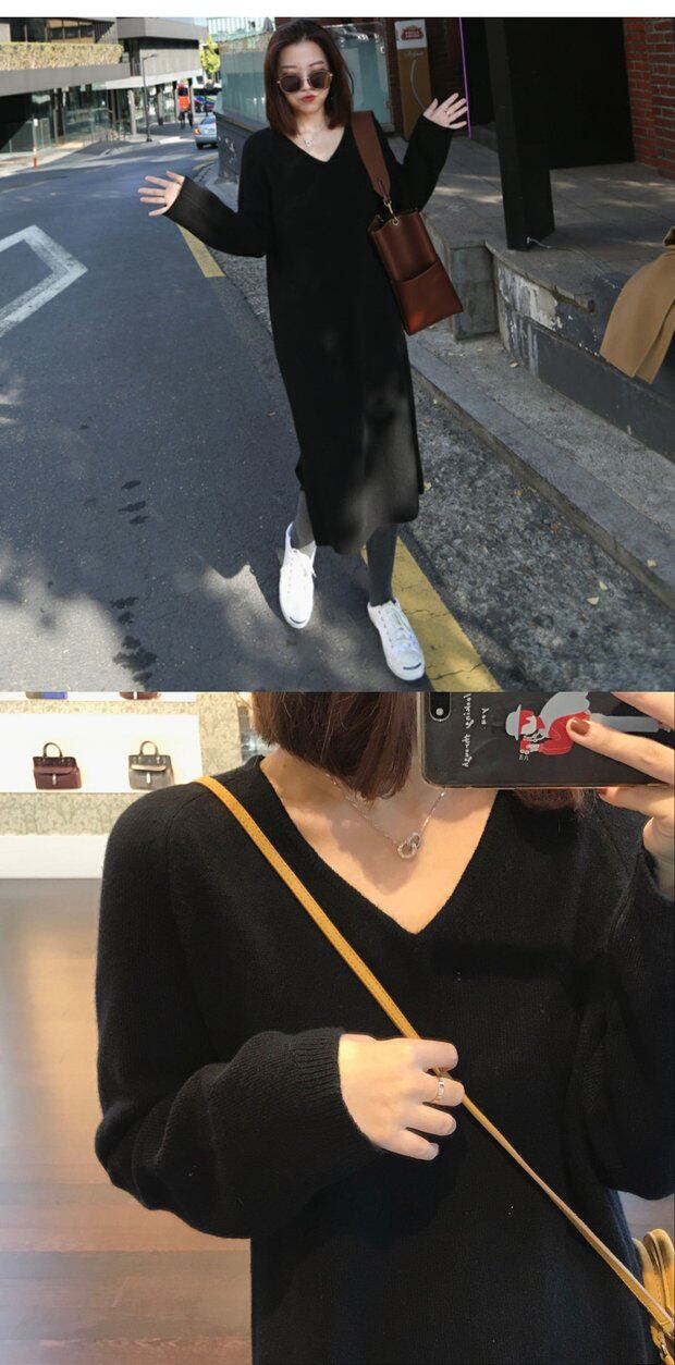 Демисезонный шерстяной бархатный длинный свитер, трикотажная длинная юбка, платье, V-образный вырез, средней длины, оверсайз