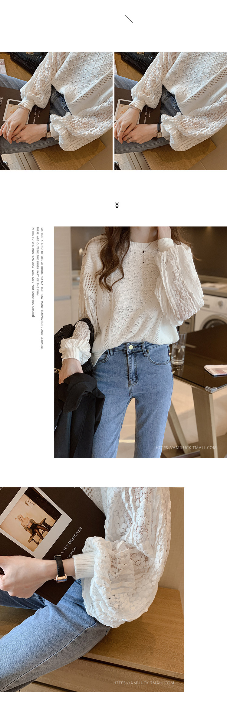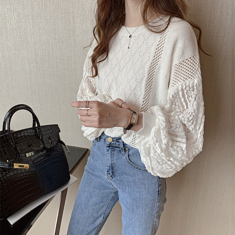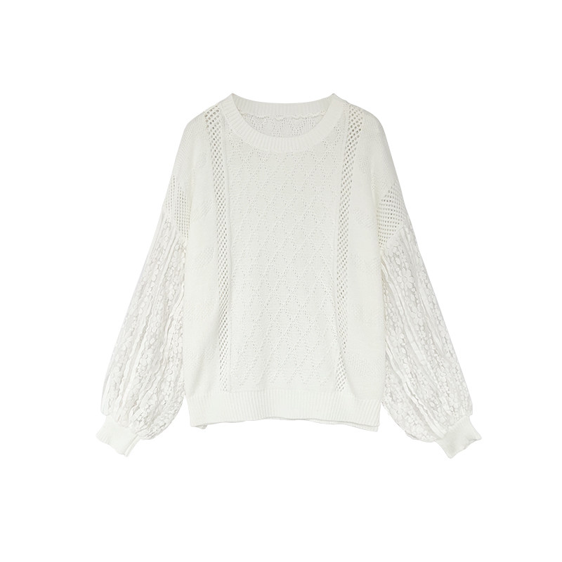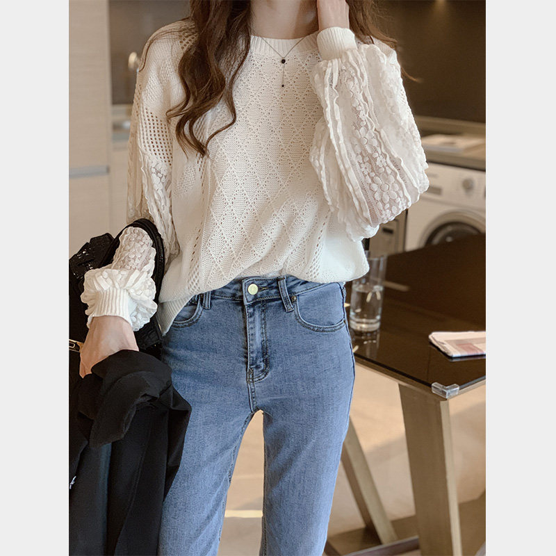 Белый осенний свитер, кружевной трикотажный лонгслив, 2023, в западном стиле