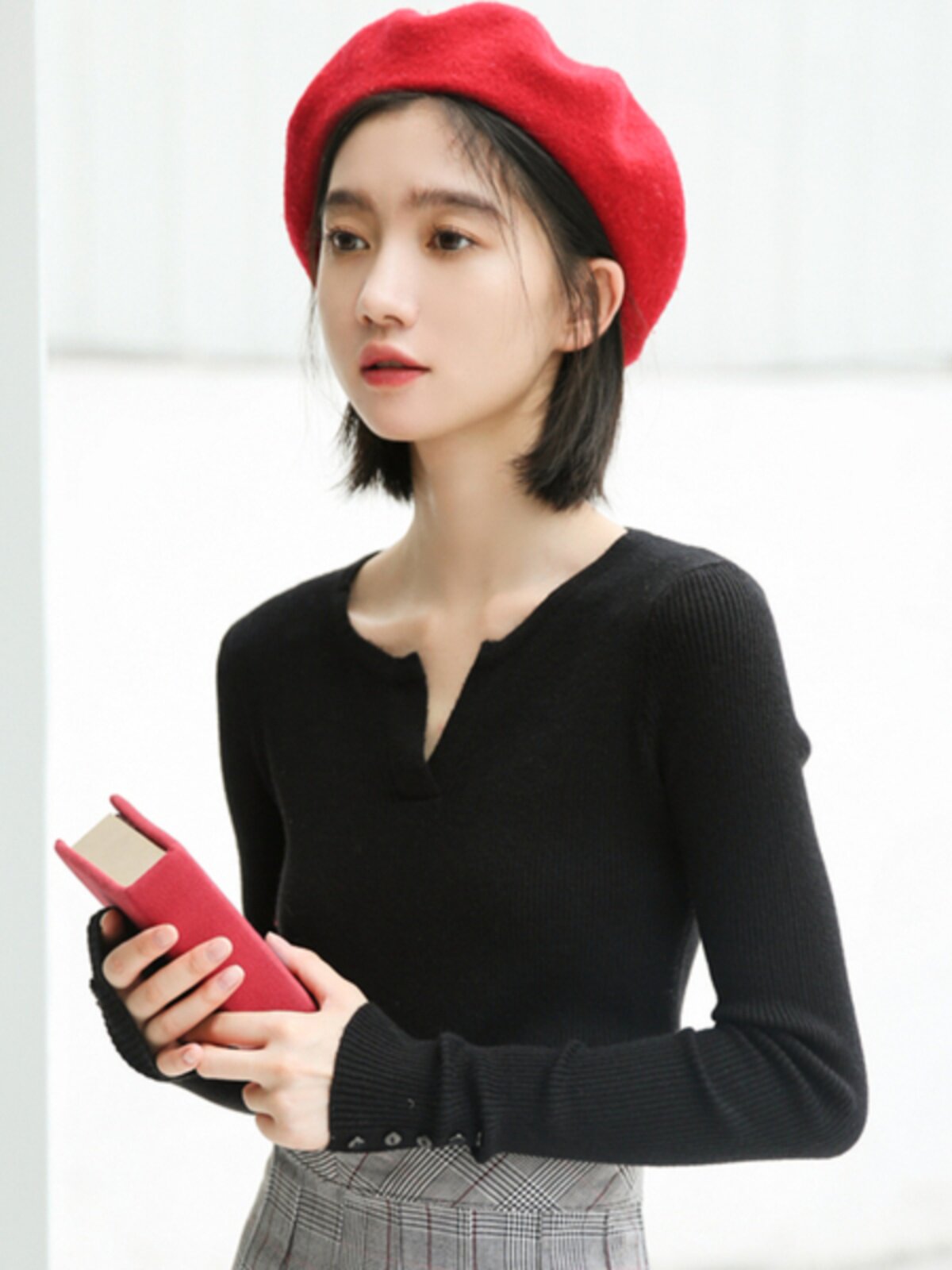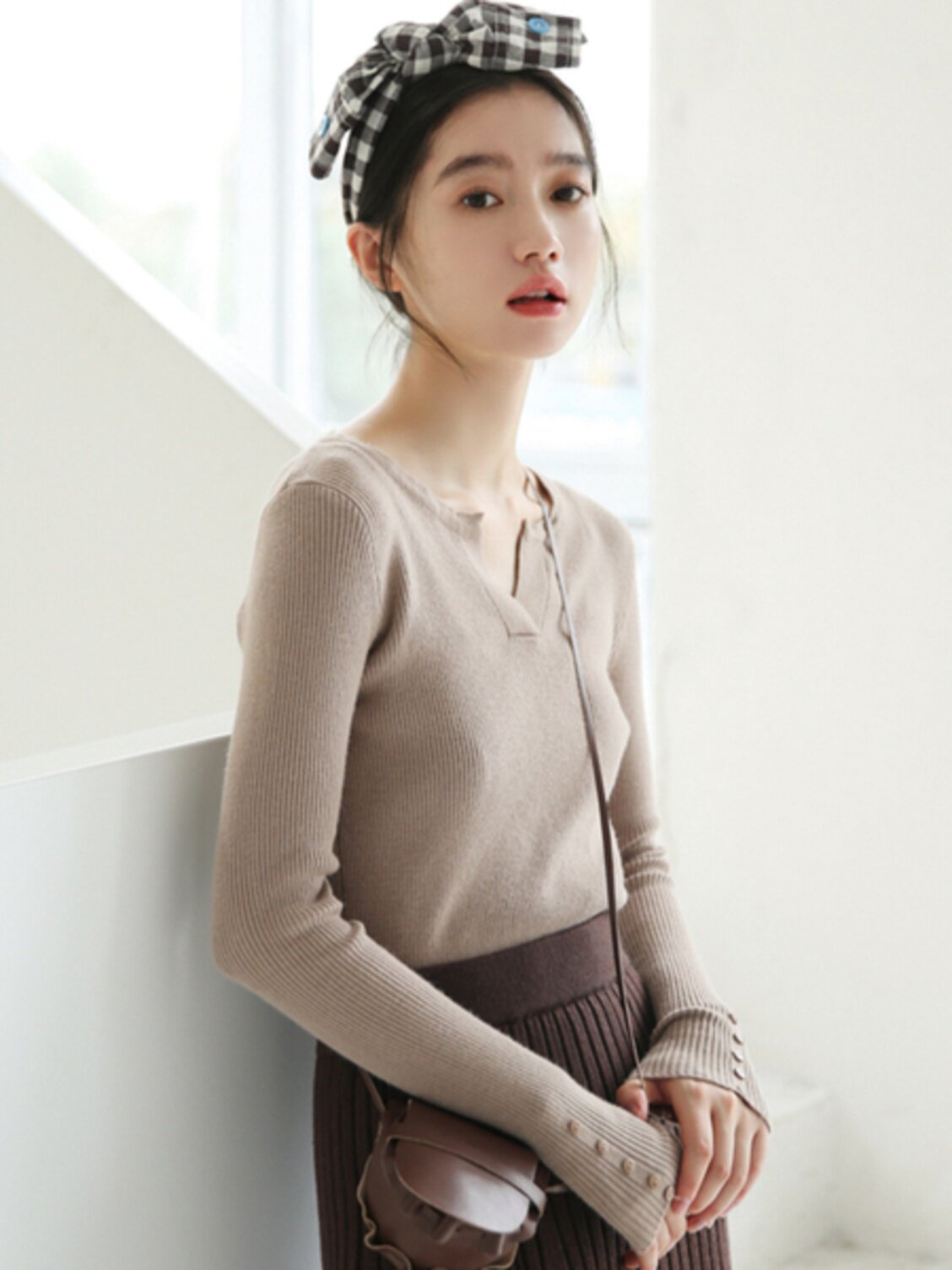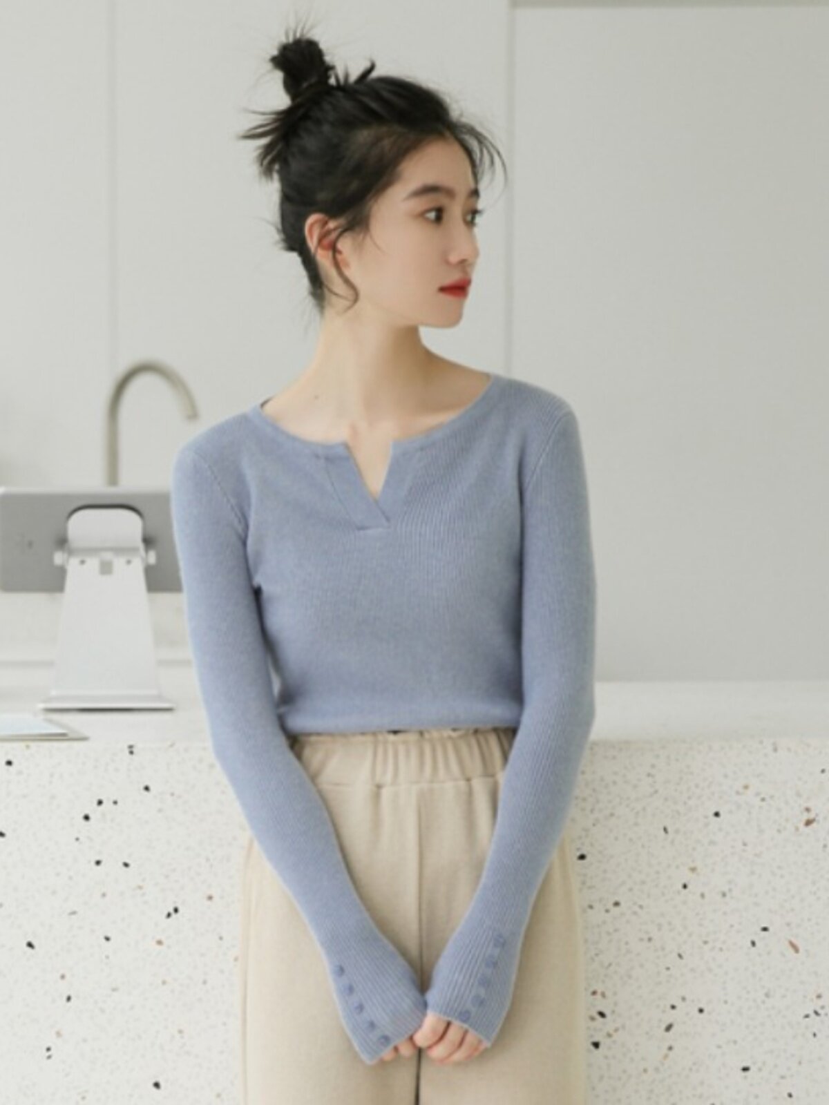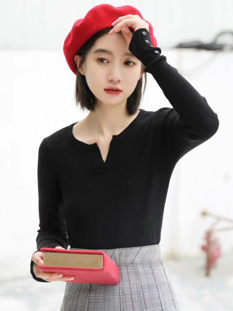 Трикотажный весенний приталенный брендовый лонгслив, 2023, V-образный вырез