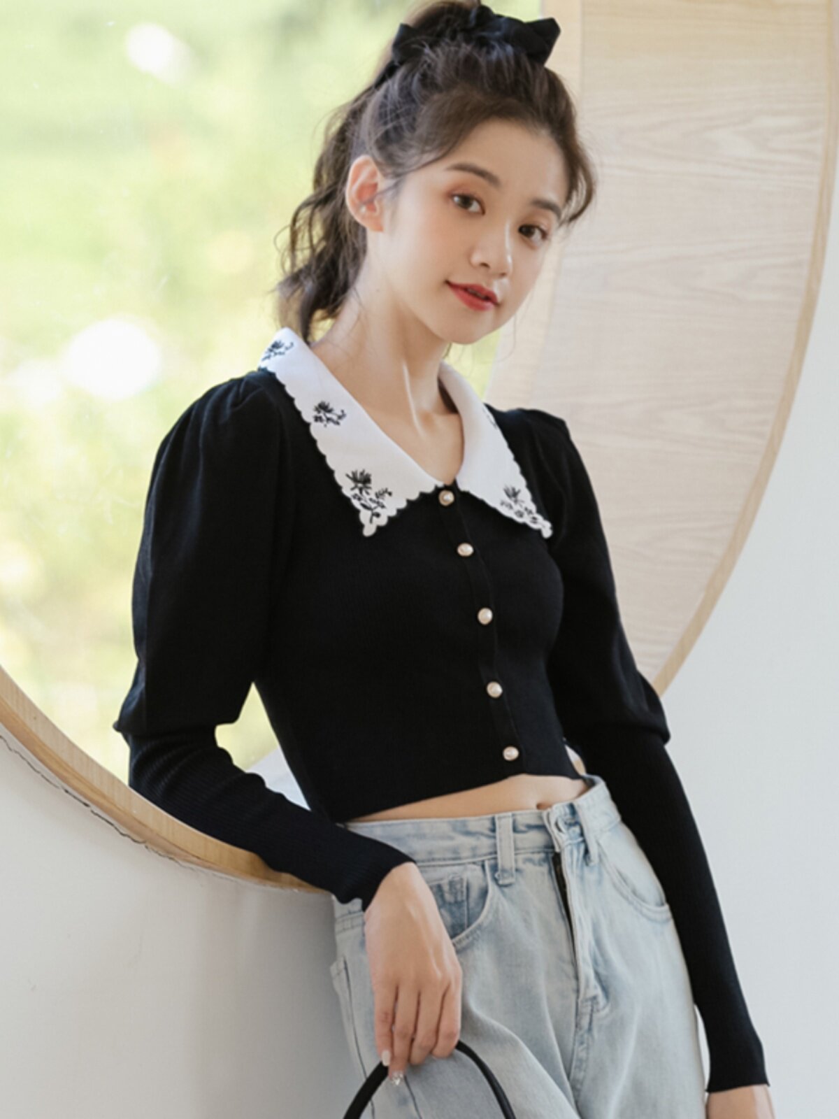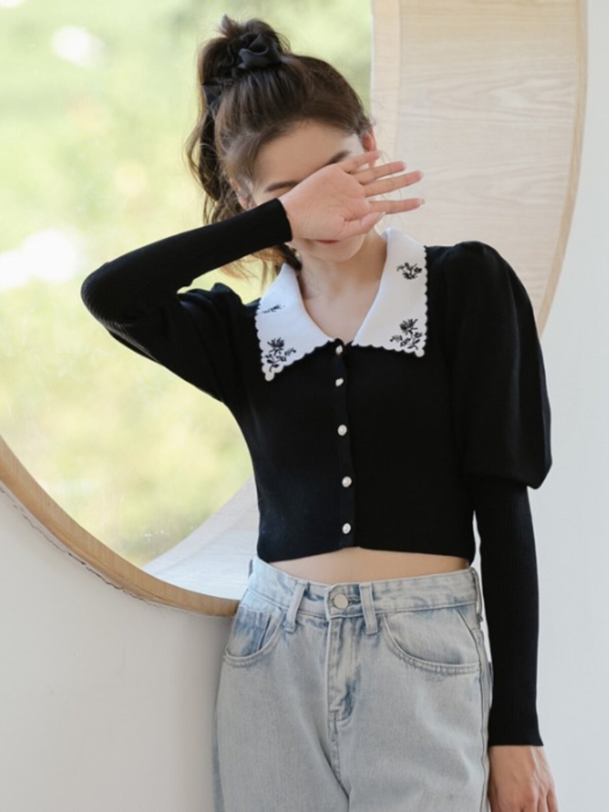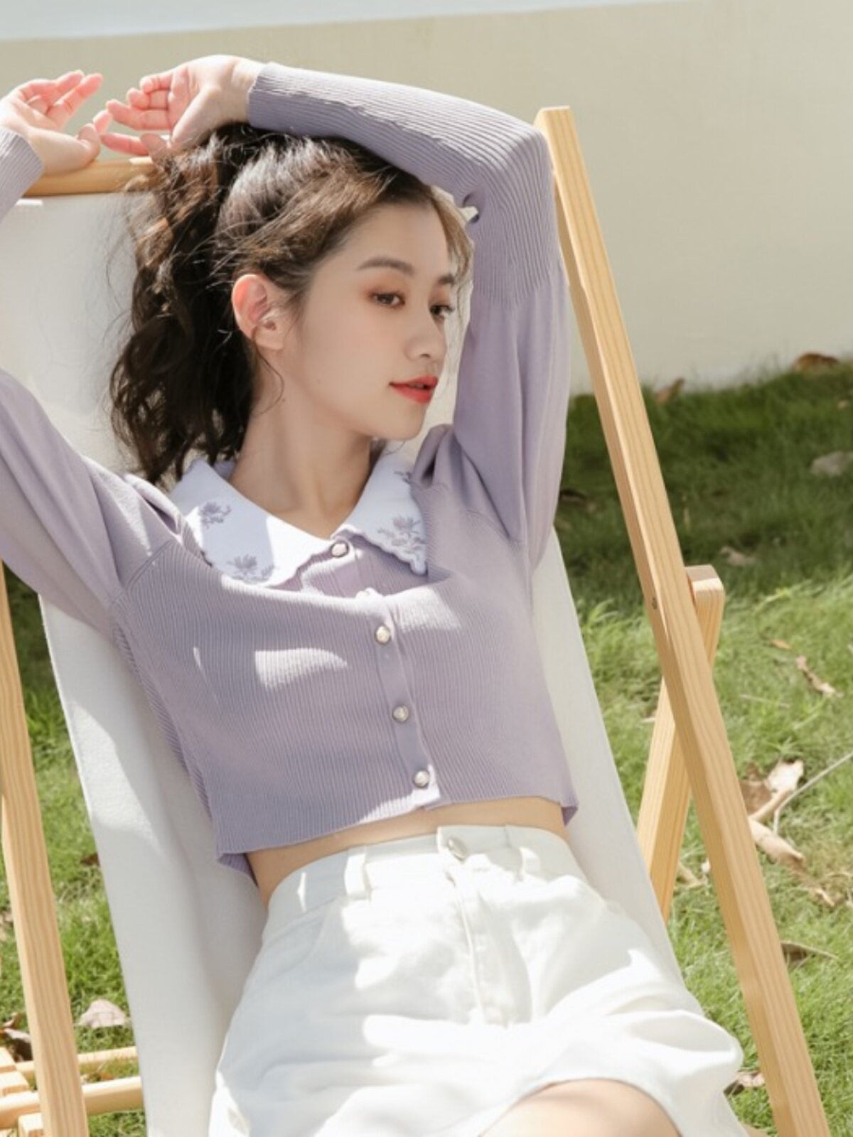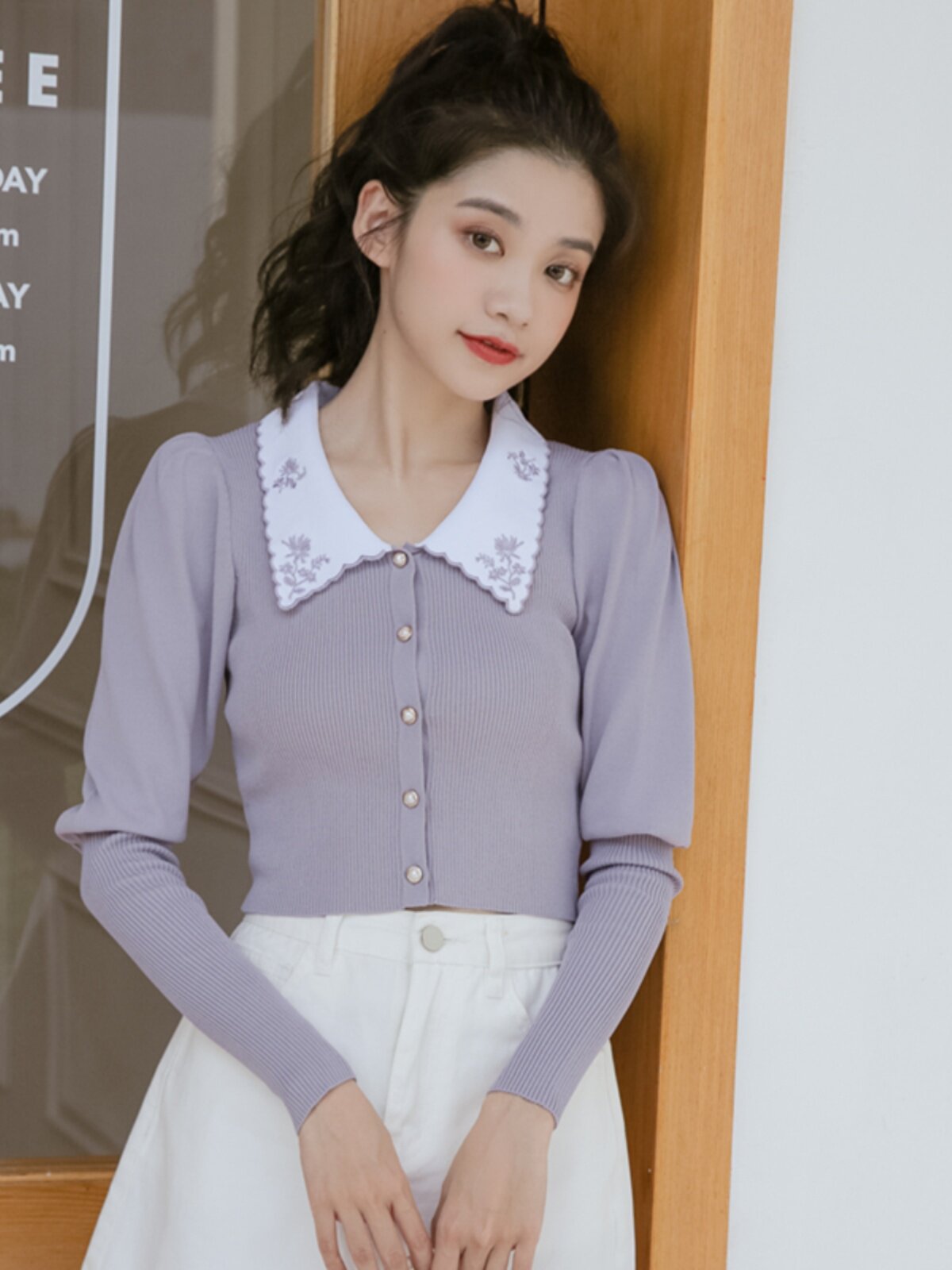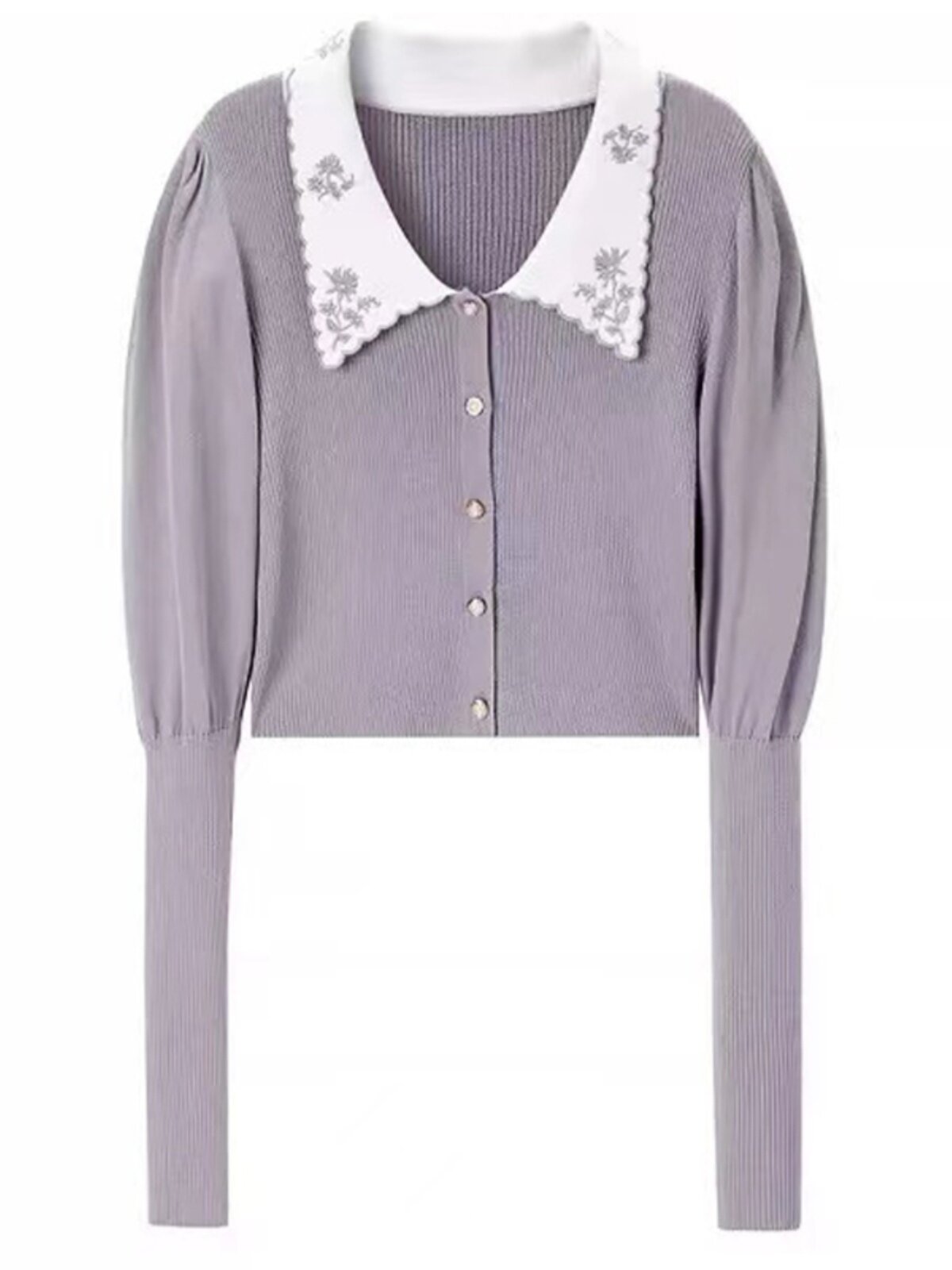 Дизайнерский сиреневый ретро короткий свитер, с вышивкой, воротник поло, тренд сезона, рукава фонарики