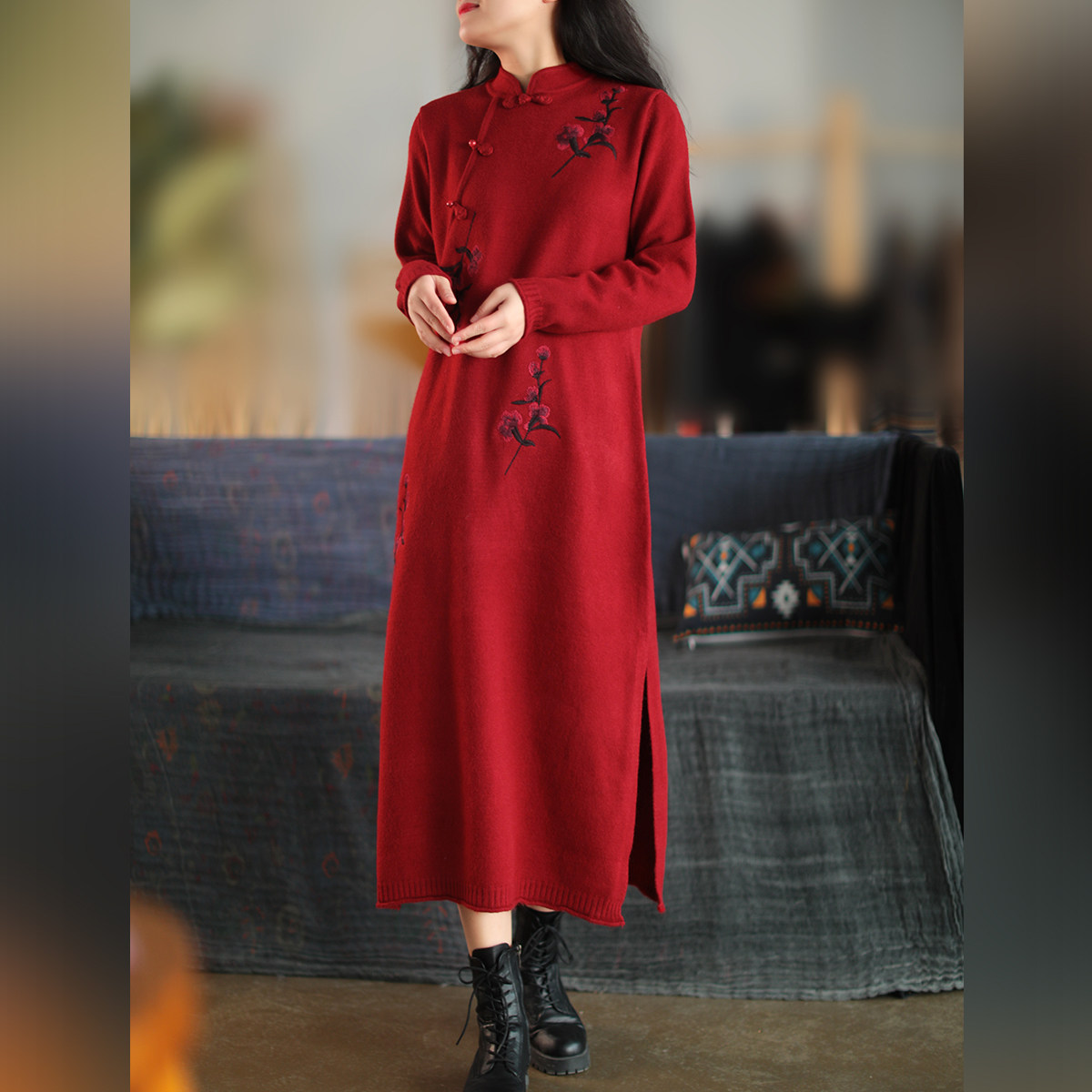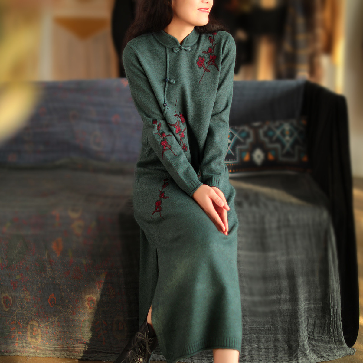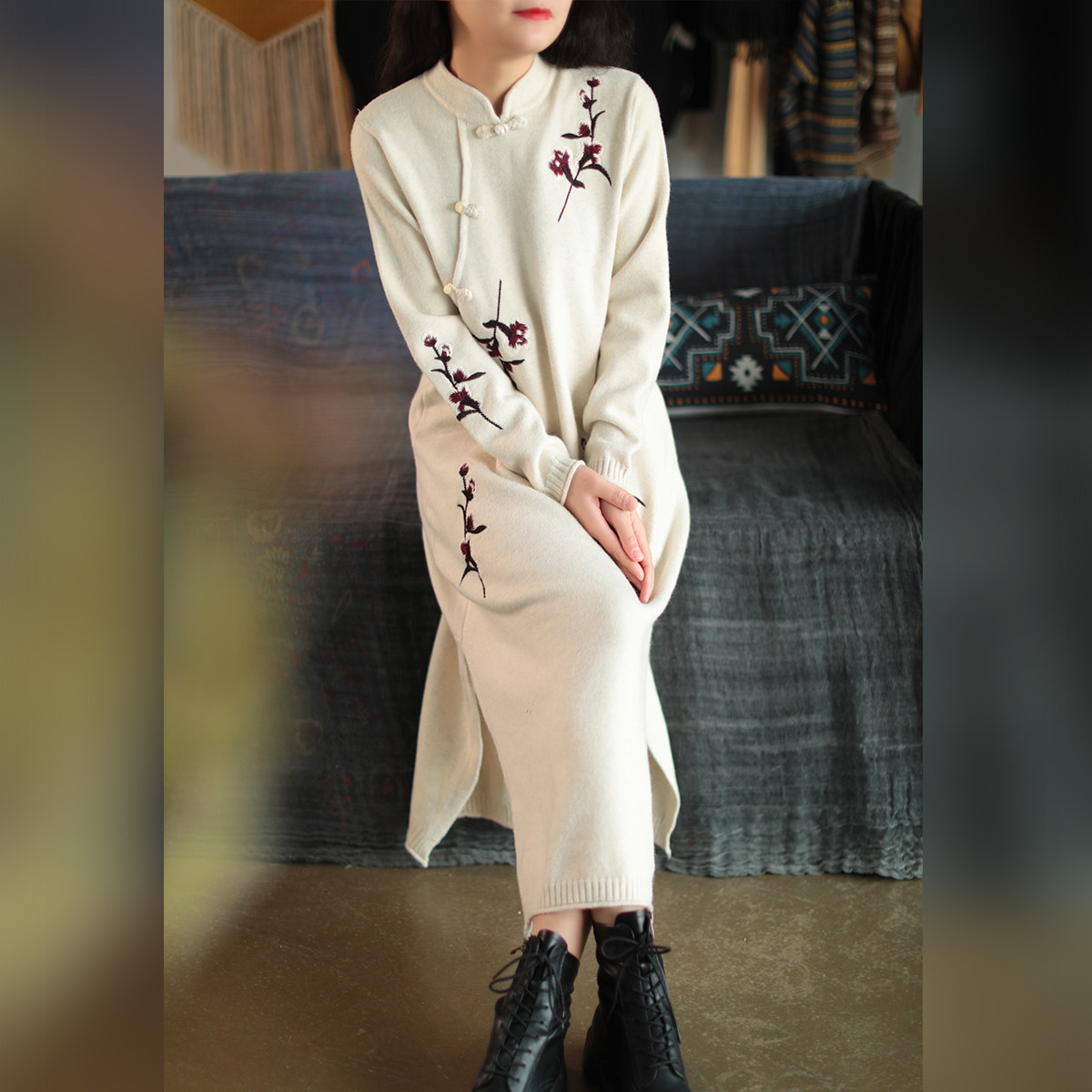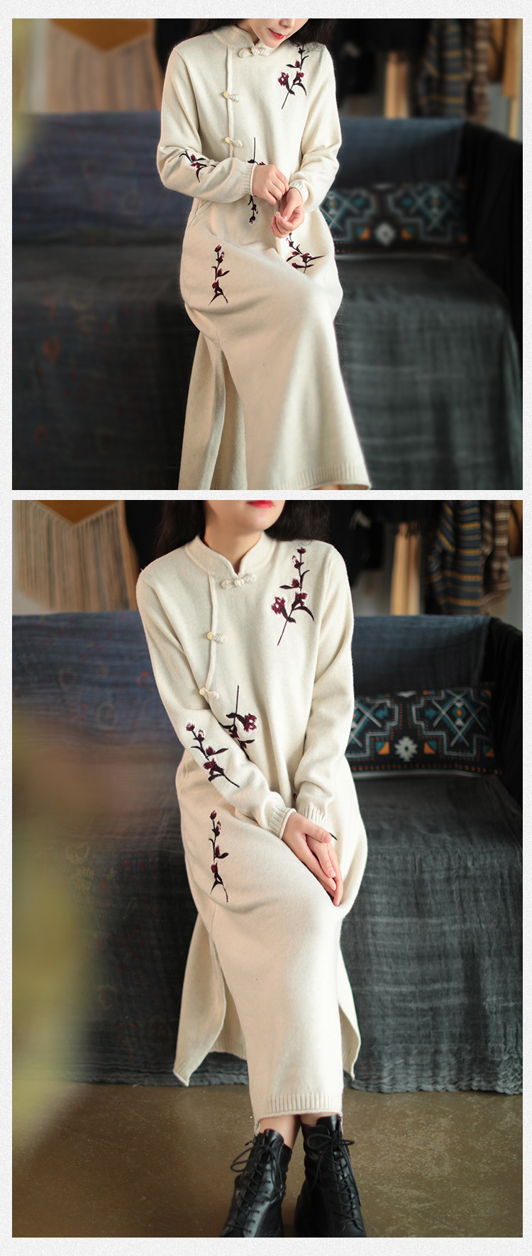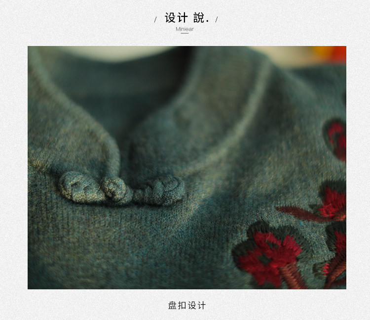 Шерстяной зимний ретро длинный трикотажный свитер, с вышивкой