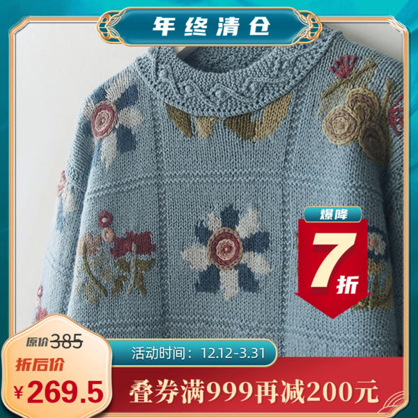 Синий трехмерный ретро лонгслив, шерстяной свитер, в цветочек, принт
