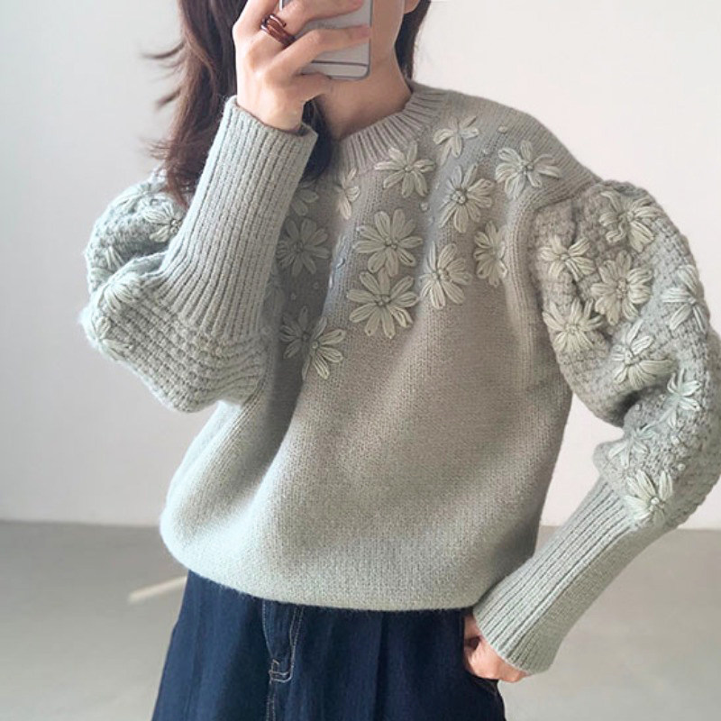 Демисезонный свежий трехмерный трикотажный свитер с круглым воротником, в корейском стиле, с вышивкой