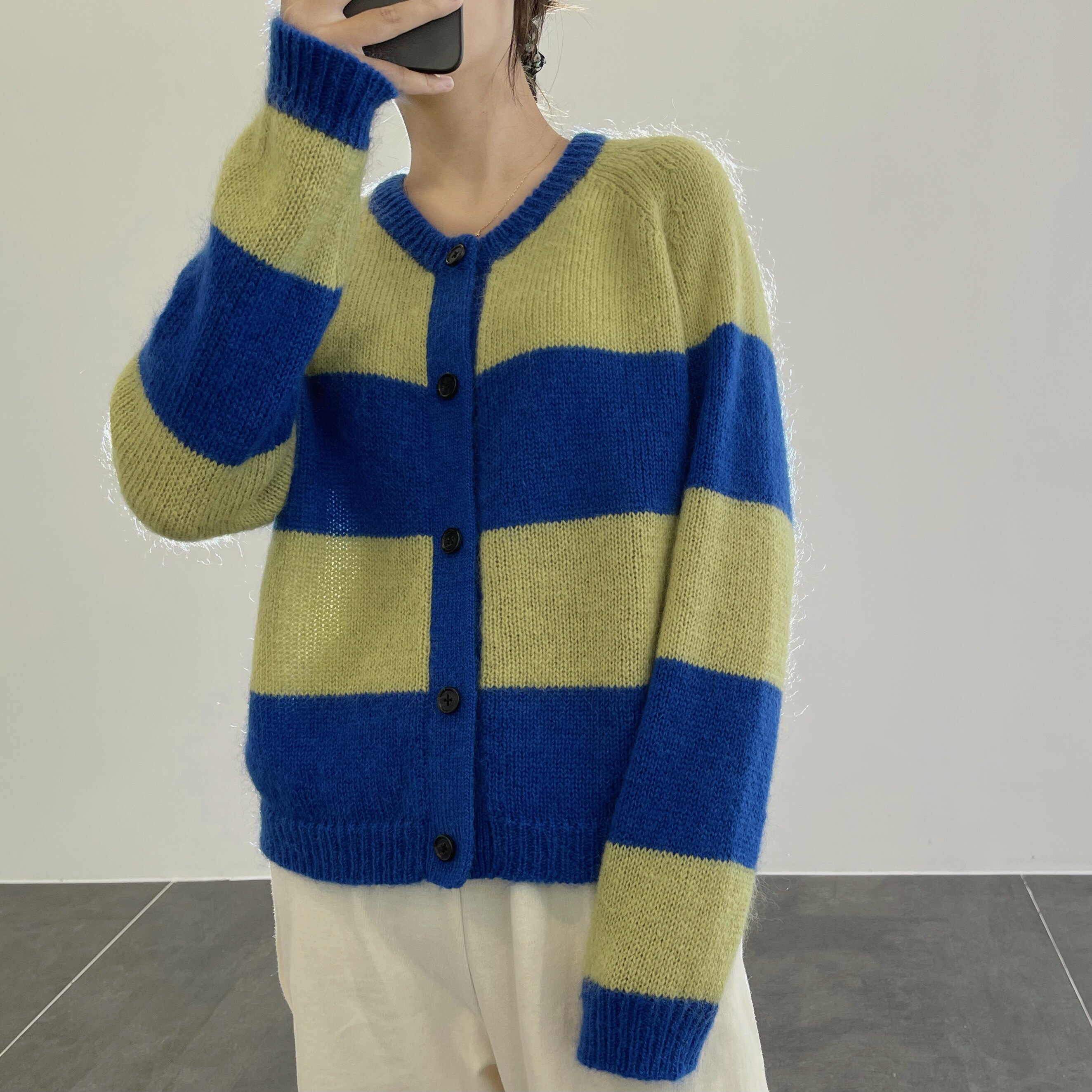 Эксклюзивно по индивидуальному заказу.Женский вязаный кардиган темно-синего сапфира в стиле Star's + горчично-зеленый, контрастный кардиган из шерсти и мохера