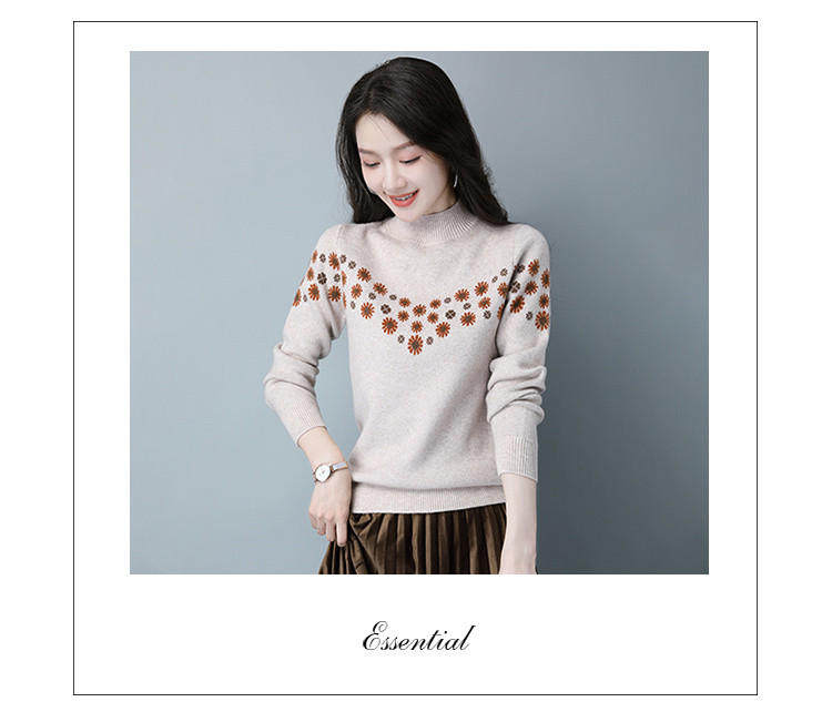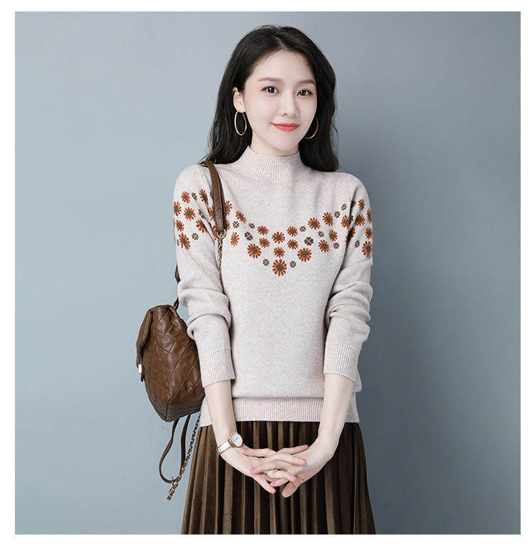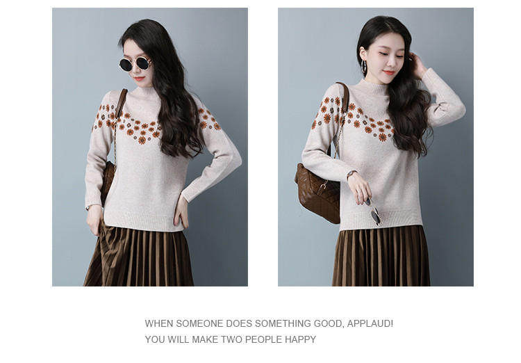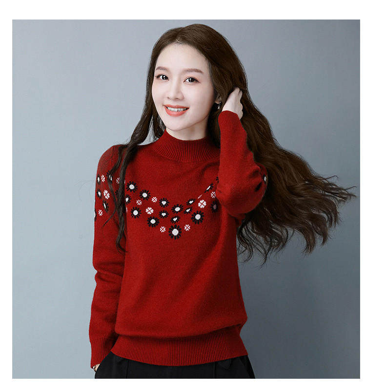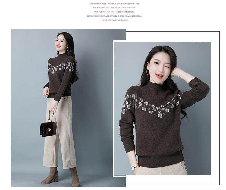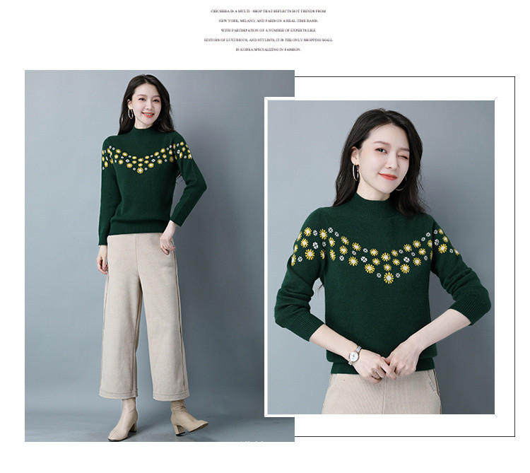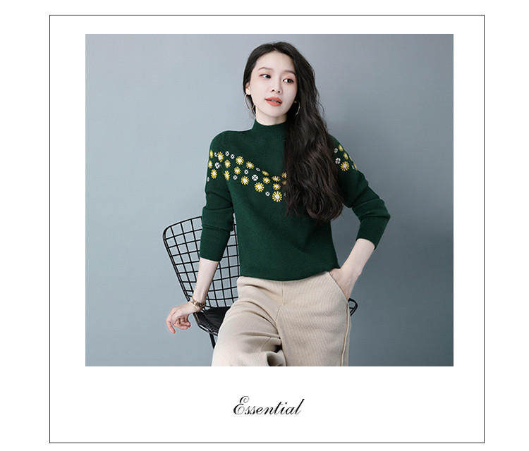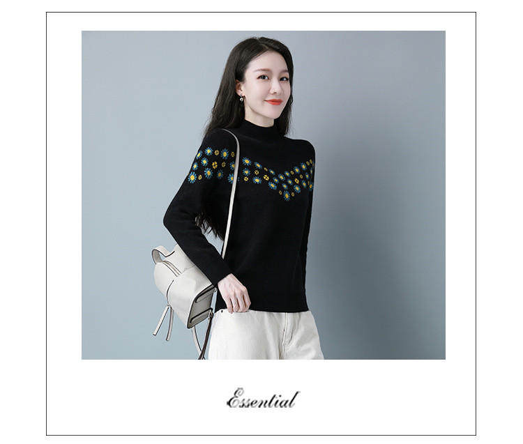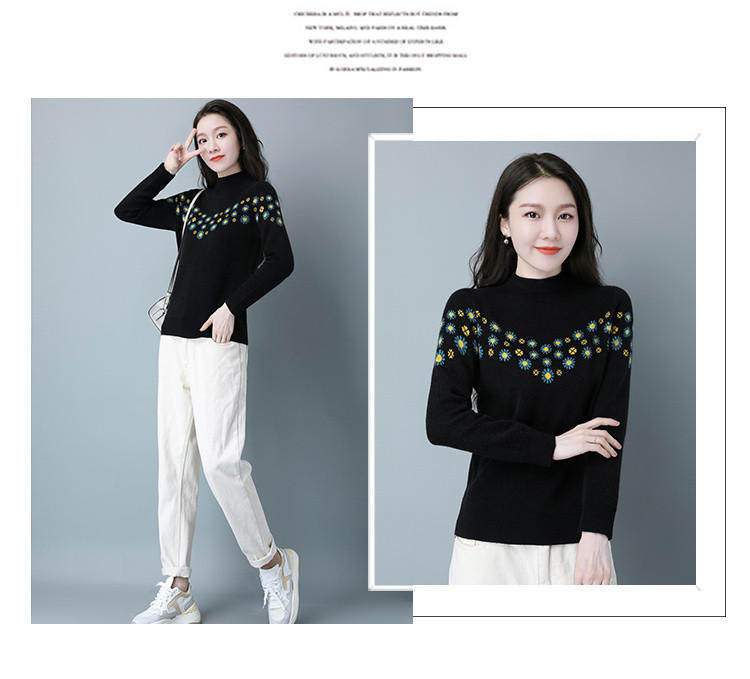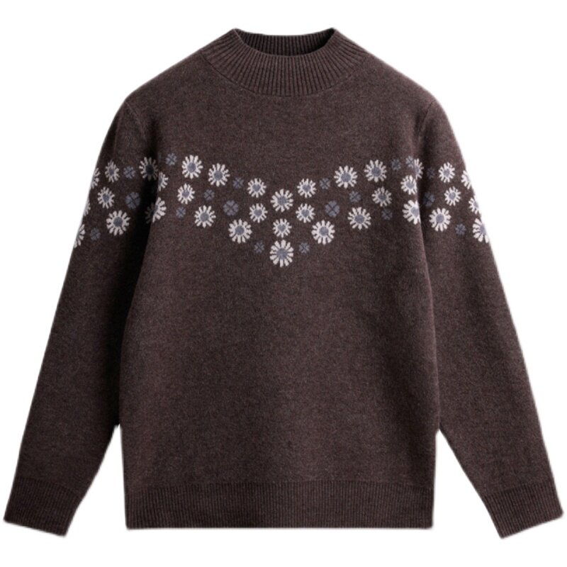 Демисезонный шерстяной свитер, базовая трикотажная рубашка, высокий воротник, с вышивкой, оверсайз