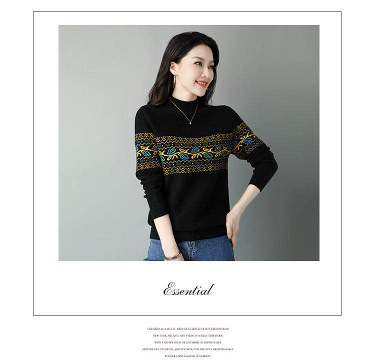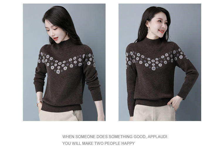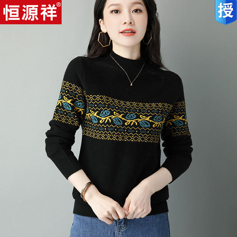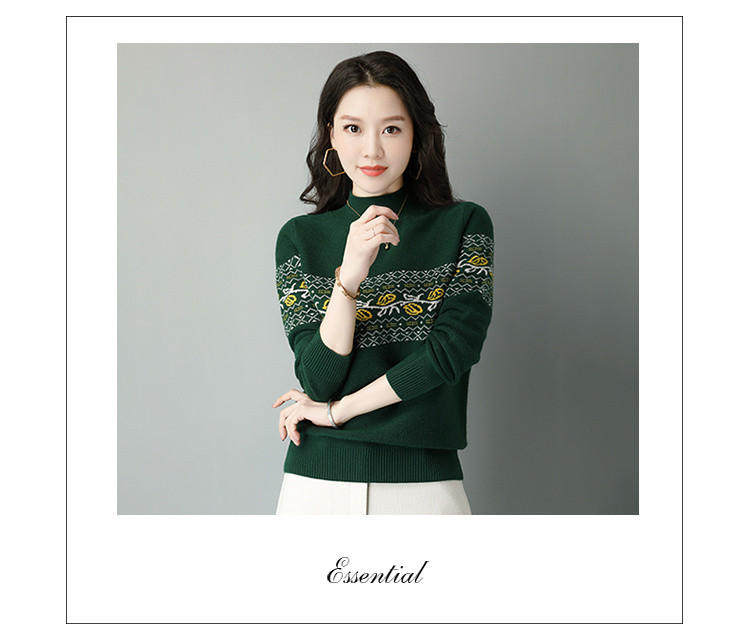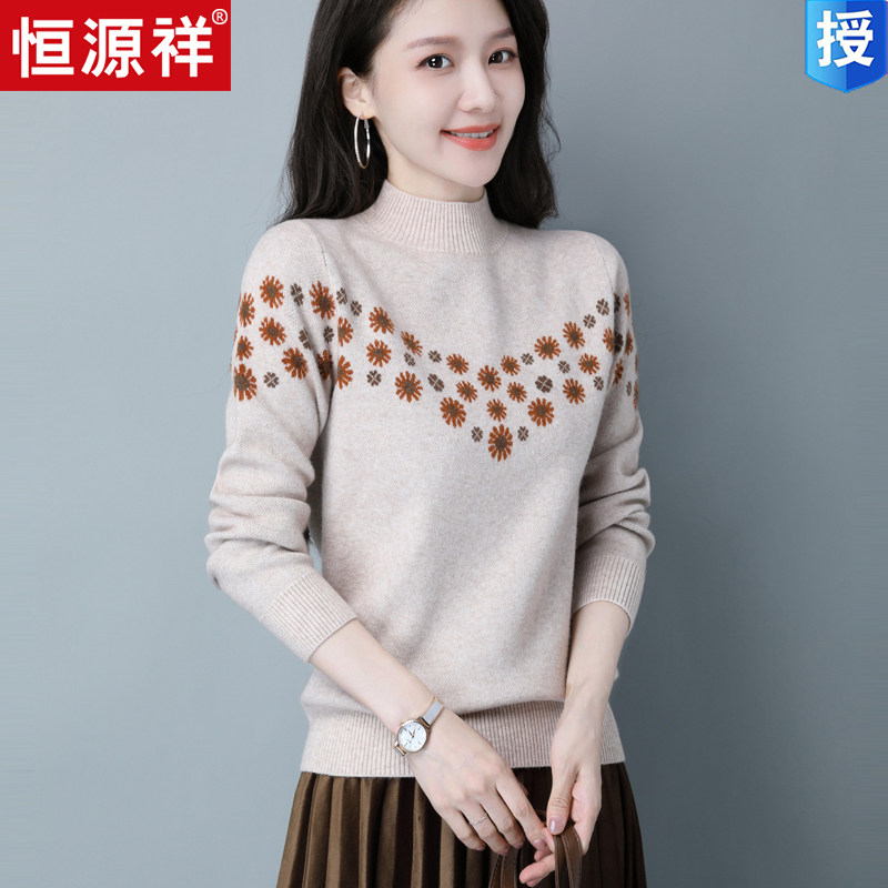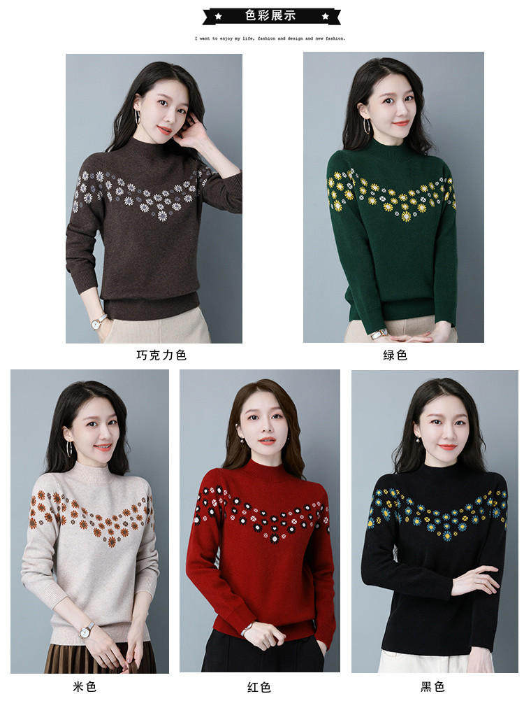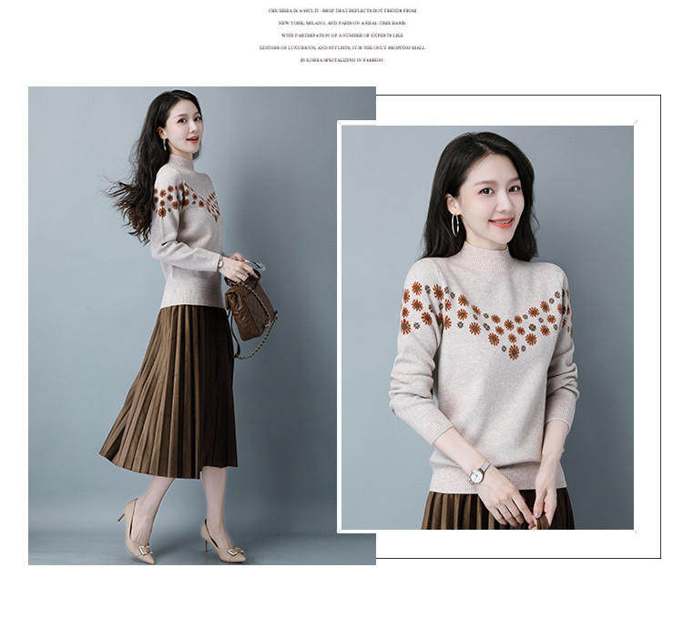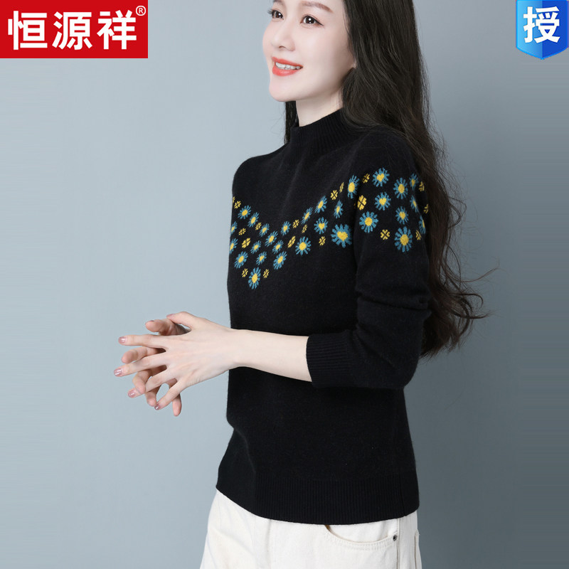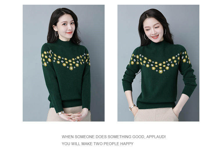 Демисезонный шерстяной свитер, базовая трикотажная рубашка, высокий воротник, с вышивкой, оверсайз