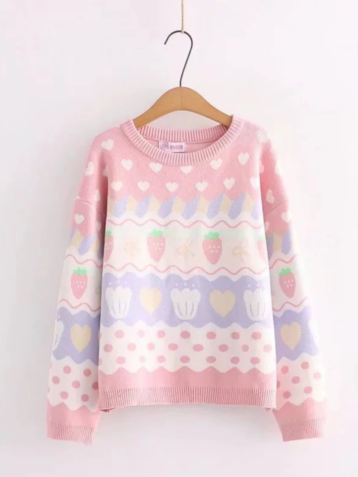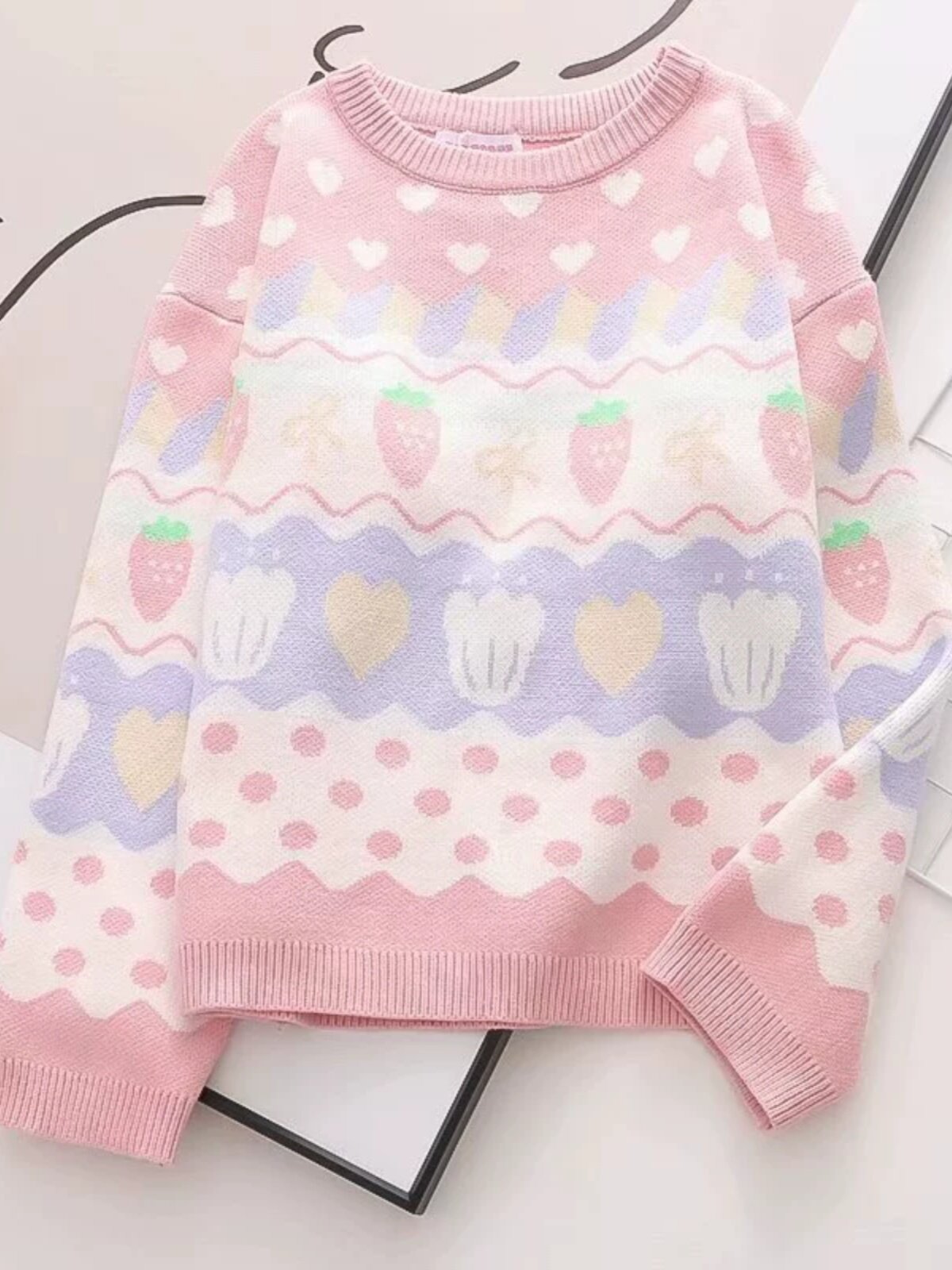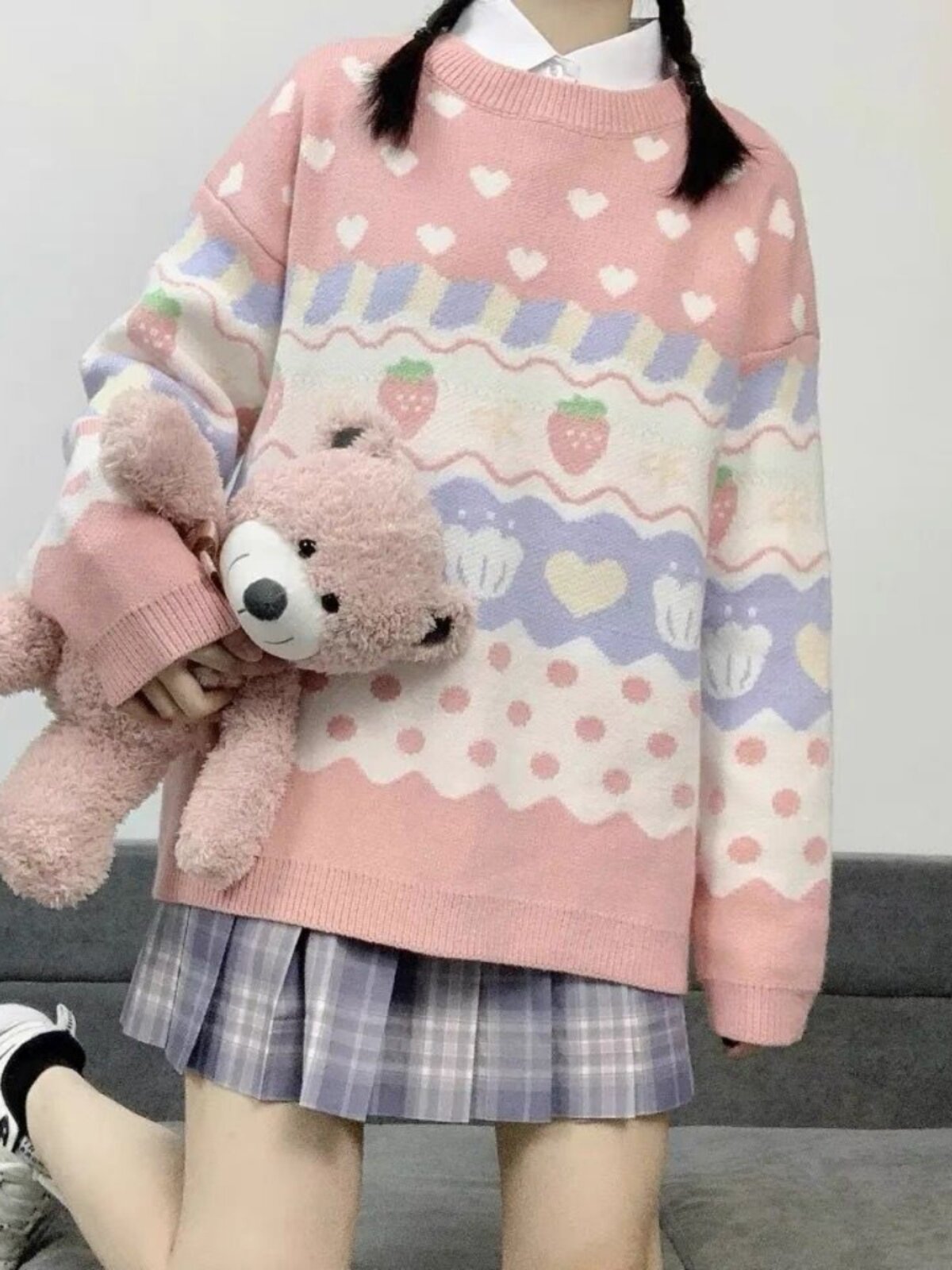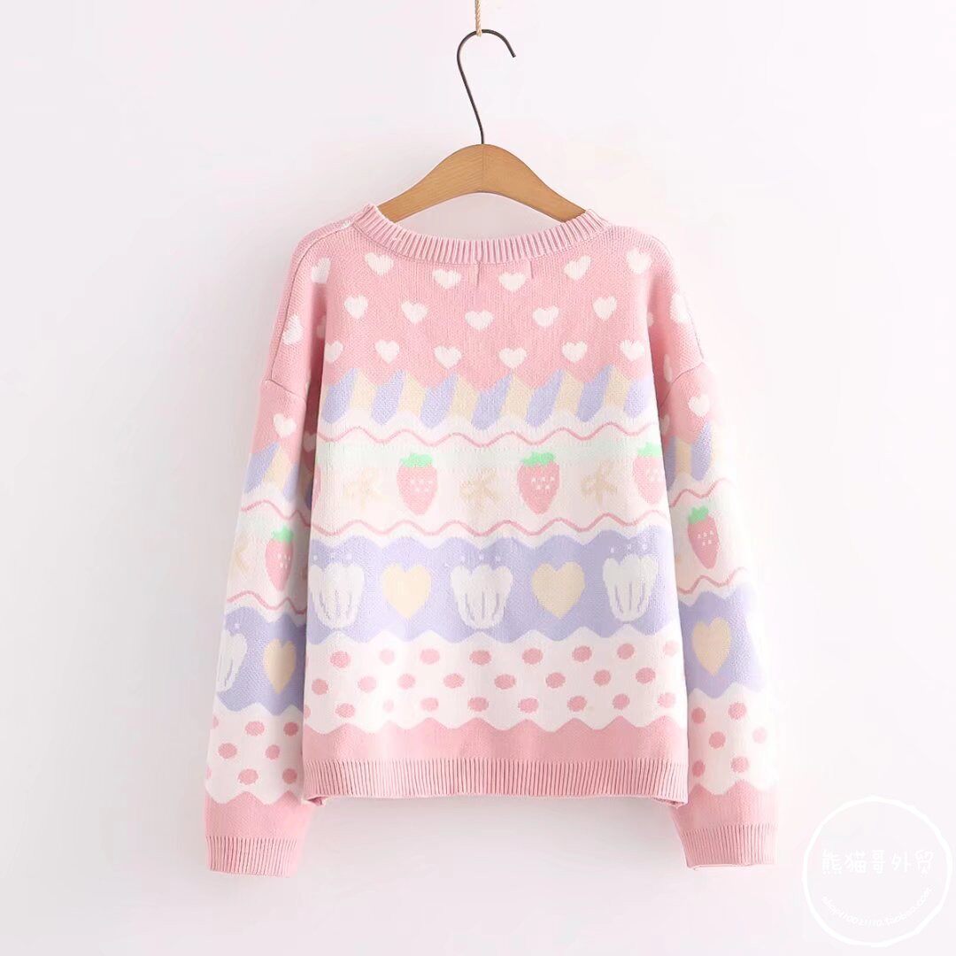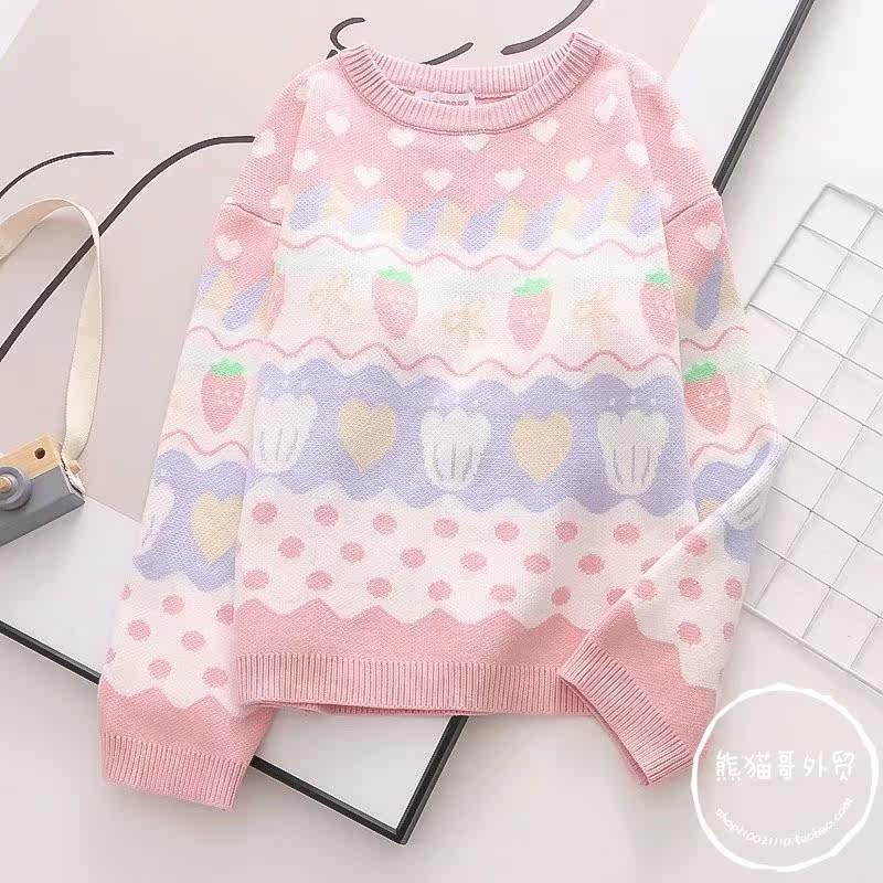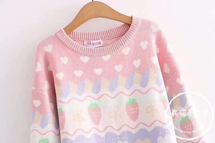 Японская школьная юбка, милая розовая свежая клубника, милый трикотажный свитер, лонгслив