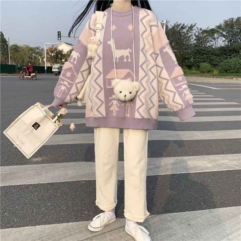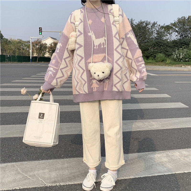 Японский сиреневый милый трикотажный демисезонный свитер для школьников и студентов, в корейском стиле, свободный крой