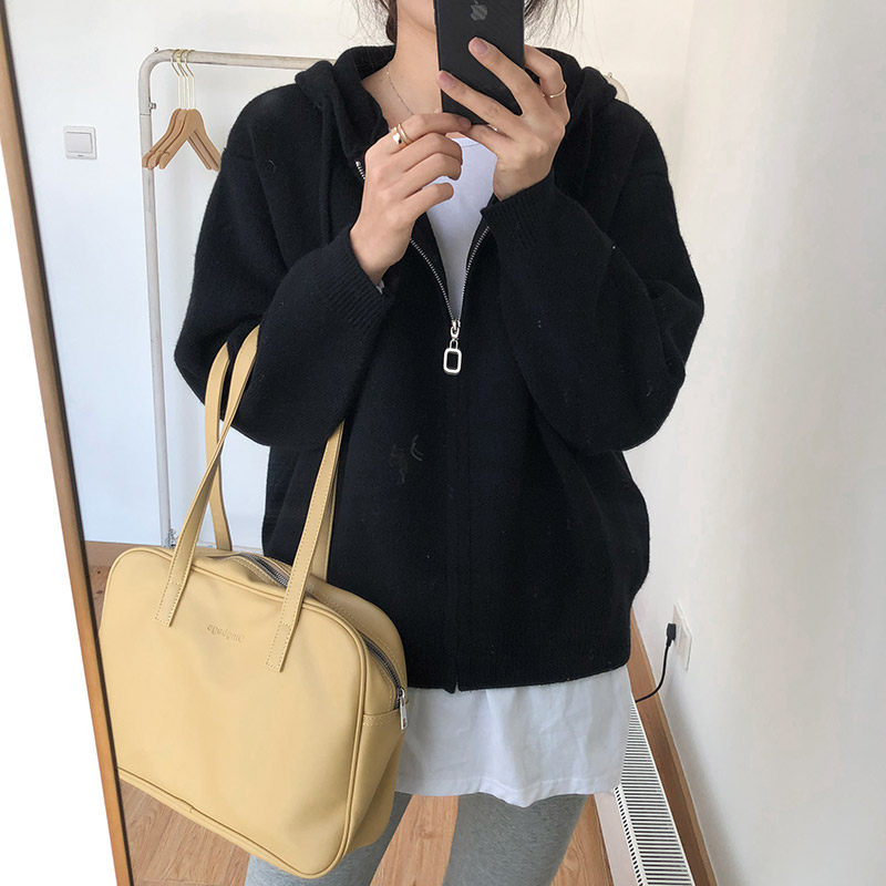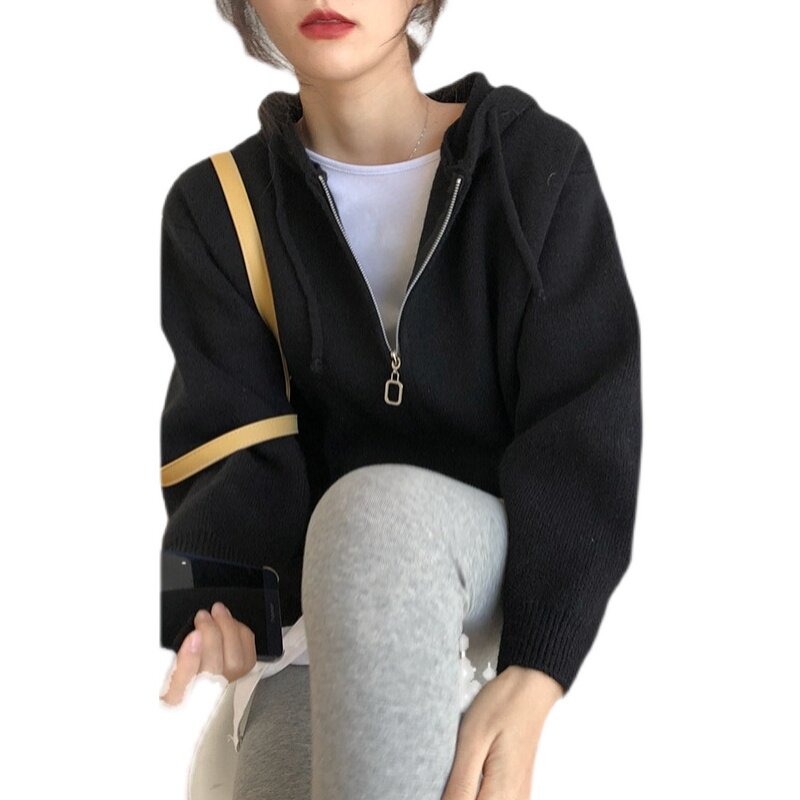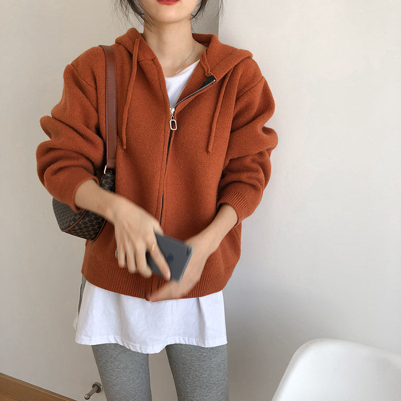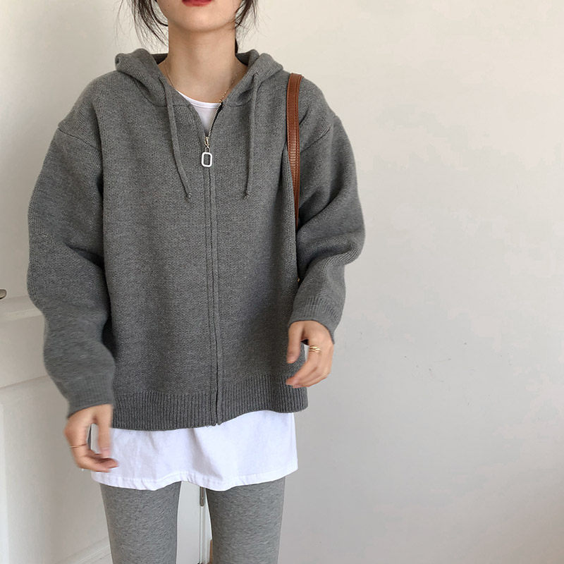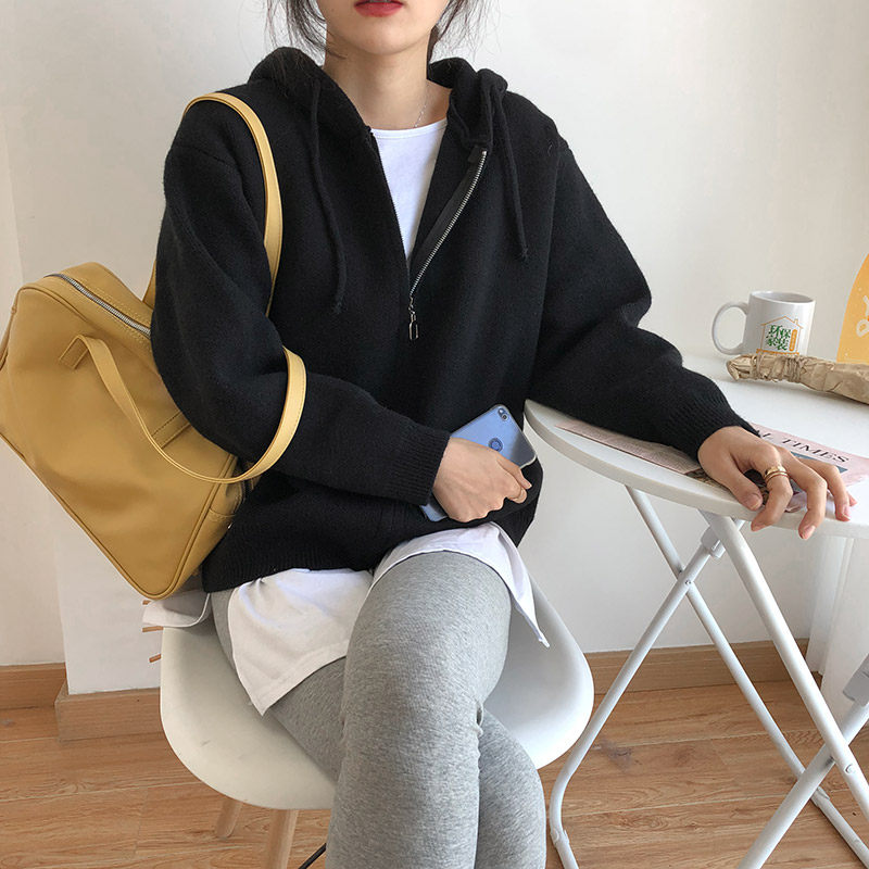 Кардиган с молнией с капюшоном, демисезонный однотонный свитер, куртка, в корейском стиле, коллекция 2021, оверсайз