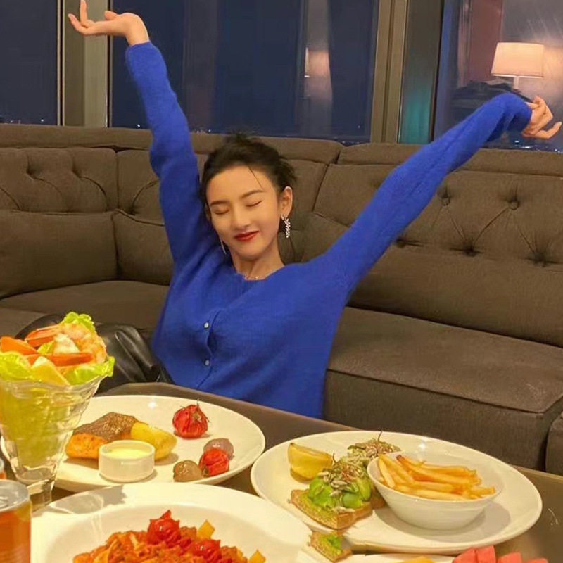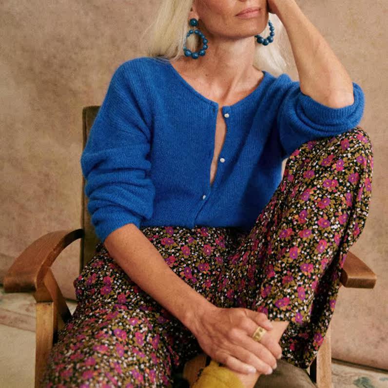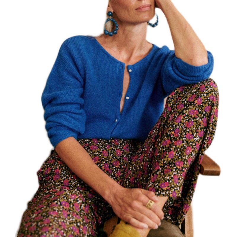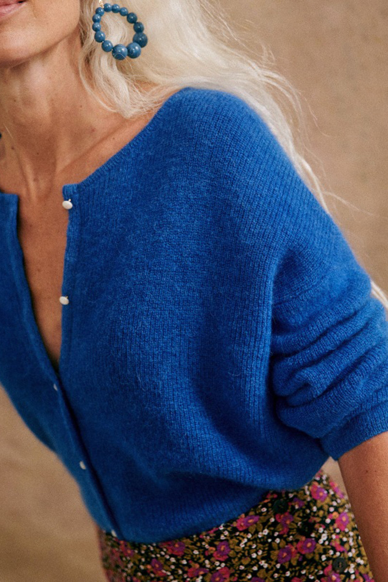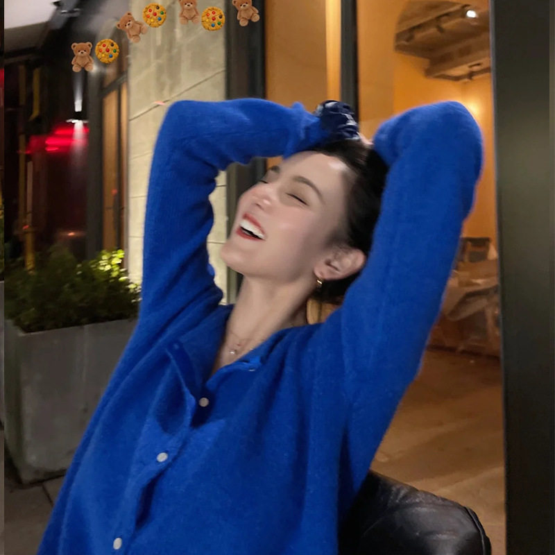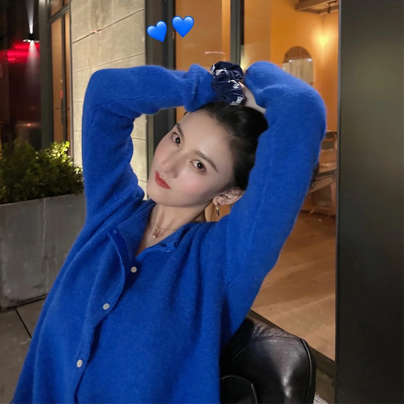 Синий трикотажный свитер с круглым воротником, кардиган, французский стиль