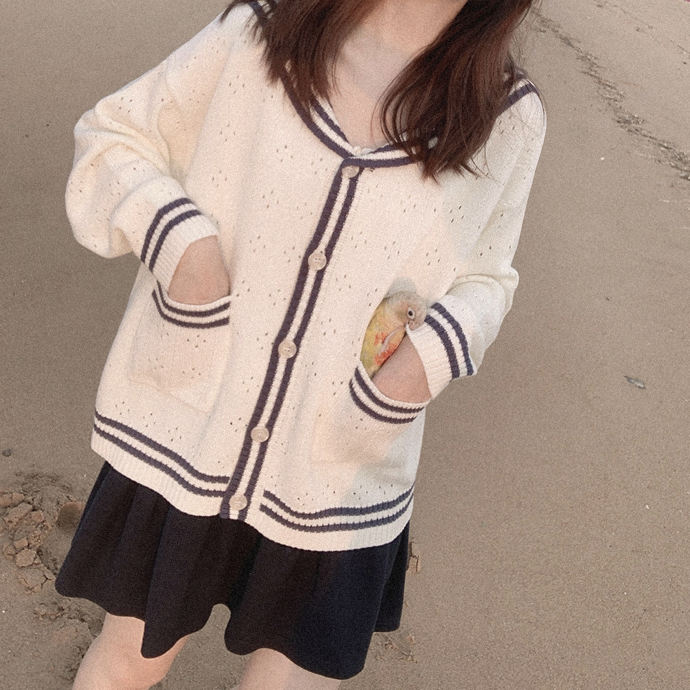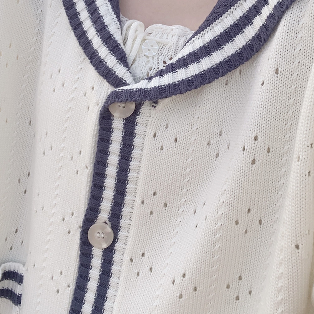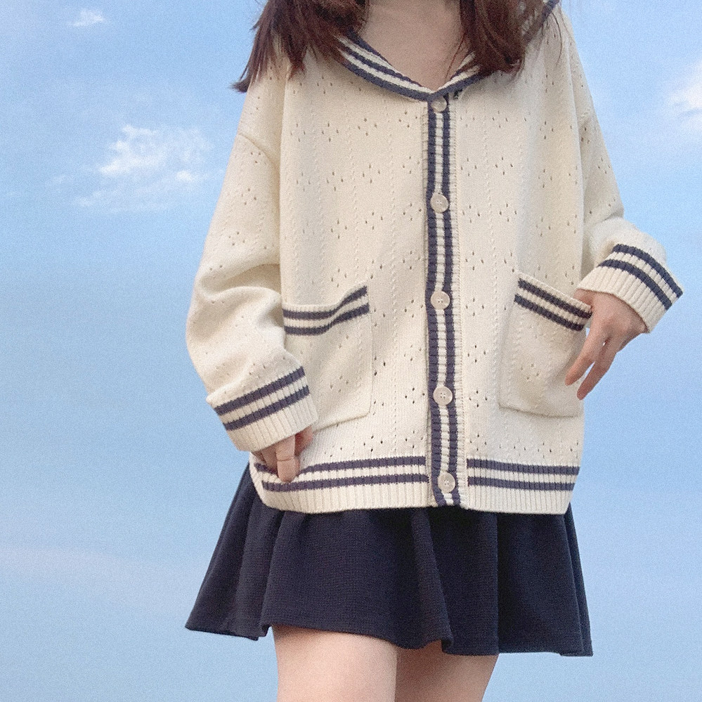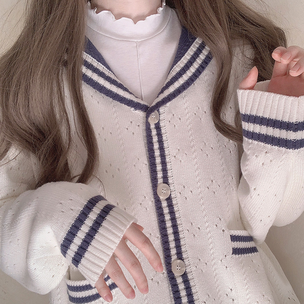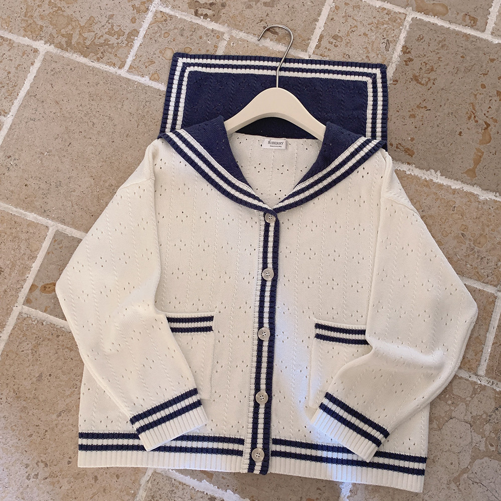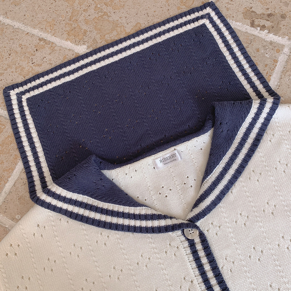 Ретро военно-морской белый трикотажный кардиган, свободный крой