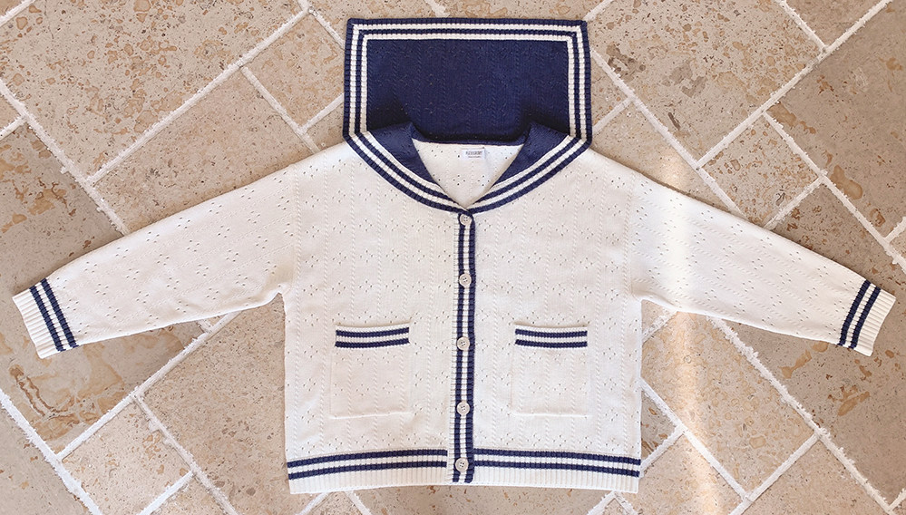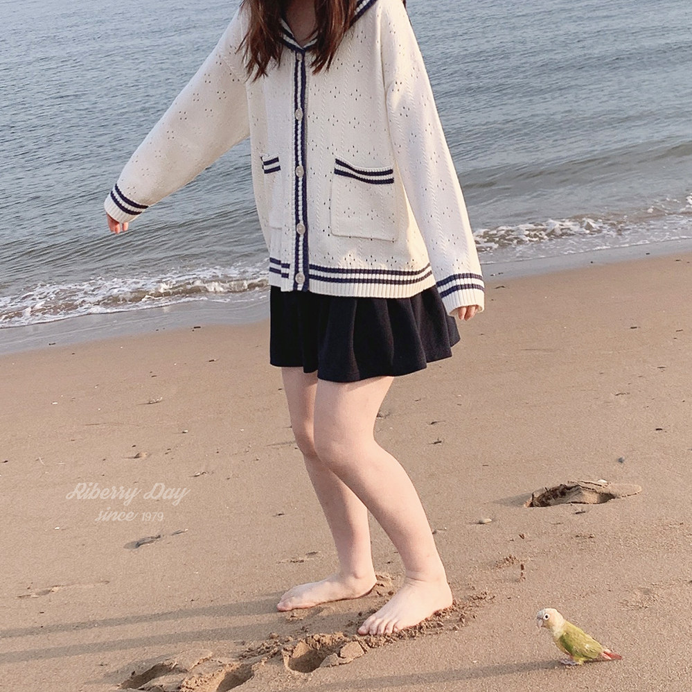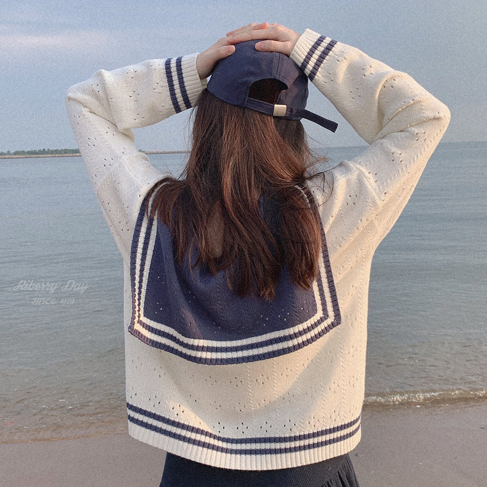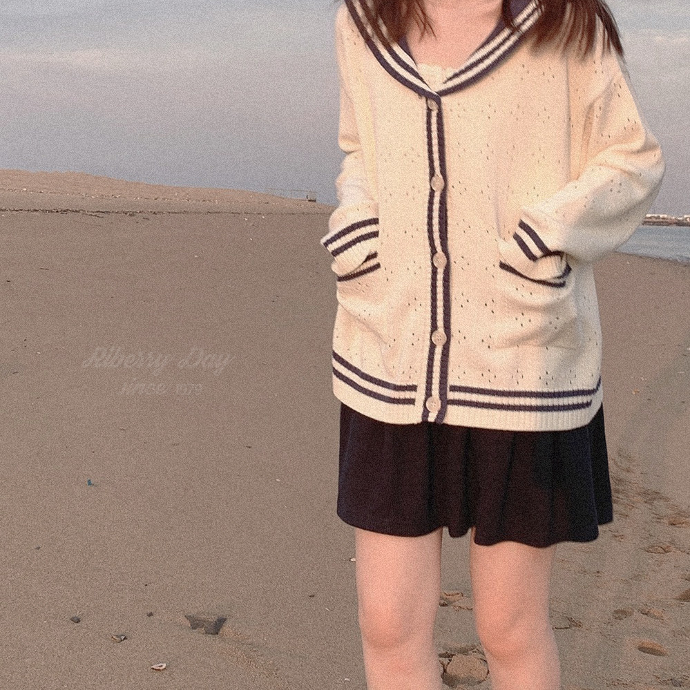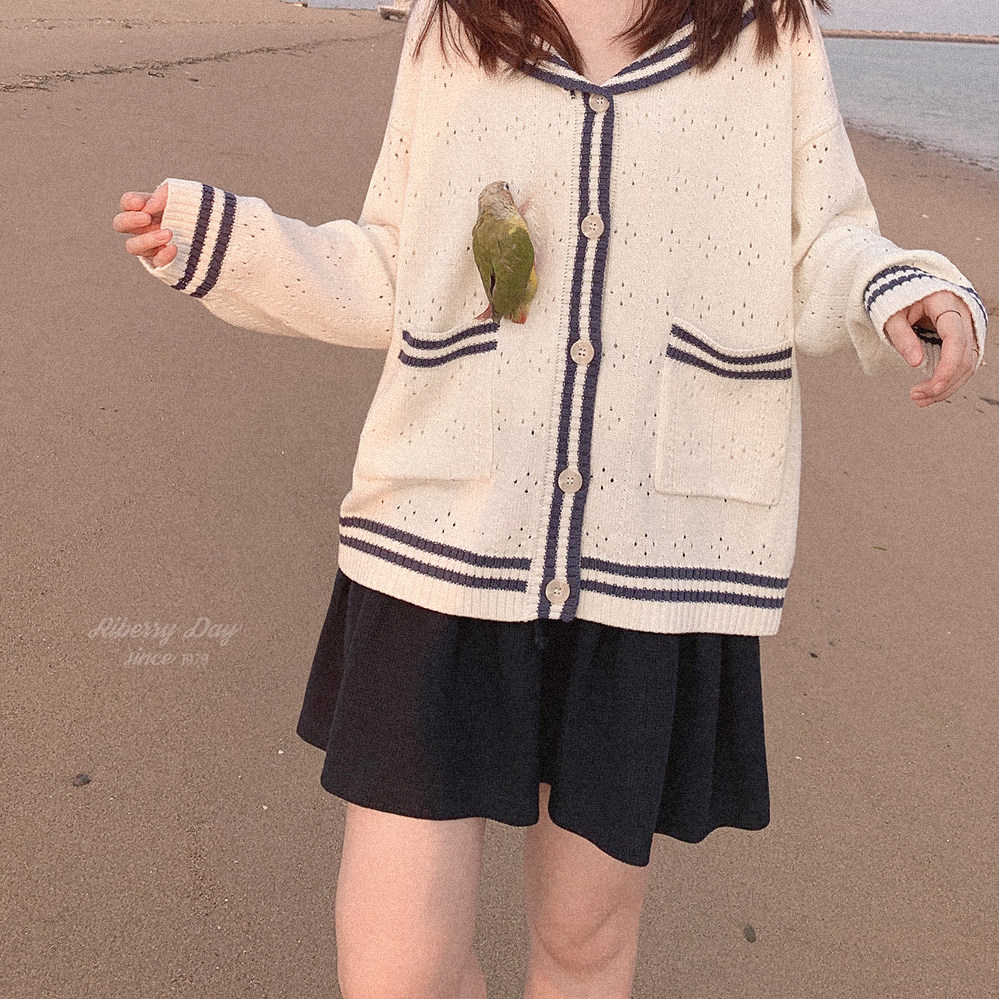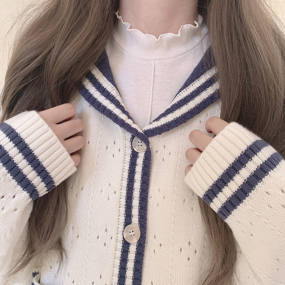 Ретро военно-морской белый трикотажный кардиган, свободный крой