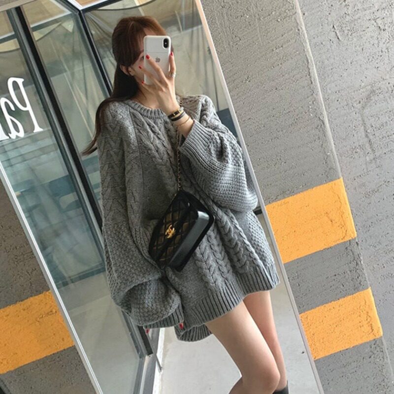 Лонгслив с круглым воротником, длинный трикотажный осенний свитер, в корейском стиле, средней длины