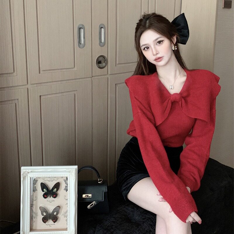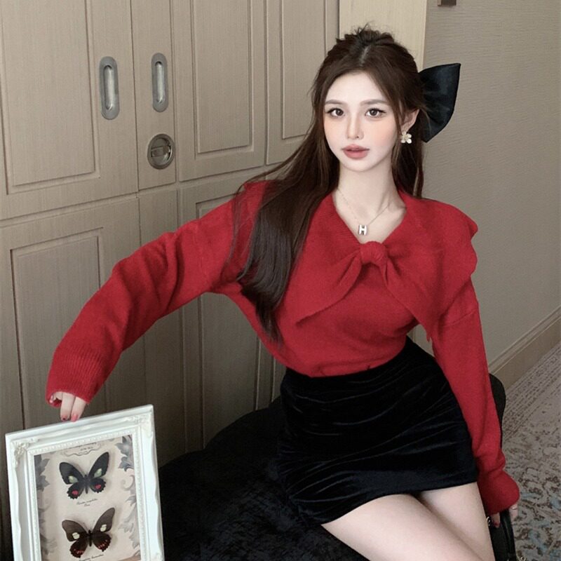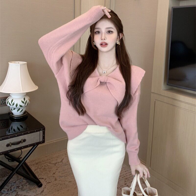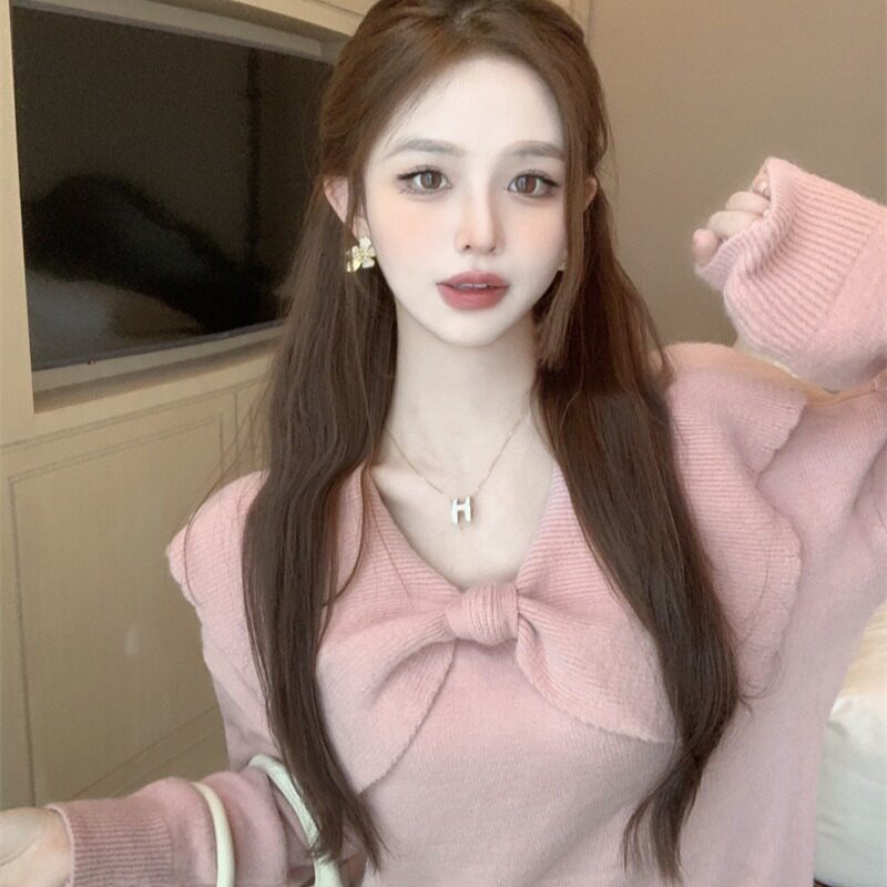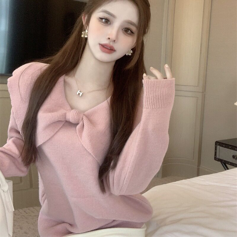 Демисезонный милый розовый трикотажный свитер с бантиком, лонгслив, в западном стиле, V-образный вырез