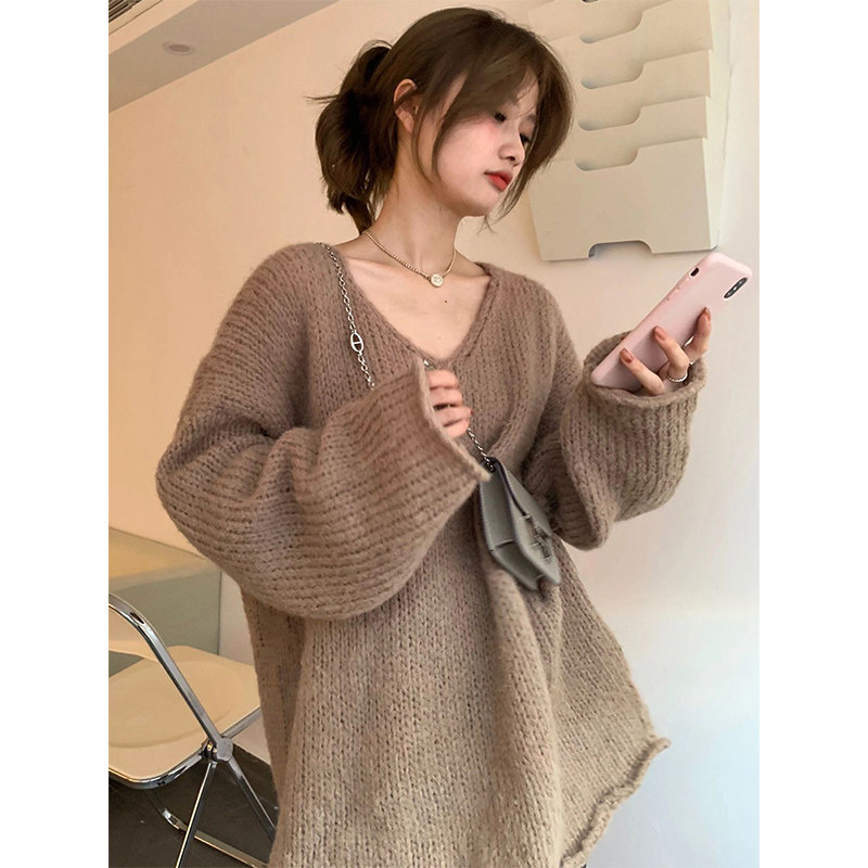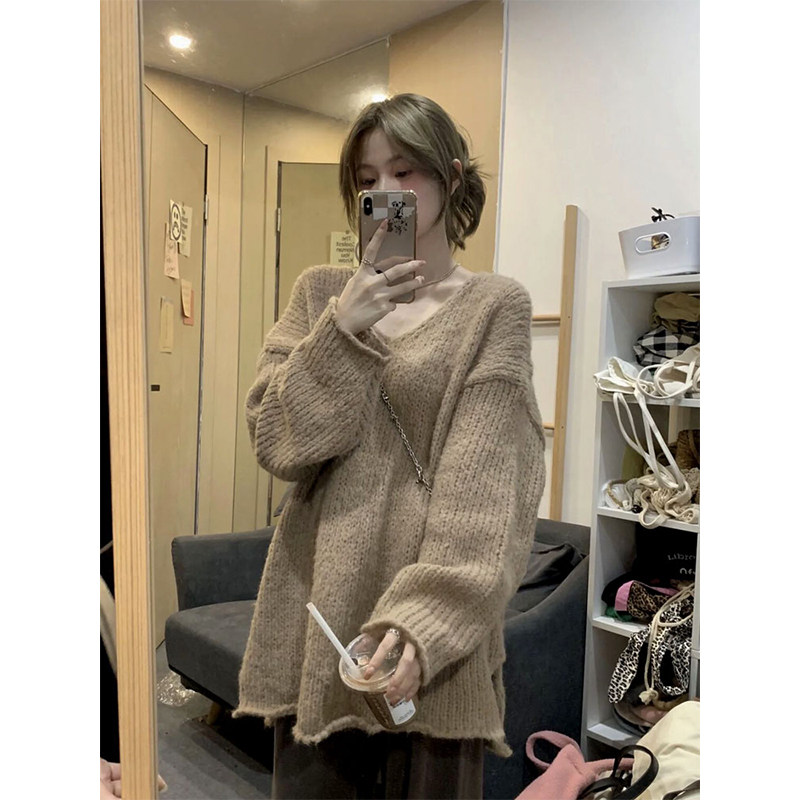 Цветной осенний трикотажный брендовый свитер, V-образный вырез, оверсайз