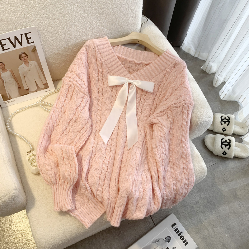 Розовый свитер, демисезонная трикотажная куртка с бантиком, свободный крой, V-образный вырез, изысканный стиль