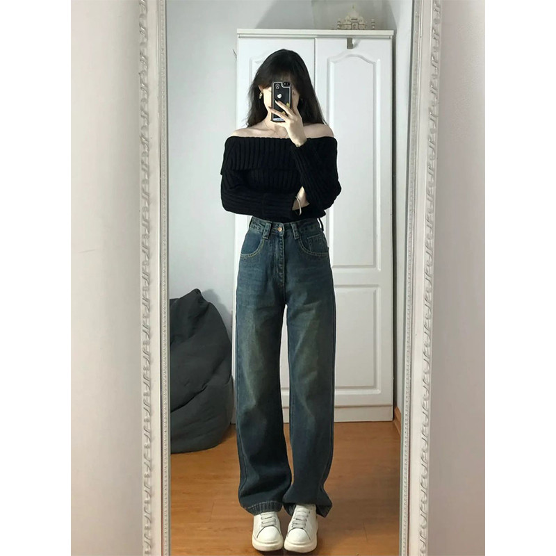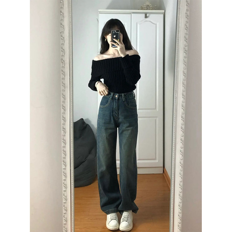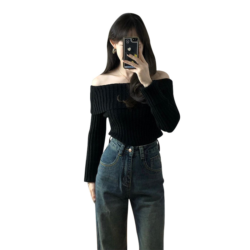 Осенний черный базовый трикотажный свитер, французский стиль, открытые плечи, коллекция 2023