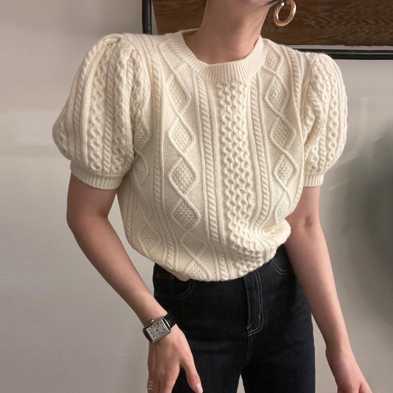 Ретро трикотажный демисезонный короткий свитер с круглым воротником, рукава фонарики, в западном стиле, подходит для подростков