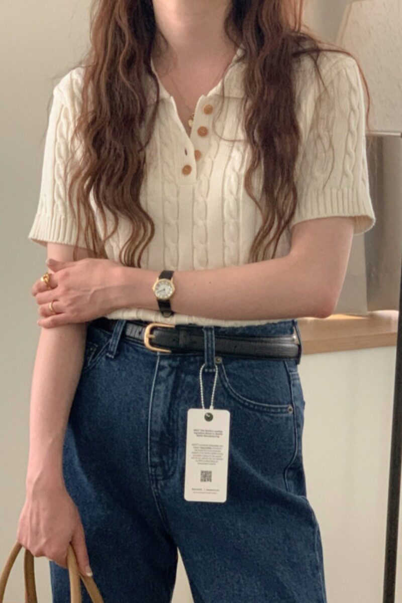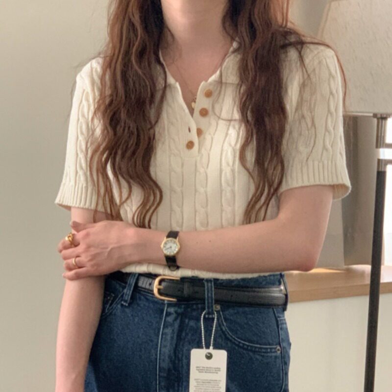 Летний тонкий трикотажный свитер, в корейском стиле, яркий броский стиль, воротник поло