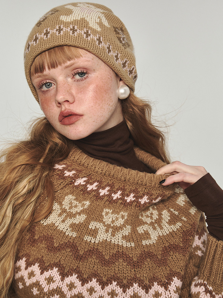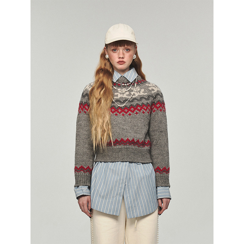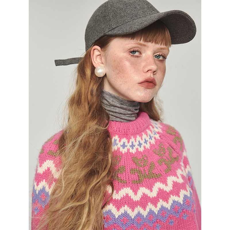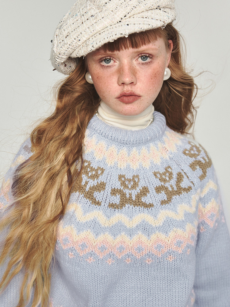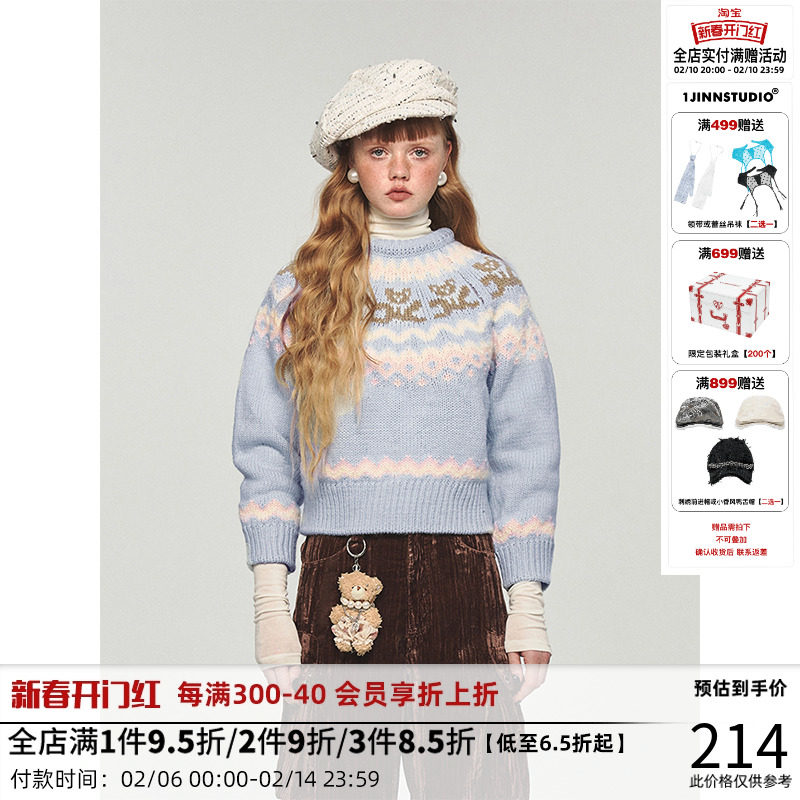 1JINN STUDIO Ретро демисезонный синий свитер с круглым воротником, с медвежатами, свободный крой