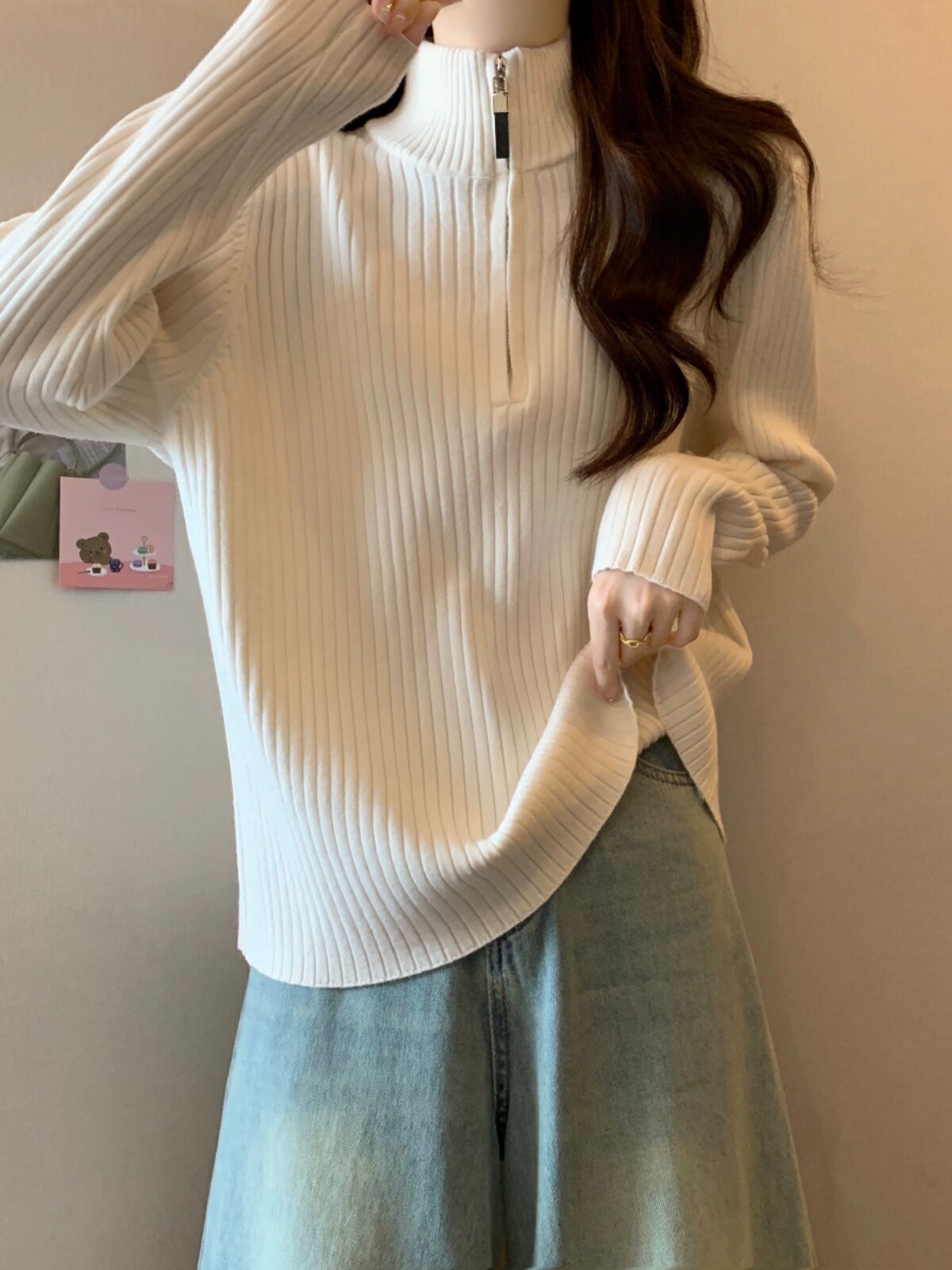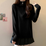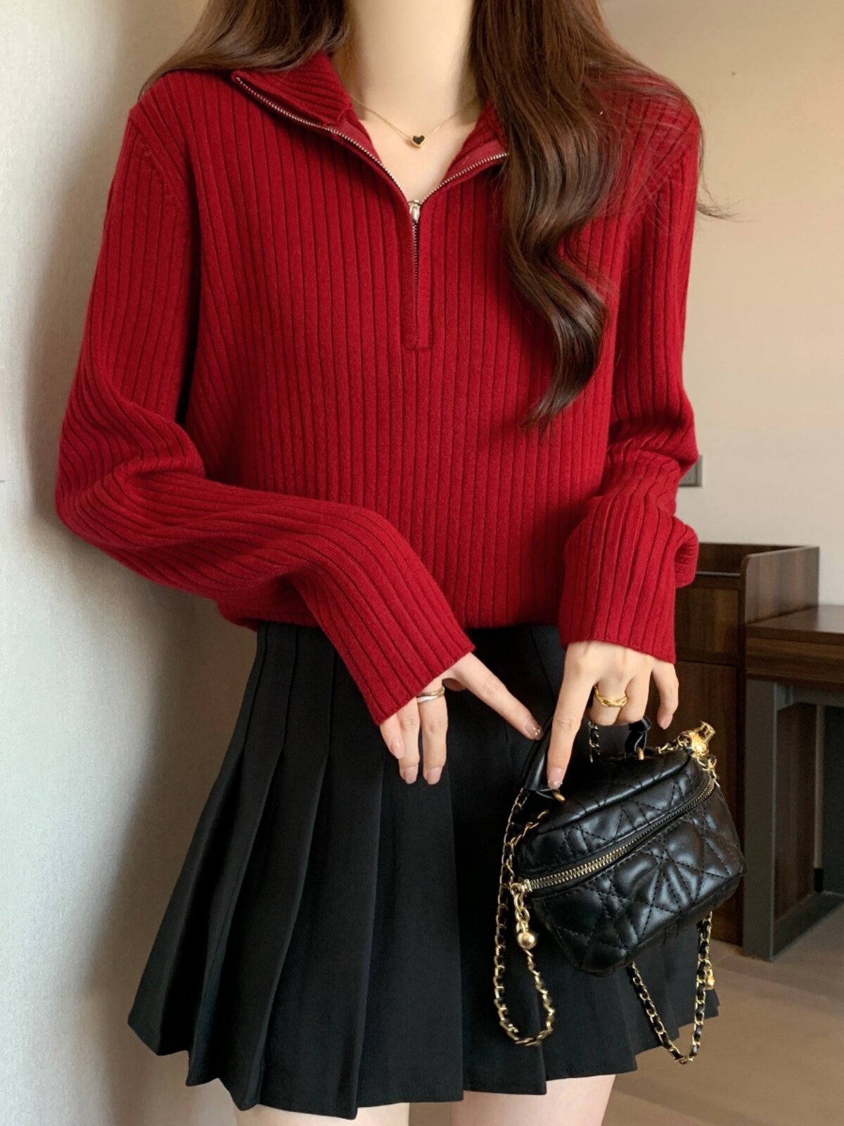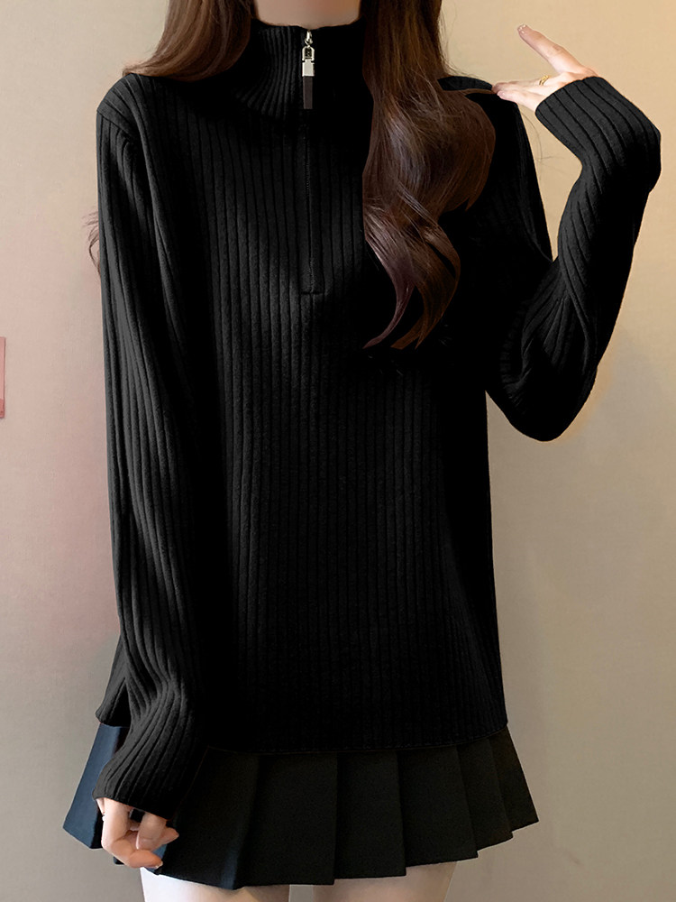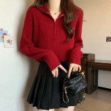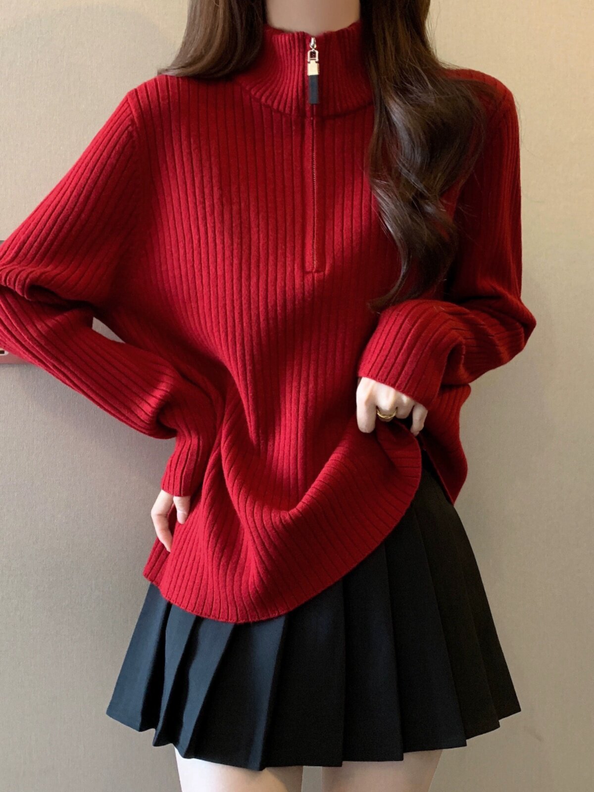 Красный цветной демисезонный трикотажный свитер с молнией, большой размер, высокий воротник, увеличенная толщина, свободный крой, на молнии