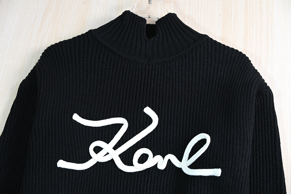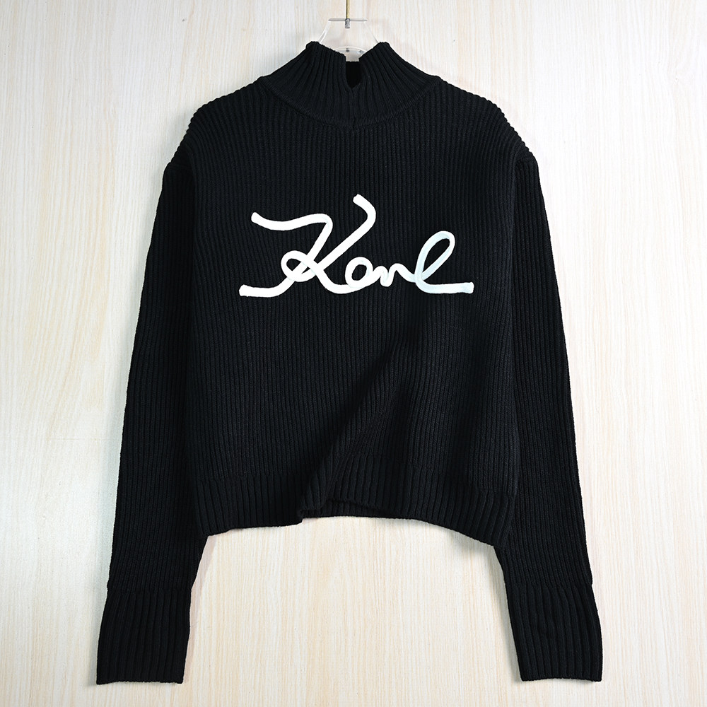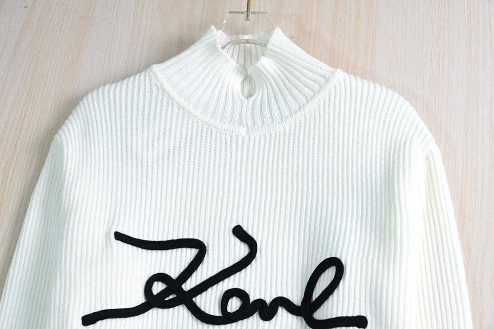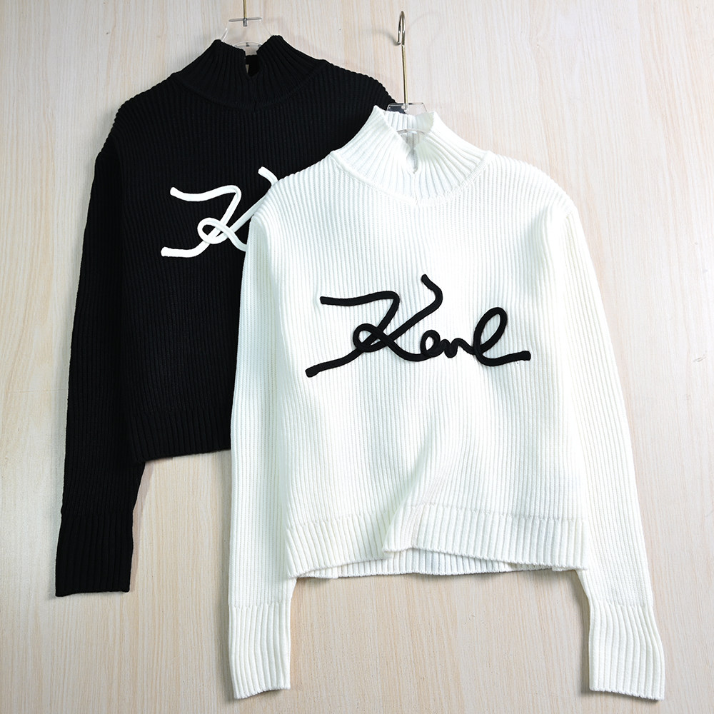 Воротник с высокой шеей + дизайн с длинным рукавом, черно -белая сплошная основа, украшение писем вышивки;
