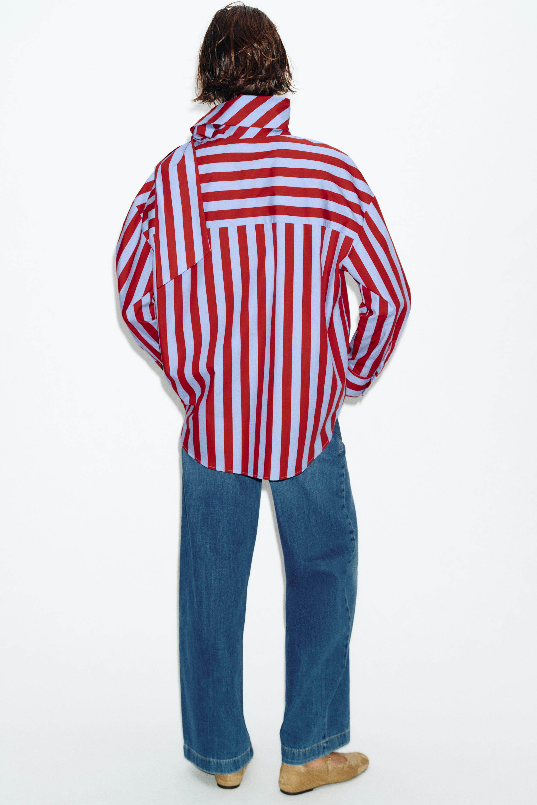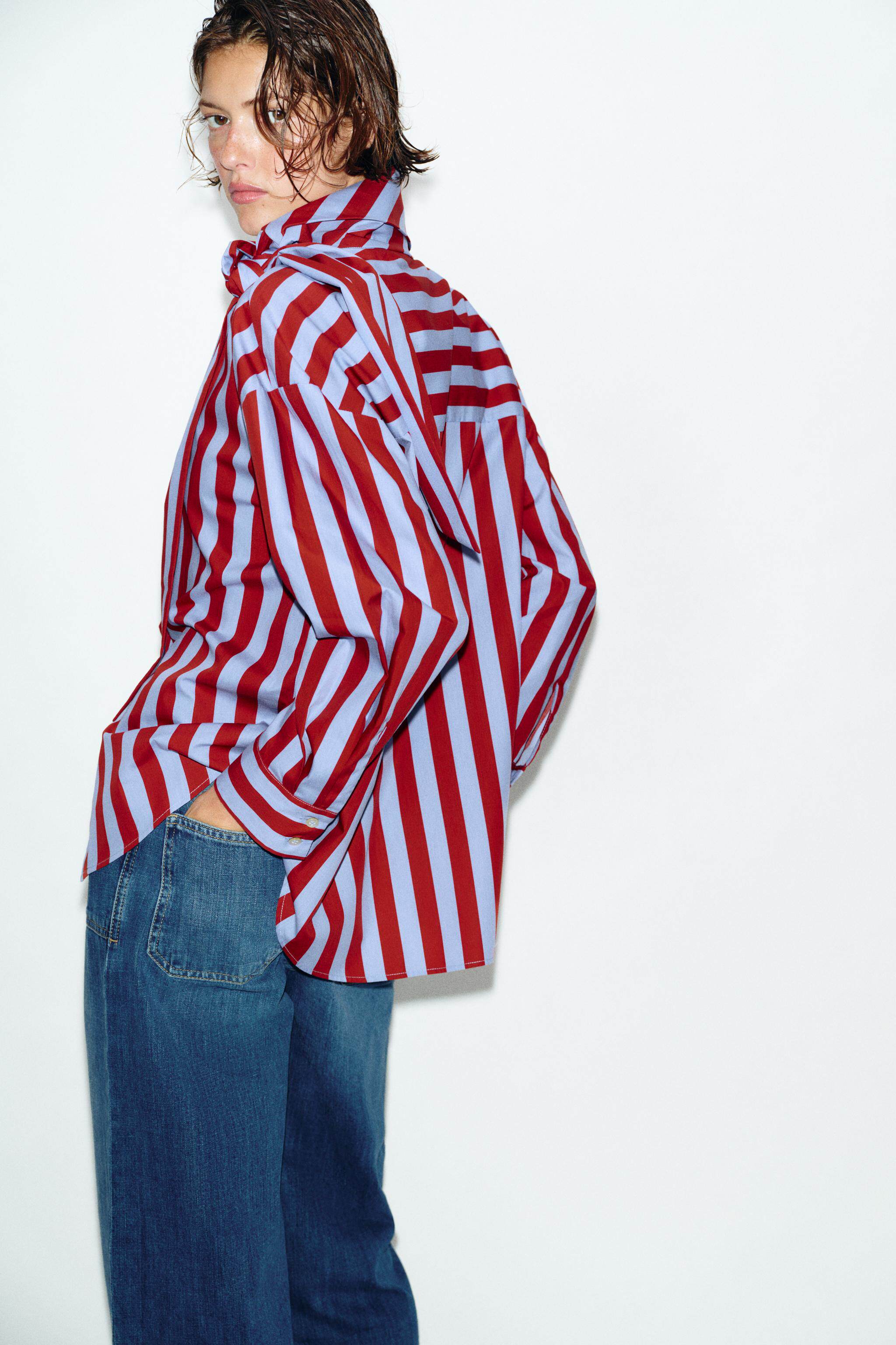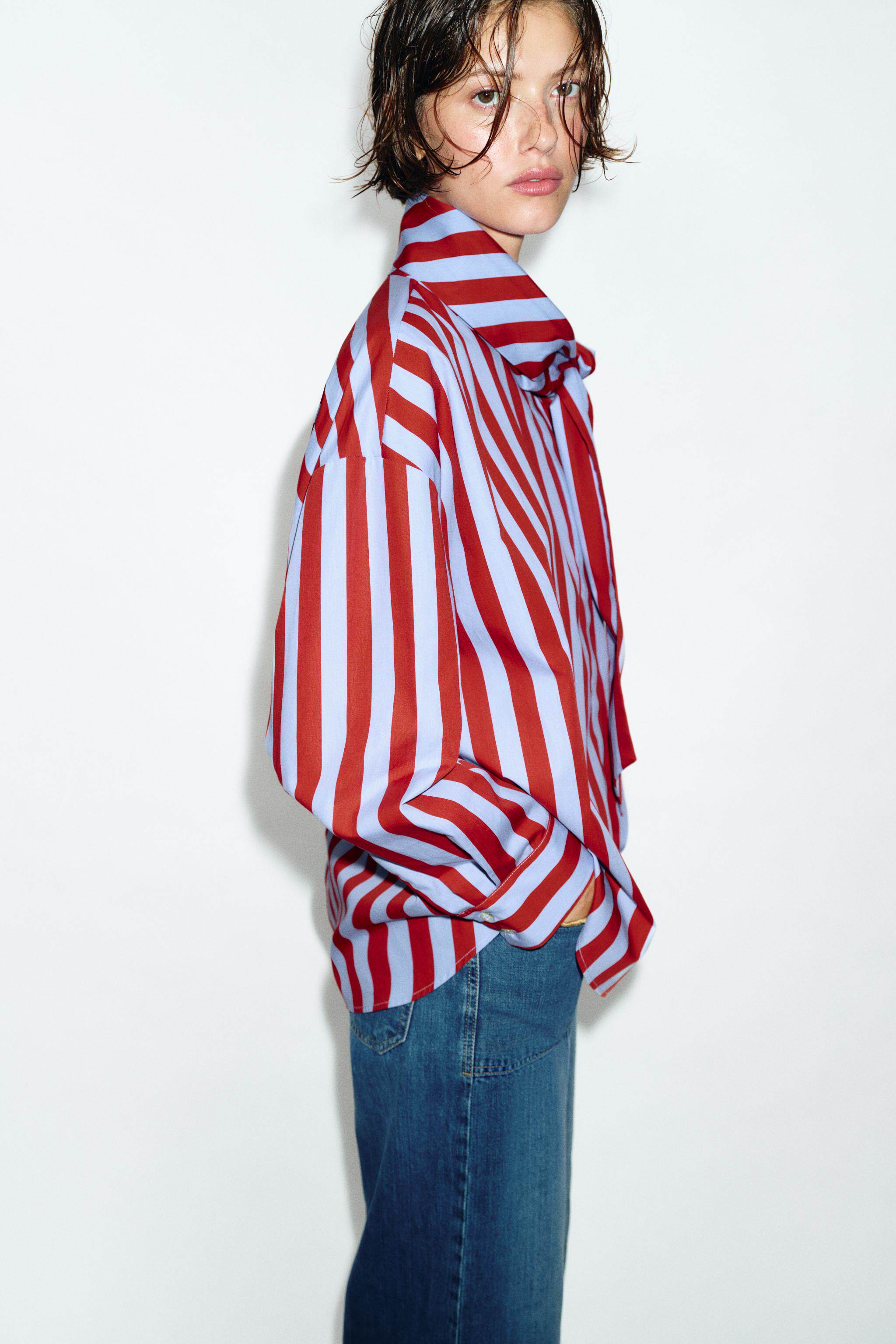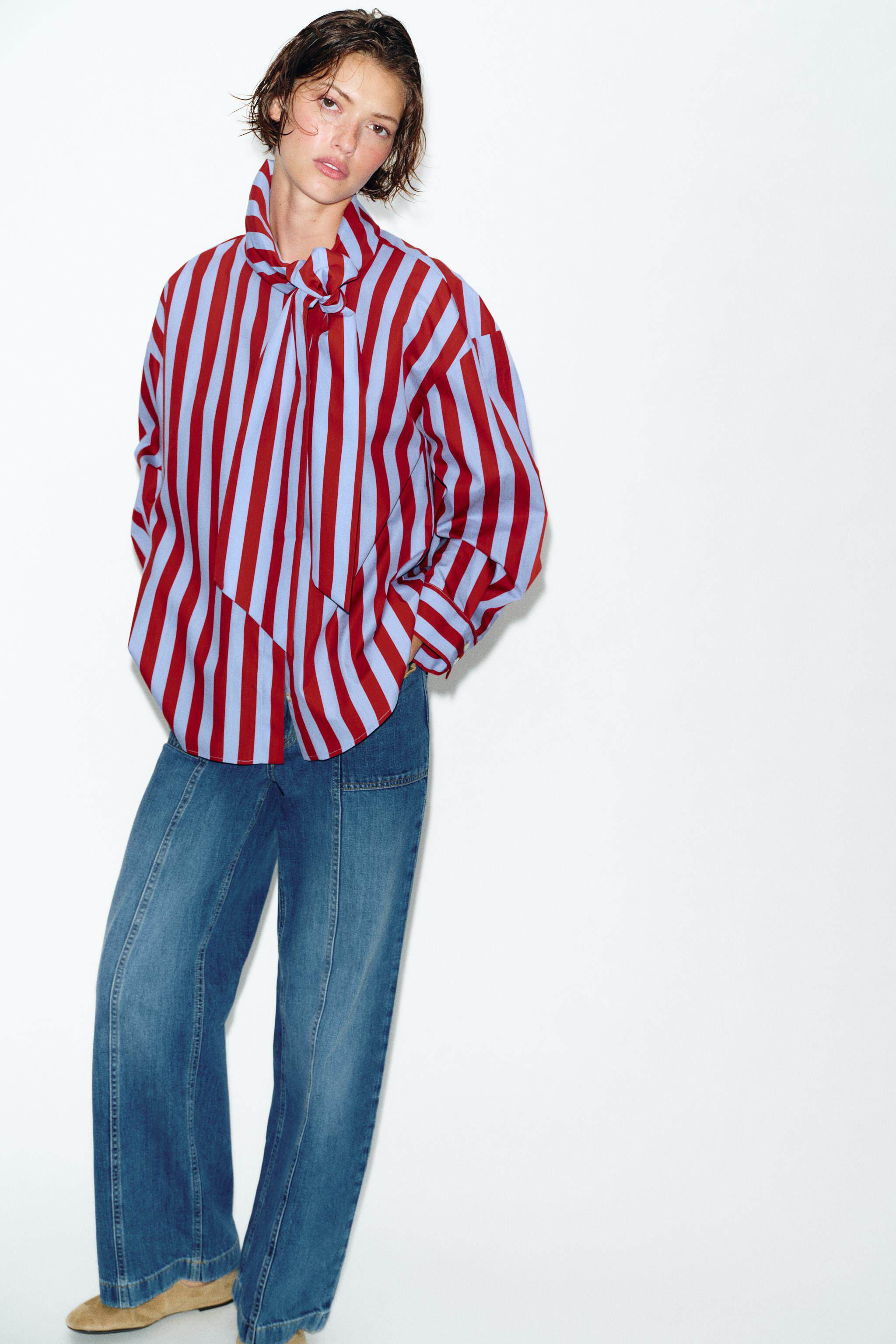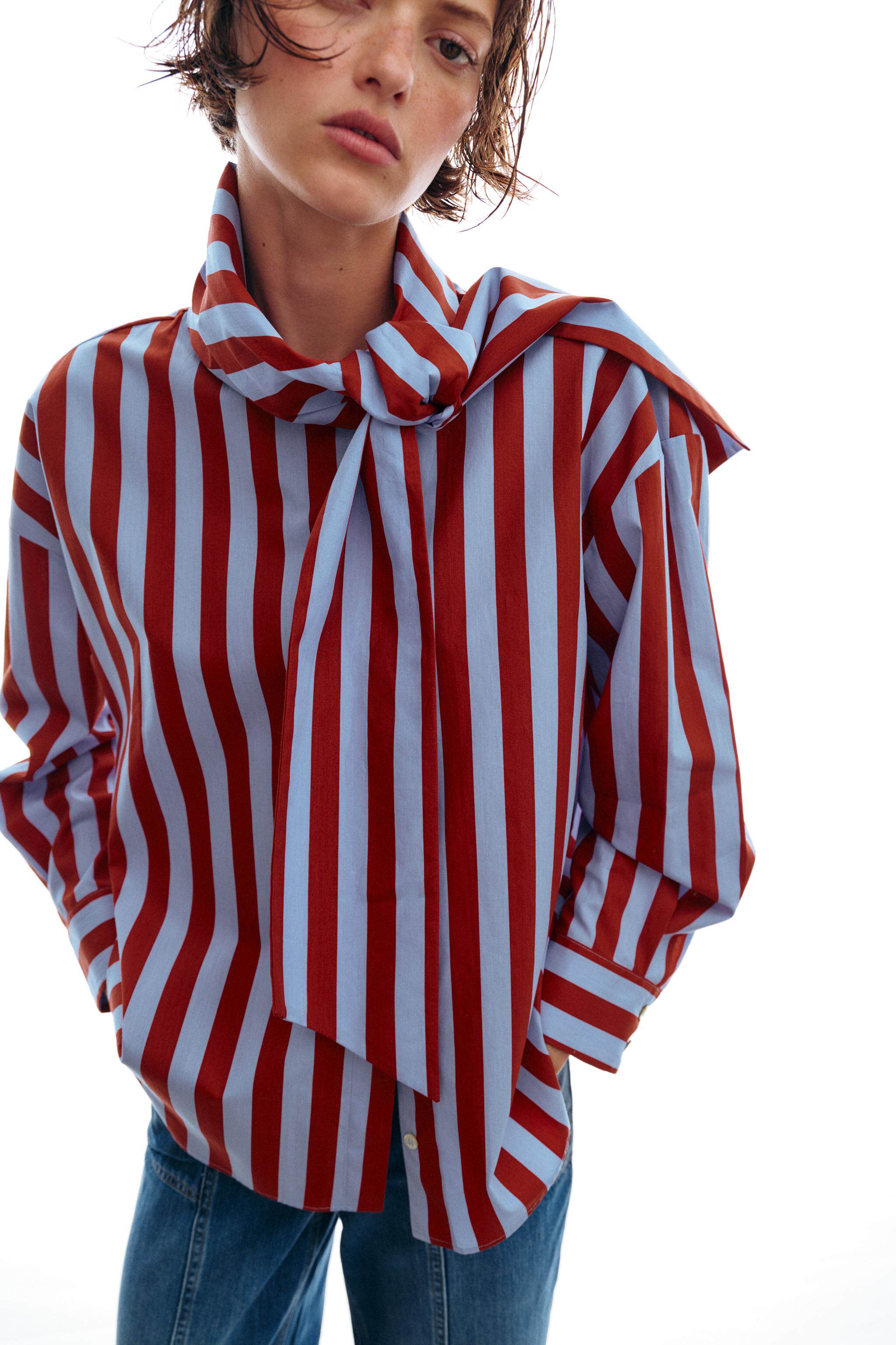 ZARA Новое поступление весны и лета 2026, женская рубашка в полоску с длинным рукавом и высоким воротником, украшенная бантом, 2390116 330