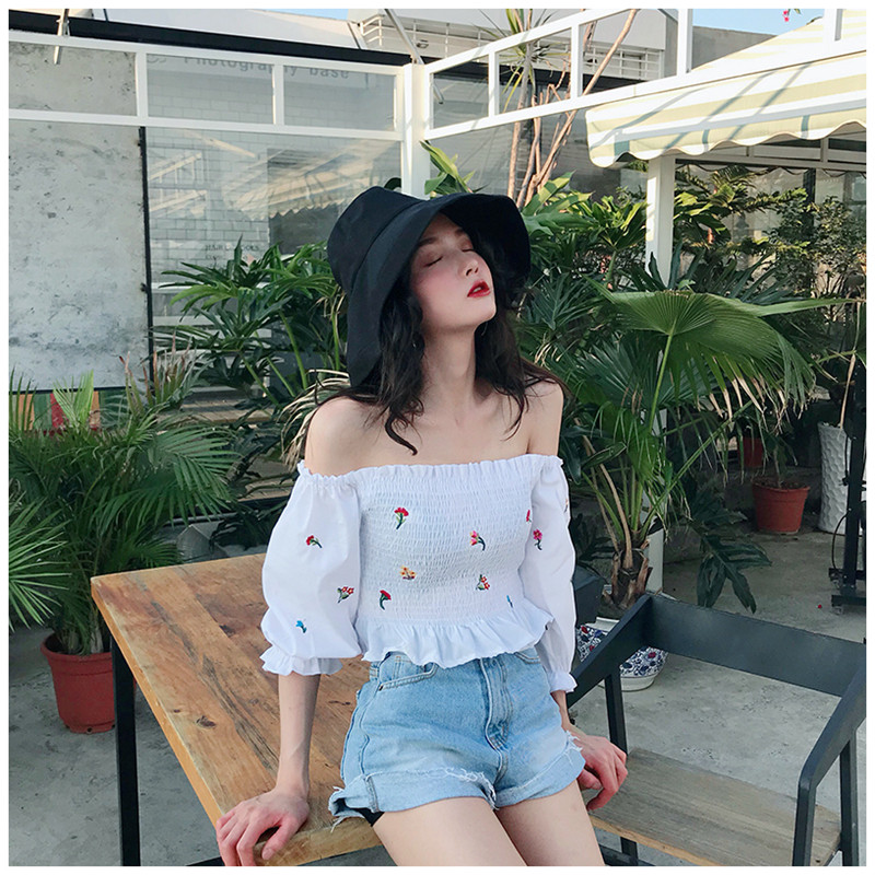 Весенняя рубашка, сексуальный короткий базовый фонарь, 2023, в корейском стиле, с вышивкой, открытые плечи