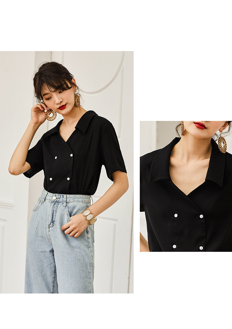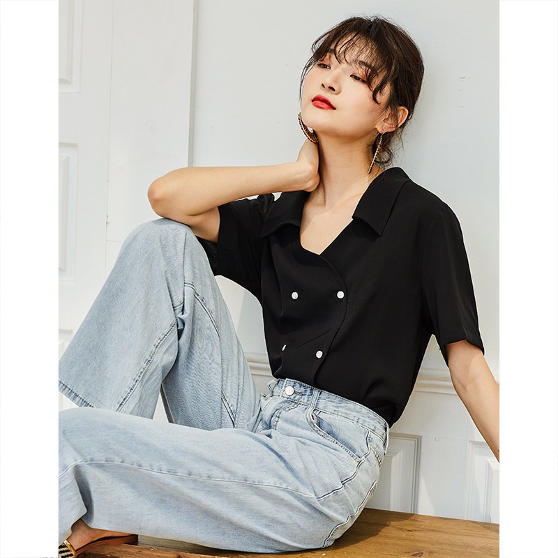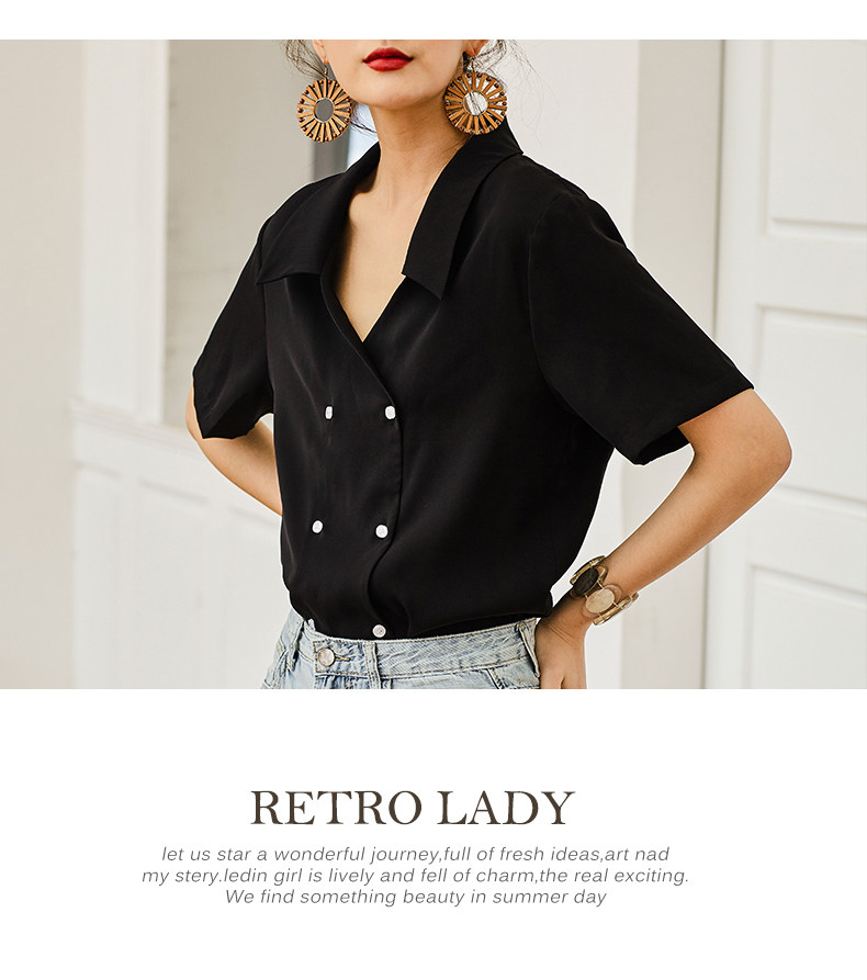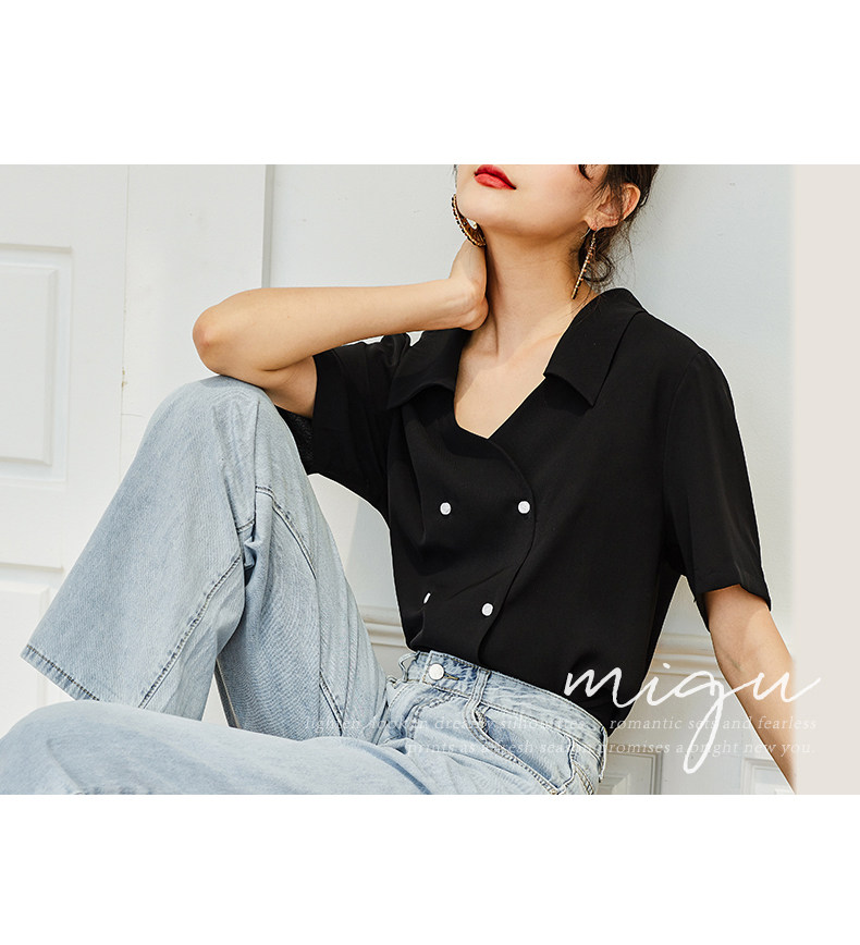 弥古 Черная ретро шифоновая приталенная рубашка, французский стиль, V-образный вырез, яркий броский стиль, короткий рукав