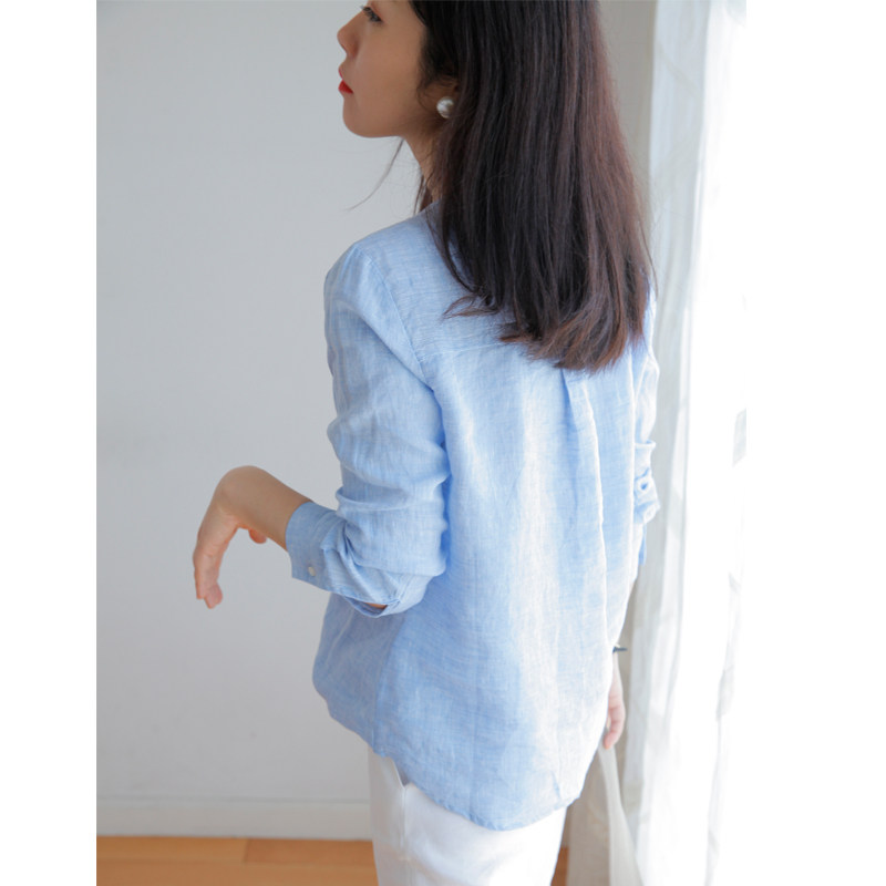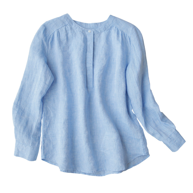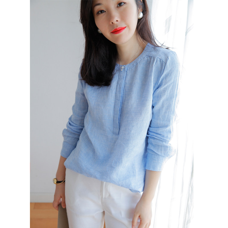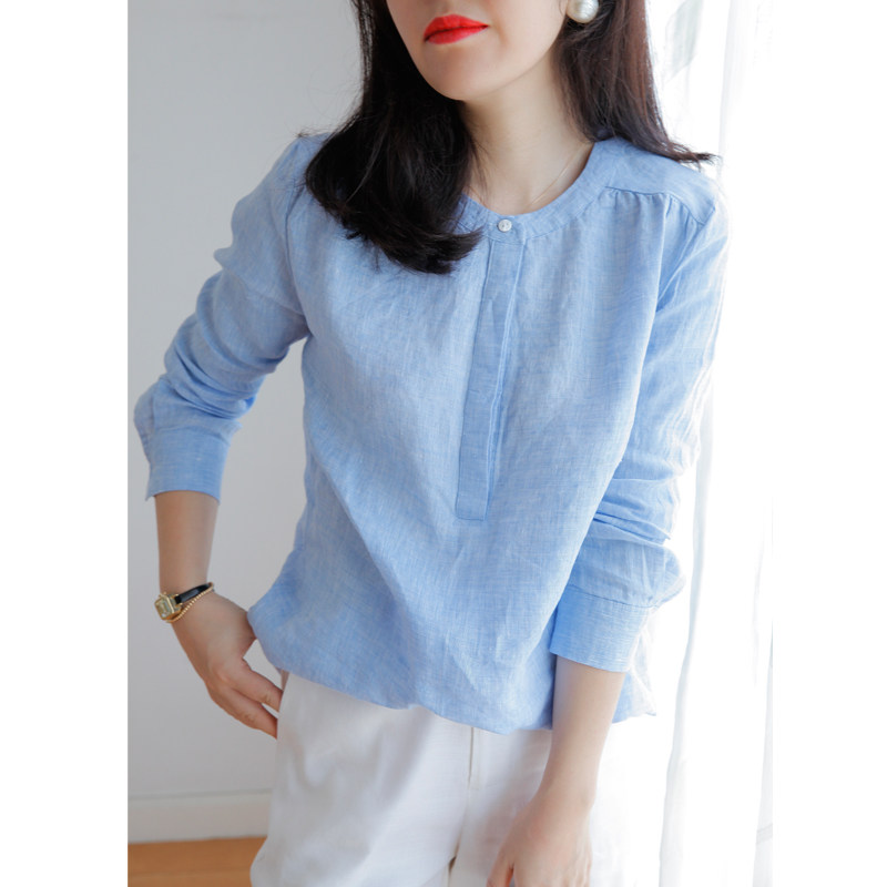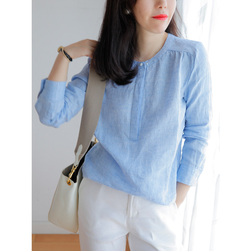 Синий лонгслив с круглым воротником, рубашка, французский стиль