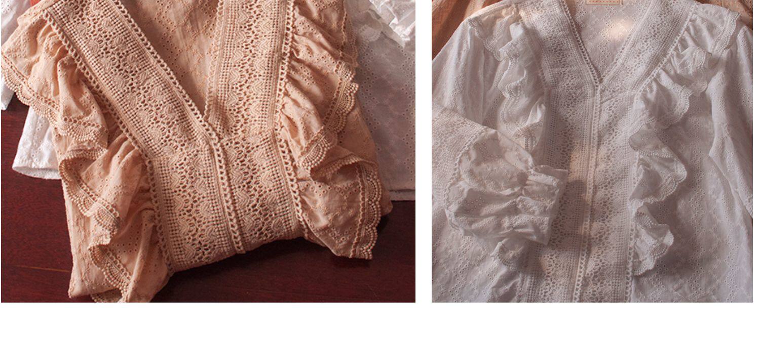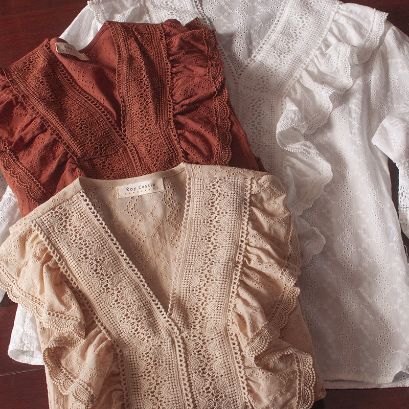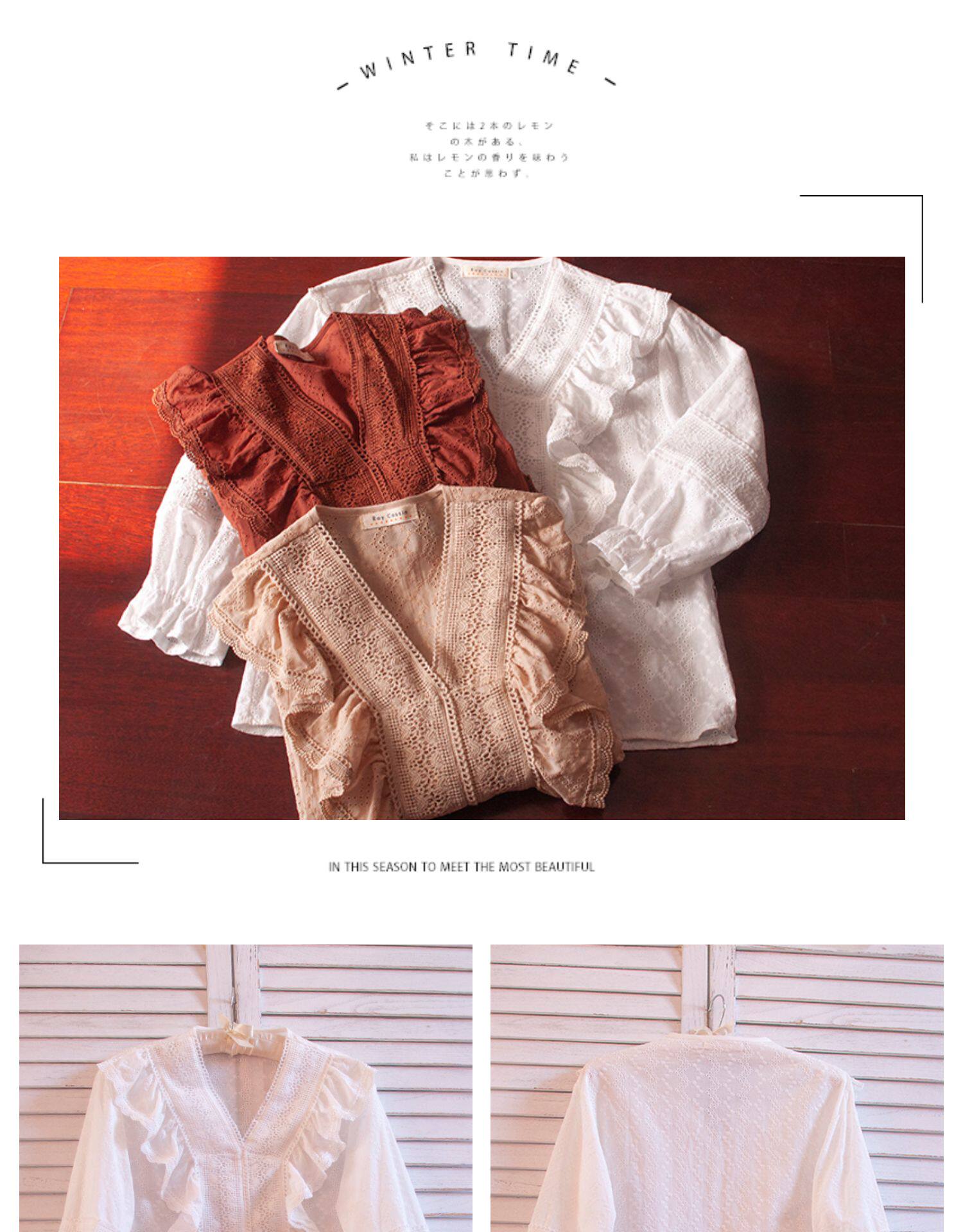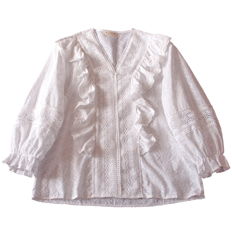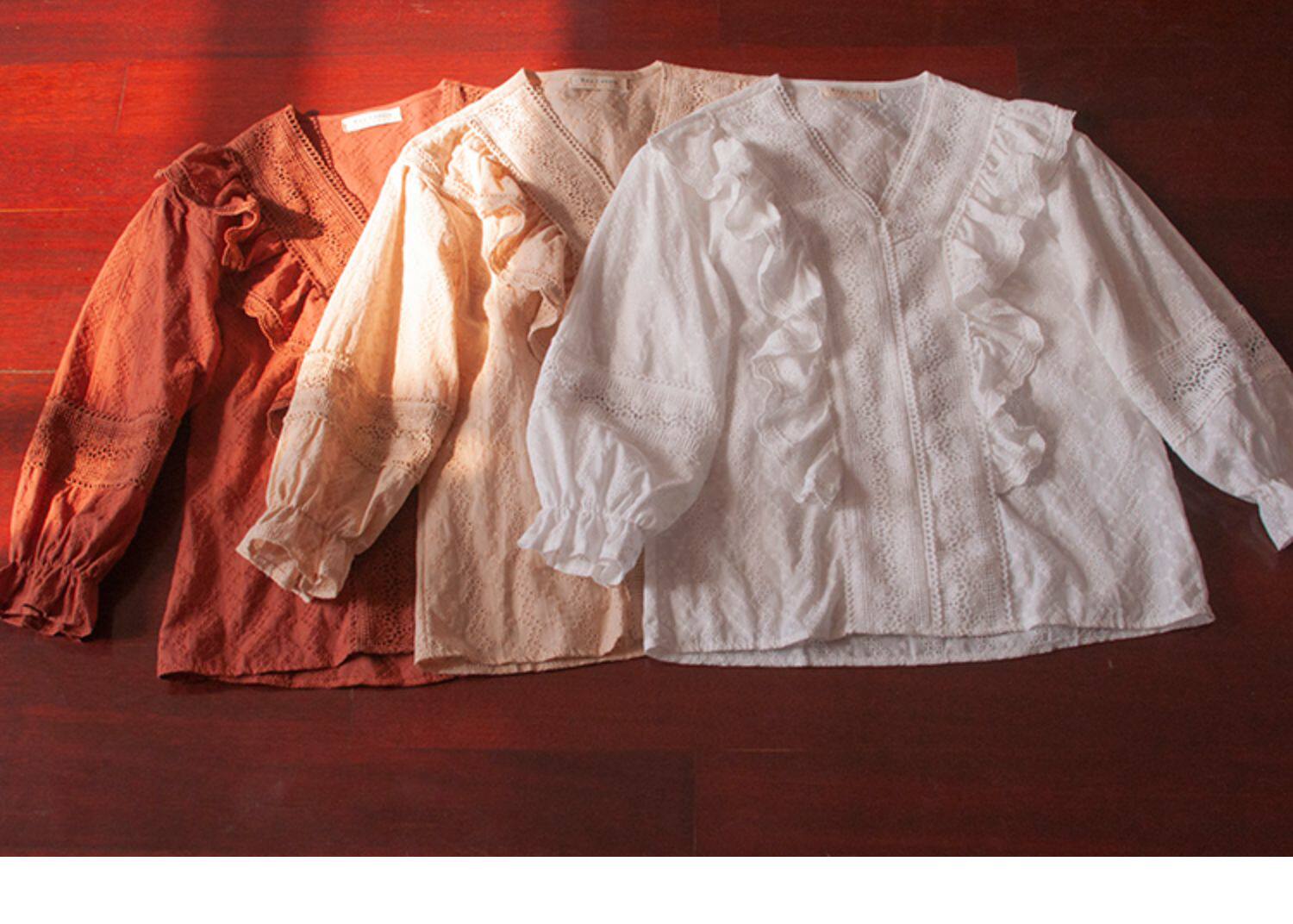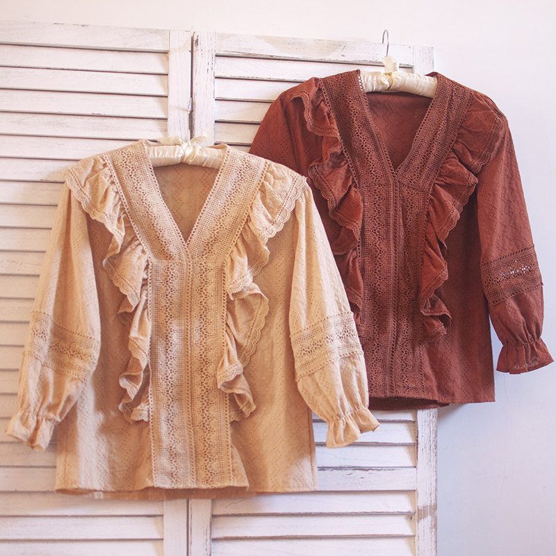 Ретро рубашка, весенний фонарь, Южная Корея, с вышивкой, V-образный вырез, 2023, новая коллекция