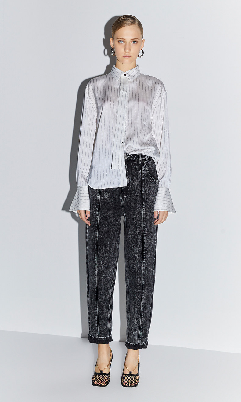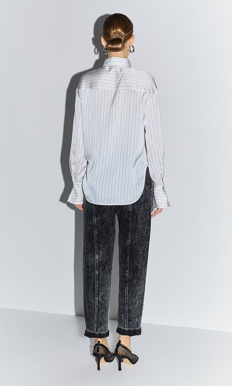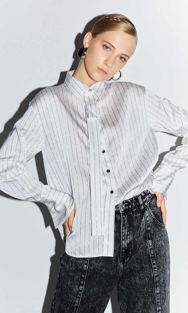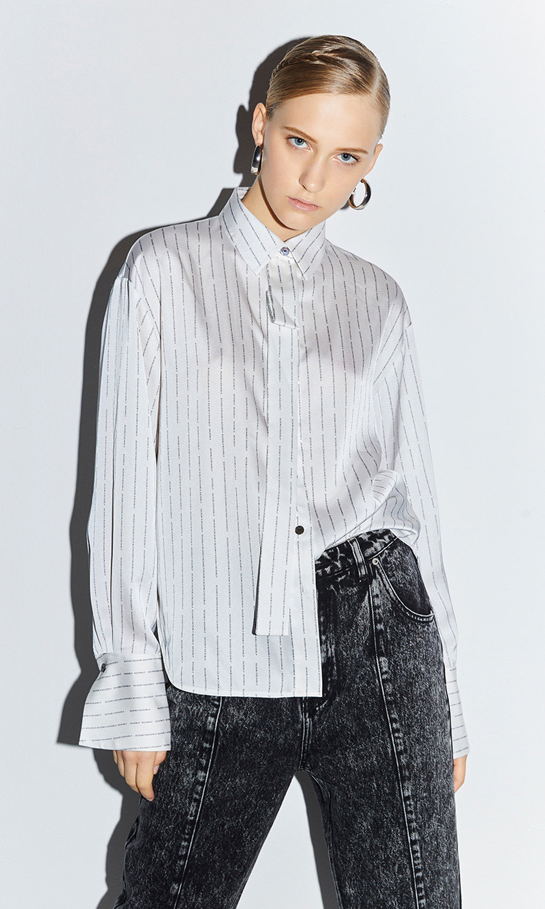 [ 字母条纹式印花演绎出现代潮流,光泽感面料凸显出不凡的高级感。]