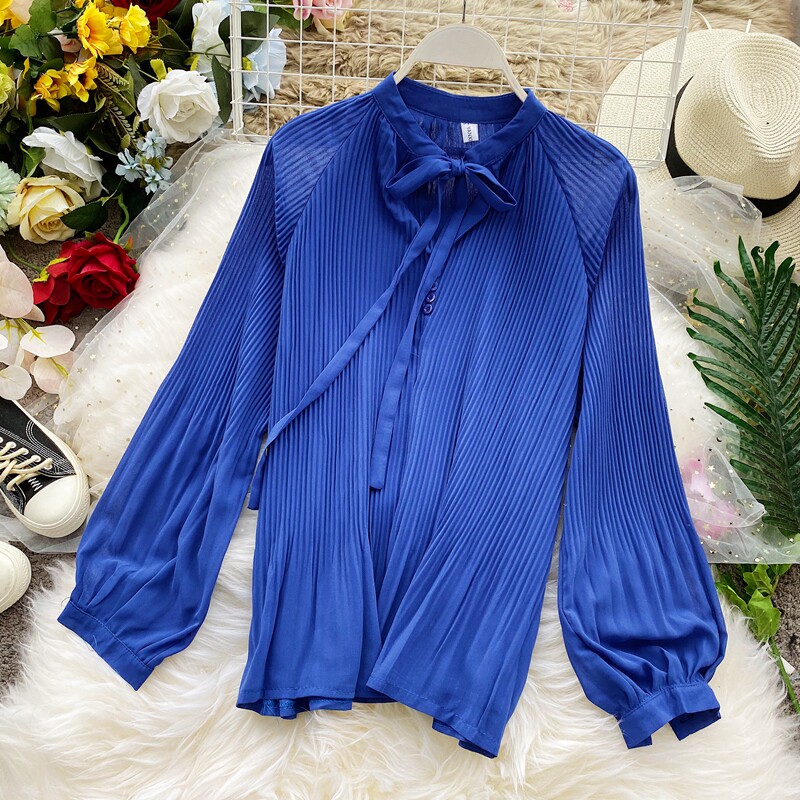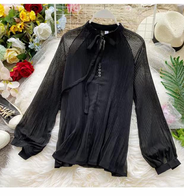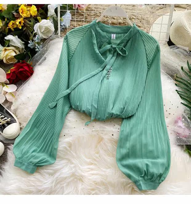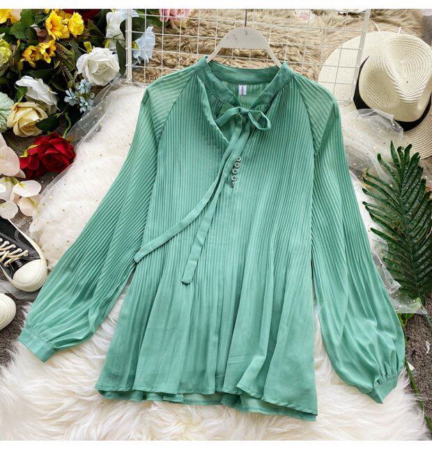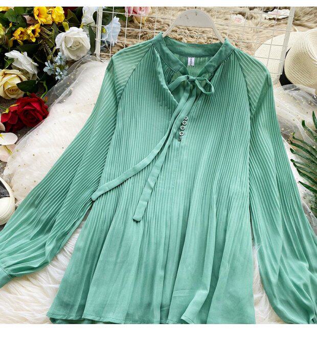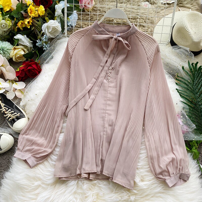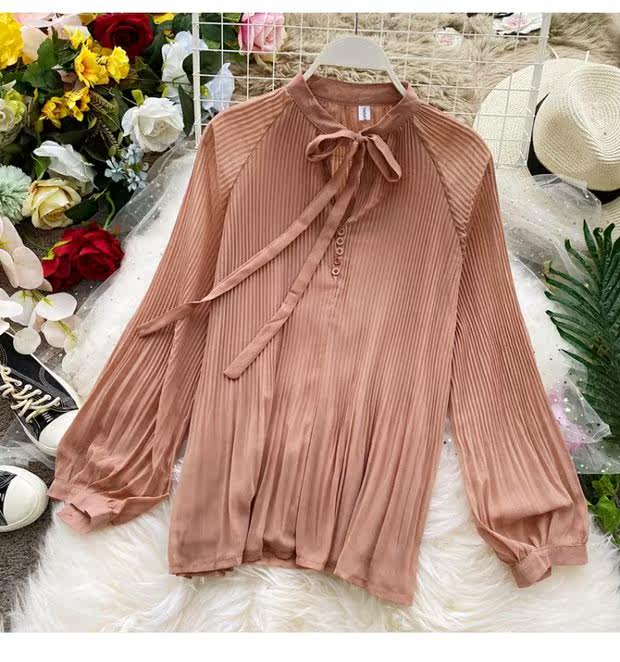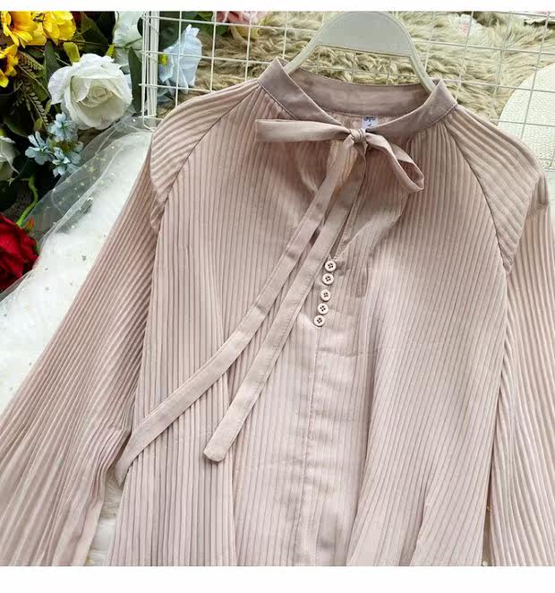 Осенний шифоновый лонгслив с бантиком, ретро фонарь, футболка, коллекция 2021, в корейском стиле, французский стиль