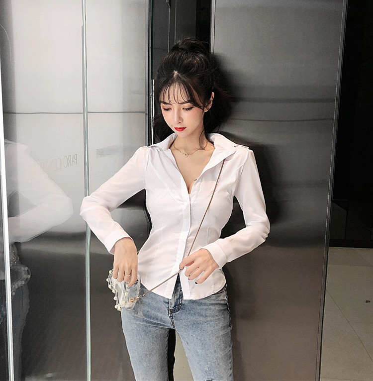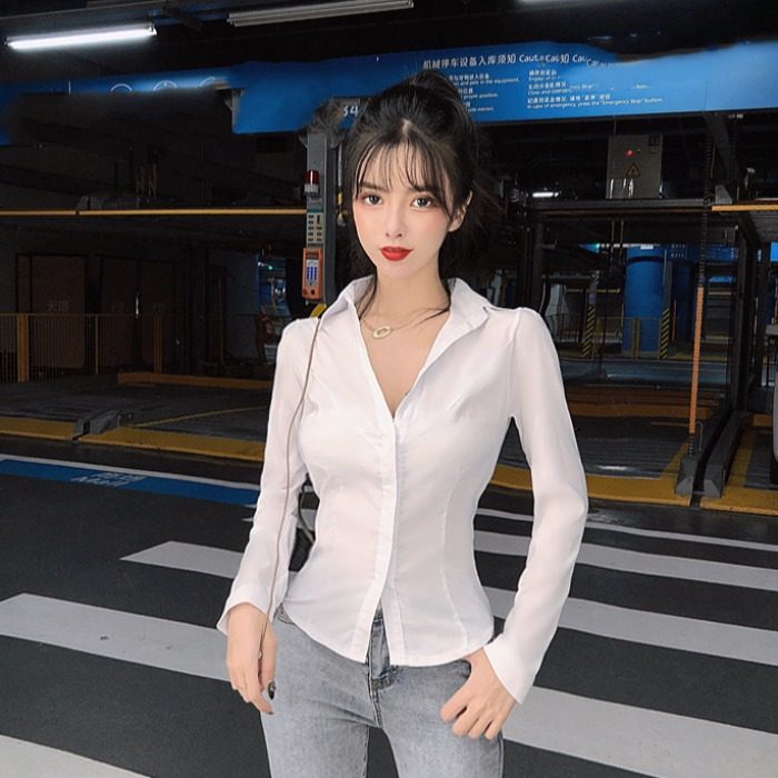 Дизайнерская весенняя сексуальная рубашка, тренд сезона, V-образный вырез, в обтяжку, облегающий крой