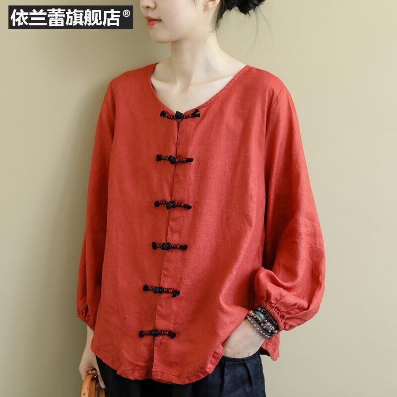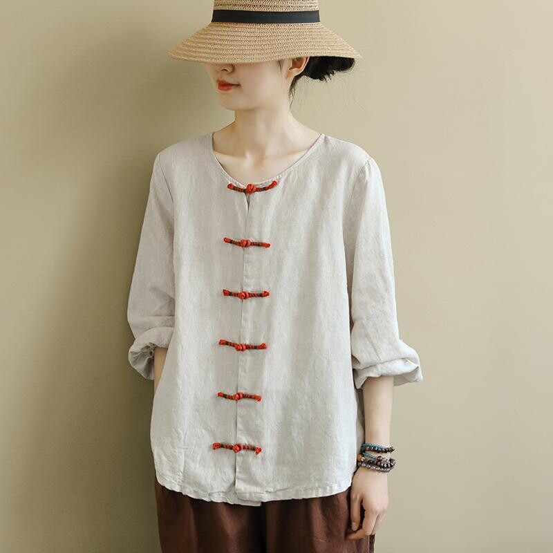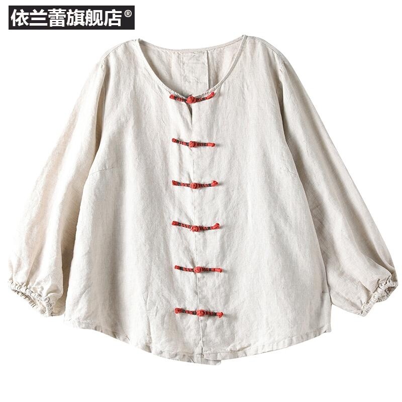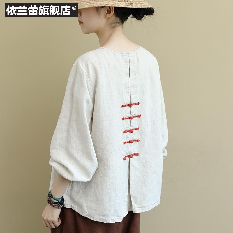 Этническая ретро осенняя рубашка, этнический стиль, свободный крой, из хлопка и льна