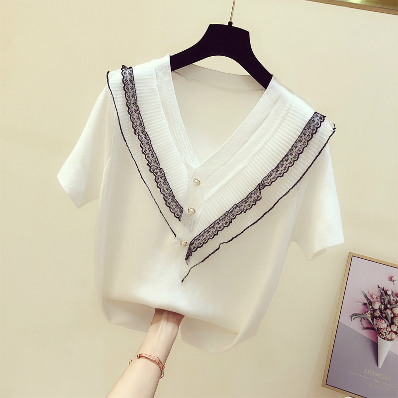 Трикотажный свитер, летняя модная футболка с коротким рукавом, коллекция 2023, V-образный вырез, высокий воротник, свободный крой