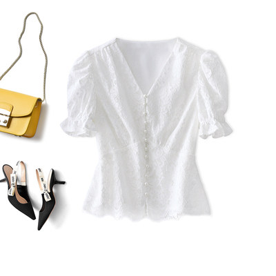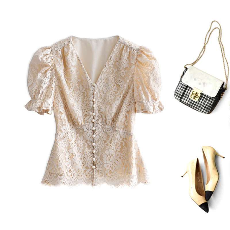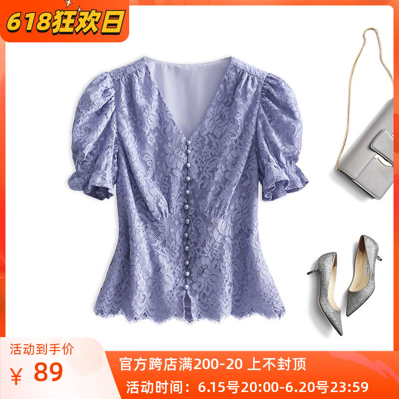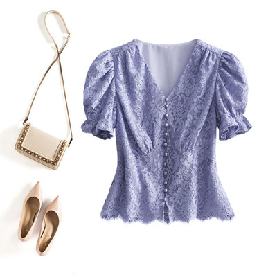 Приталенный ретро кружевной короткий корсет, сиреневая рубашка, V-образный вырез, рукава фонарики, короткий рукав