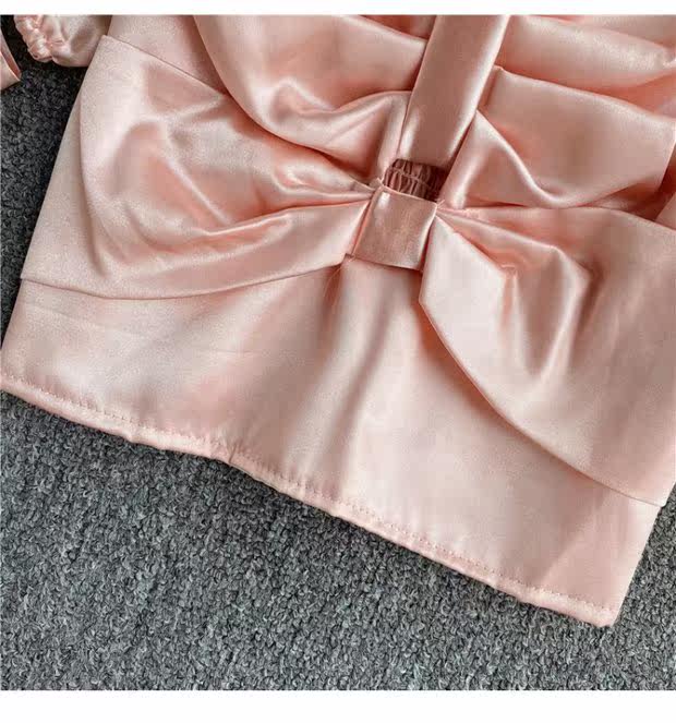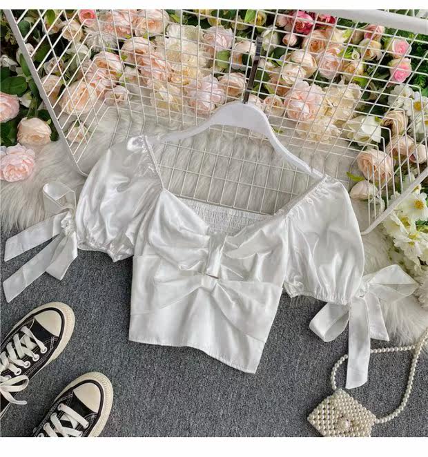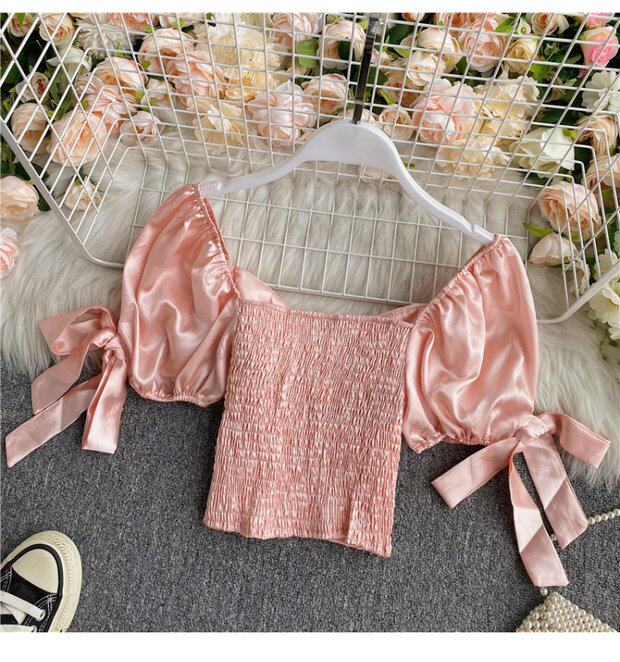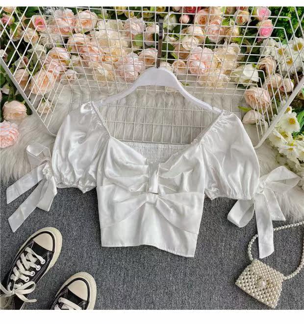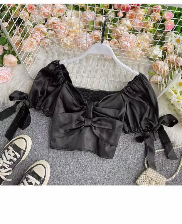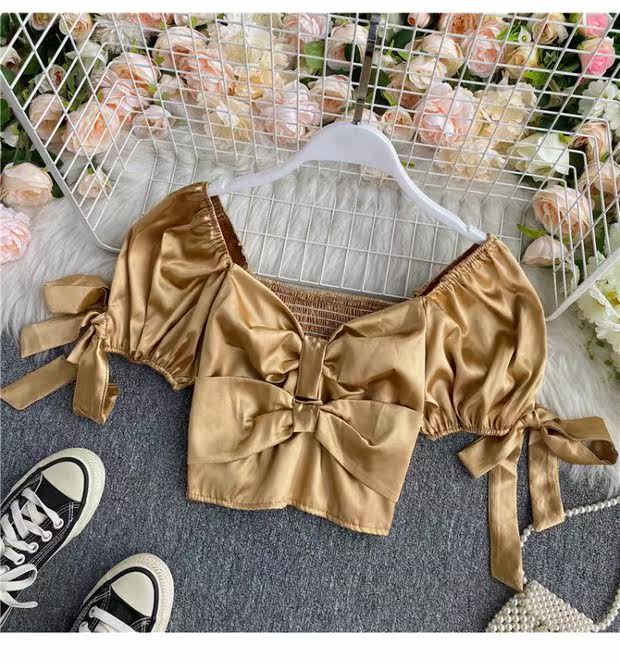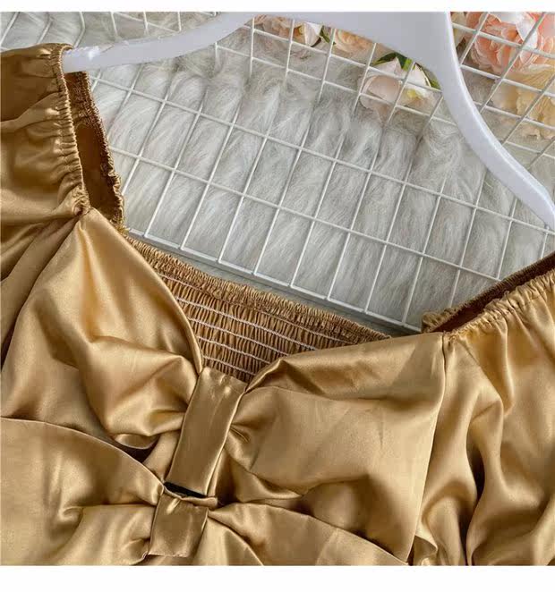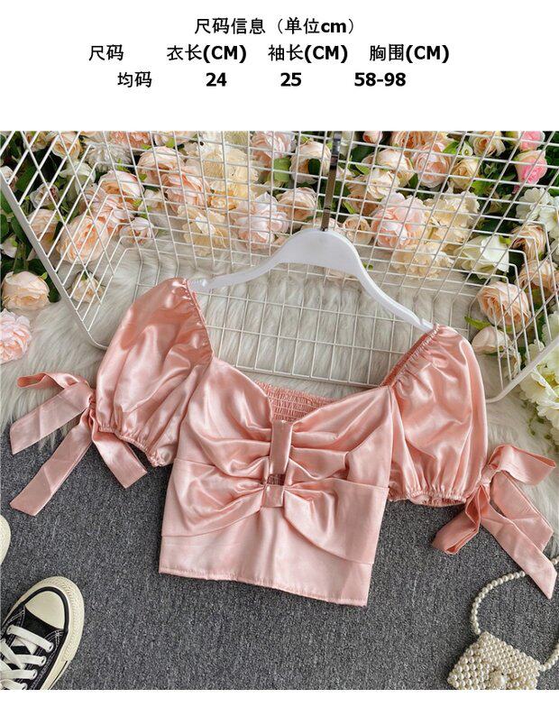 Шелковистая ретро дизайнерская короткая рубашка, квадратный вырез, рукава фонарики, французский стиль, тренд сезона