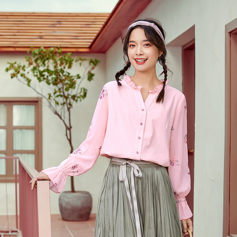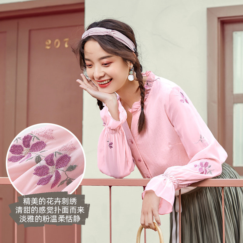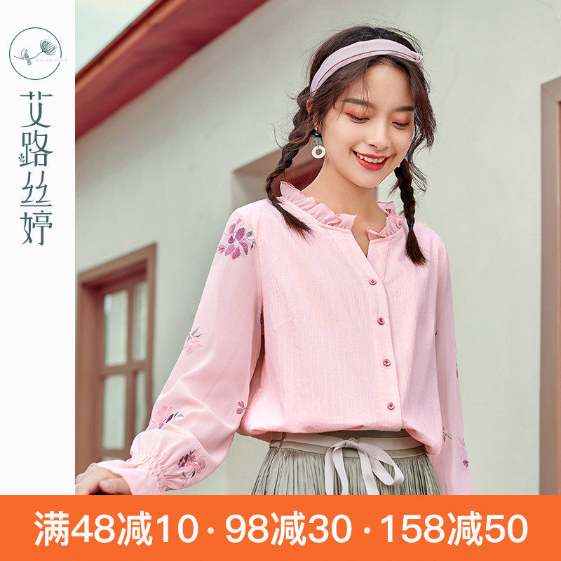 艾路丝婷 Хлопковая весенняя рубашка, фонарь, с вышивкой, коллекция 2021, новая коллекция, оверсайз
