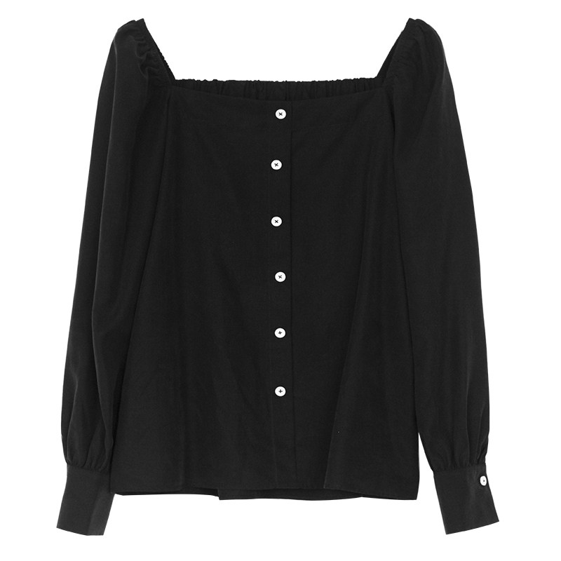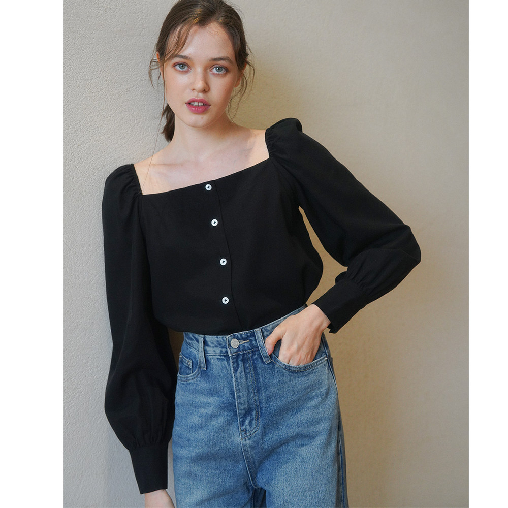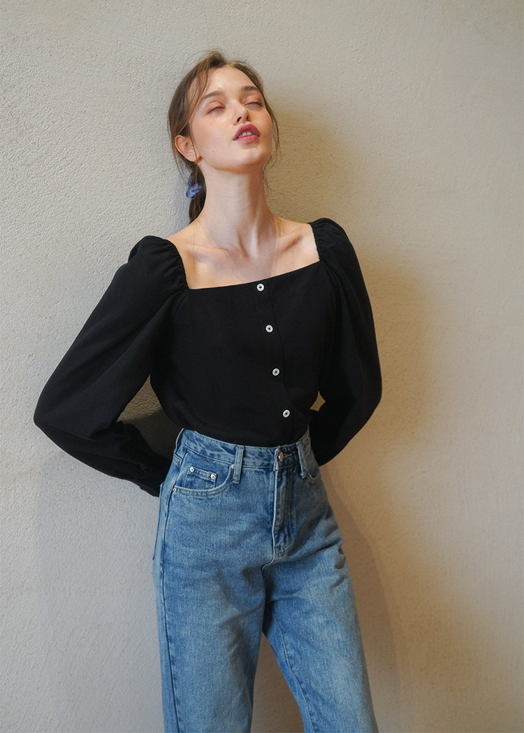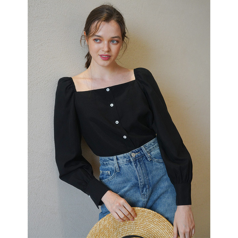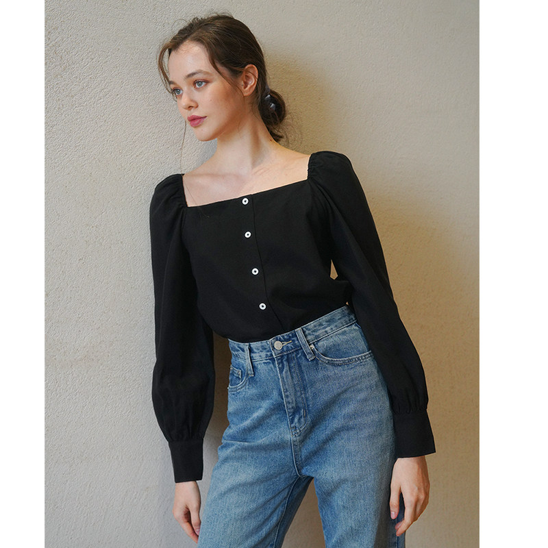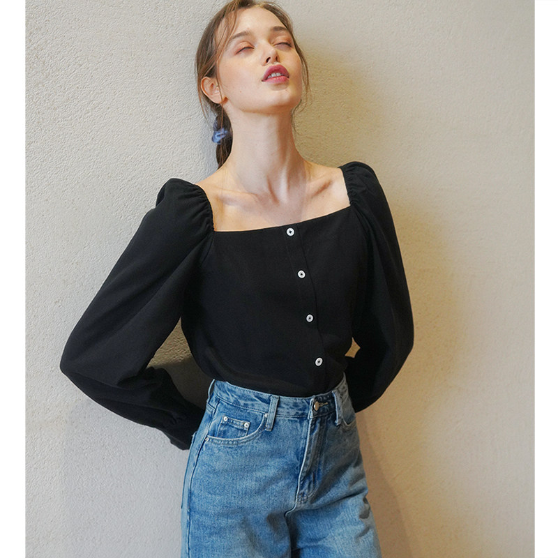 Ретро футболка, осенняя рубашка, французский стиль, квадратный вырез, рукава фонарики, в корейском стиле